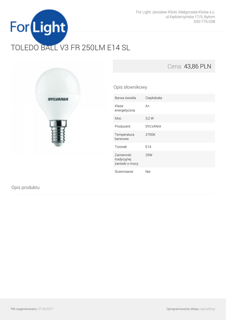 For Light Jarosław Klicki, Małgorzata Klicka s.c. ul.Kędzierzyńska 17/5, Bytom 530-776-038 TOLEDO BALL V3 FR 250LM E14 SL Cena: 43,86 PLN Opis słownikowy Barwa światła Ciepłobiała Klasa energetyczna A+ Moc 3,2 W Producent SYLVANIA Temperatura barwowa 2700K Trzonek E14 Zamienniki tradycyjnej żarówki o mocy 25W Ściemnianie Nie Opis produktu Plik wygenerowano: 07-03-2017 Powered by TCPDF (www.tcpdf.org) Oprogramowanie sklepu: AptusShop