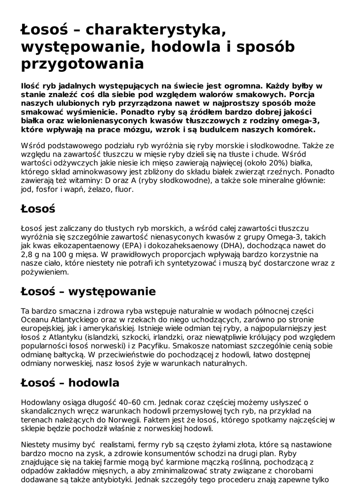 Łosoś – charakterystyka, występowanie, hodowla i sposób przygotowania Ilość ryb jadalnych występujących na świecie jest ogromna. Każdy byłby w stanie znaleźć coś dla siebie pod względem walorów smakowych. Porcja naszych ulubionych ryb przyrządzona nawet w najprostszy sposób może smakować wyśmienicie. Ponadto ryby są źródłem bardzo dobrej jakości białka oraz wielonienasyconych kwasów tłuszczowych z rodziny omega-3, które wpływają na prace mózgu, wzrok i są budulcem naszych komórek. Wśród podstawowego podziału ryb wyróżnia się ryby morskie i słodkowodne. Także ze względu na zawartość tłuszczu w mięsie ryby dzieli się na tłuste i chude. Wśród wartości odżywczych jakie niesie ich mięso zawierają najwięcej (około 20%) białka, którego skład aminokwasowy jest zbliżony do składu białek zwierząt rzeźnych. Ponadto zawierają też witaminy: D oraz A (ryby słodkowodne), a także sole mineralne głównie: jod, fosfor i wapń, żelazo, fluor. Łosoś Łosoś jest zaliczany do tłustych ryb morskich, a wśród całej zawartości tłuszczu wyróżnia się szczególnie zawartość nienasyconych kwasów z grupy Omega-3, takich jak kwas eikozapentaenowy (EPA) i dokozaheksaenowy (DHA), dochodząca nawet do 2,8 g na 100 g mięsa. W prawidłowych proporcjach wpływają bardzo korzystnie na nasze ciało, które niestety nie potrafi ich syntetyzować i muszą być dostarczone wraz z pożywieniem. Łosoś – występowanie Ta bardzo smaczna i zdrowa ryba wstępuje naturalnie w wodach północnej części Oceanu Atlantyckiego oraz w rzekach do niego uchodzących, zarówno po stronie europejskiej, jak i amerykańskiej. Istnieje wiele odmian tej ryby, a najpopularniejszy jest łosoś z Atlantyku (islandzki, szkocki, irlandzki, oraz niewątpliwie królujący pod względem popularności łosoś norweski) i z Pacyfiku. Smakosze natomiast szczególnie cenią sobie odmianę bałtycką. W przeciwieństwie do pochodzącej z hodowli, łatwo dostępnej odmiany norweskiej, nasz łosoś żyje w warunkach naturalnych. Łosoś – hodowla Hodowlany osiąga długość 40–60 cm. Jednak coraz częściej możemy usłyszeć o skandalicznych wręcz warunkach hodowli przemysłowej tych ryb, na przykład na terenach należących do Norwegii. Faktem jest że łosoś, którego spotkamy najczęściej w sklepie będzie pochodził właśnie z norweskiej hodowli. Niestety musimy być realistami, fermy ryb są często żyłami złota, które są nastawione bardzo mocno na zysk, a zdrowie konsumentów schodzi na drugi plan. Ryby znajdujące się na takiej farmie mogą być karmione mączką roślinną, pochodzącą z odpadów zakładów mięsnych, a aby zminimalizować straty związane z chorobami dodawane są także antybiotyki. Jednak szczegóły tego procederu znają zapewne tylko hodowcy, a osoby zainteresowane tematem dzielą się na unikające ryb hodowlanych oraz ich zwolenników, którzy zdają się nie przejmować możliwym zagrożeniem. Warto jest jednak zachować pewną rozwagę, jednocześnie nie zapominając walorach zdrowotnych i smakowych prawidłowo wyhodowanych osobników. Łosoś dziko występujący jest niestety rybą bardzo drogą oraz niedostępną na szerszą skalę w rodzimych sklepach. Jego wygląd jest nieco mniej apetyczny przez blady kolor oraz mniejsze rozmiary. Cechy jakimi powinniśmy kierować się podczas zakupu tej nie najtańszej ryby powinny być znane przynajmniej w minimalny sposób przez każdego smakosza ryb, aby nie wyrzucić pieniędzy na marne. Podstawowe charakterystyczne walory świadczące o dobrej jakości i świeżości tego produktu w sklepie to: zapach: niedrażniący, świeży, morski, oczy: klarowne, jasne, niezapadnięte bez efektu zamglenia, skóra: jasna, błyszcząca, podczas zginania lekko ryby nie powinny powstawać na niej zmarszczki, bez żadnych uszkodzeń, blizn. Brzuch powinien mieć jasny, naturalny kolor. Łosoś – charakterystyka mięsa Na osobny podpunkt zasługuje opis mięsa tych wyśmienitych ryb. Mięso łososia hodowlanego ma barwę pomarańczową lub czerwonawą, zaś u łososia dzikiego pojawia się białawy miąższ. Barwa mięsa jest wynikiem występowania w ciele barwników z grupy karotenoidów, które występują naturalnie również w owocach i warzywach. Pomimo bardzo dobrego smaku nie jest to trudny w przygotowaniu i obróbce surowiec. W zupełności wystarcza marynata z soku cytryny z dodatkiem rozmarynu lub inne proste zalewy. Łosoś – sposób przygotowania Łosoś zajmuje jedno z najbardziej szanowanych miejsc w kuchni. Jego mięso jest tak doskonałe i pyszne, że trudno zaliczyć je do owoców morza, a zarazem daje wiele możliwości przygotowania pysznych i pożywnych posiłków. Mięso łososia nadaje się do pieczenia, grillowania, przyrządzania na parze, smażenia. Pamiętajmy jednak, że najbardziej zdrową propozycją będzie przygotowywanie go na parze lub pieczenie z grillowaniem, w wyniku czego nie tracimy cennych witamin, a tłuszcze ulegają najmniejszym, niepożądanym przemianom. Wędzenie oraz smażenie jest niezalecane, ze względu na przemiany tłuszczów, które tracą swoje cenne właściwości prozdrowotne. Cóż takiego specjalnego znajdziemy w mięsie łososi? Hitem numer jeden jest wysoka zawartość rozsławionych kwasów tłuszczowych Omega 3, które chronią nasze serce, układ krążenia i skutecznie likwidują stany zapalne, takie jak reumatyzm. Ułatwia on przepływ i wchłanianie wapnia, sodu oraz innych cząstek niezbędnych do budowy silnych komórek naszego serca. Co ważne dla pań, udowodniono, że spożywanie ryb oleistych łagodzi bóle menstruacyjne i zapobiega wahaniom nastrojów. Funkcje i rola kwasów z grupy Omega-3 i 6 zostały już omówione w poprzednim artykule. Dodatkowo pamiętajmy o odpowiednim spożyciu witaminy E, będącej naturalnym antyoksydantem (przeciwutleniaczem), chroniącym kwasy tłuszczowe przed utlenieniem się, co niesie 