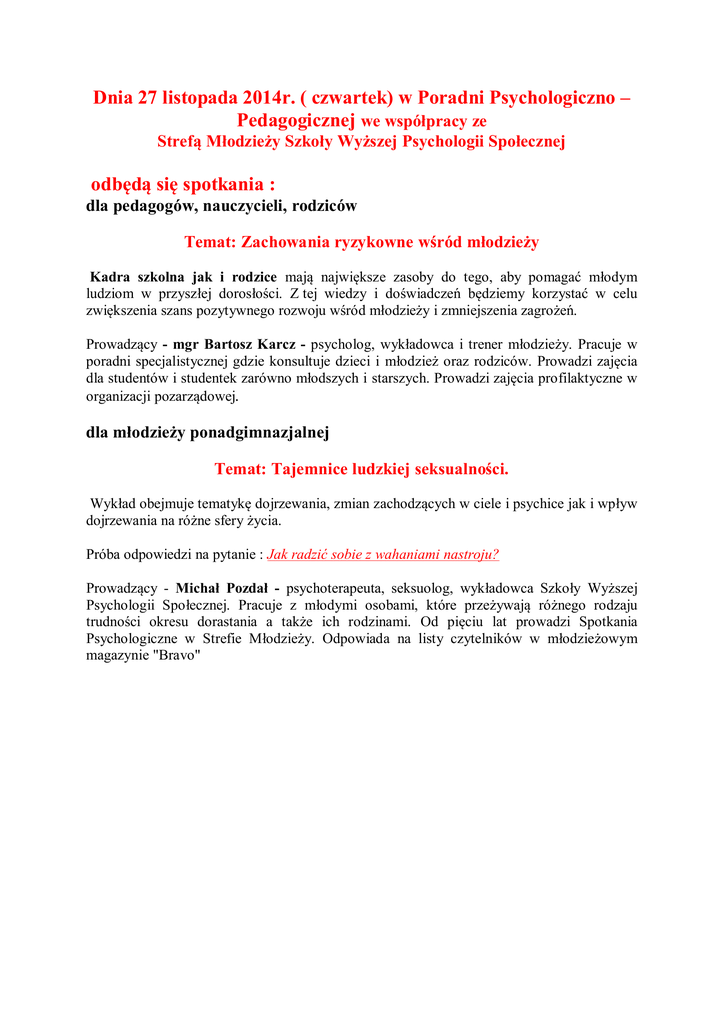 Dnia 27 listopada 2014r. ( czwartek) w Poradni Psychologiczno – Pedagogicznej we wspó pracy ze Stref M odzie y Szko y Wy szej Psychologii Spo ecznej odb si spotkania : dla pedagogów, nauczycieli, rodziców Temat: Zachowania ryzykowne w ród m odzie y Kadra szkolna jak i rodzice maj najwi ksze zasoby do tego, aby pomaga m odym ludziom w przysz ej doros ci. Z tej wiedzy i do wiadcze b dziemy korzysta w celu zwi kszenia szans pozytywnego rozwoju w ród m odzie y i zmniejszenia zagro . Prowadz cy - mgr Bartosz Karcz - psycholog, wyk adowca i trener m odzie y. Pracuje w poradni specjalistycznej gdzie konsultuje dzieci i m odzie oraz rodziców. Prowadzi zaj cia dla studentów i studentek zarówno m odszych i starszych. Prowadzi zaj cia profilaktyczne w organizacji pozarz dowej. dla m odzie y ponadgimnazjalnej Temat: Tajemnice ludzkiej seksualno ci. Wyk ad obejmuje tematyk dojrzewania, zmian zachodz cych w ciele i psychice jak i wp yw dojrzewania na ró ne sfery ycia. Próba odpowiedzi na pytanie : Jak radzi sobie z wahaniami nastroju? Prowadz cy - Micha Pozda - psychoterapeuta, seksuolog, wyk adowca Szko y Wy szej Psychologii Spo ecznej. Pracuje z m odymi osobami, które prze ywaj ró nego rodzaju trudno ci okresu dorastania a tak e ich rodzinami. Od pi ciu lat prowadzi Spotkania Psychologiczne w Strefie M odzie y. Odpowiada na listy czytelników w m odzie owym magazynie "Bravo"