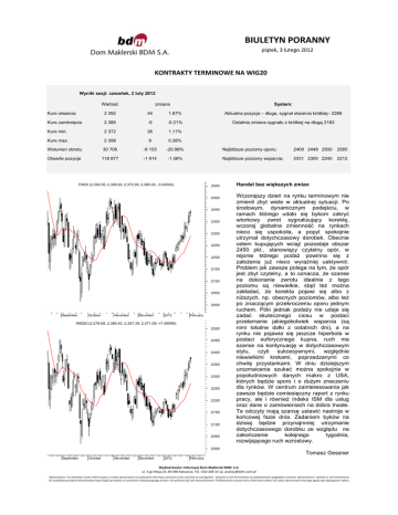 BIULETYN PORANNY piątek, 3 lutego 2012 KONTRAKTY TERMINOWE NA WIG20 Wyniki sesji: czwartek, 2 luty 2012 Wartość zmiana System: Kurs otwarcia 2 392 44 1.87% Aktualna pozycja – długa, sygnał otwarcia krótkiej– 2288 Kurs zamknięcia 2 385 -5 -0.21% Ostatnia zmiana sygnału z krótkiej na długą 2183 Kurs min. 2 372 26 1.11% Kurs max. 2 399 9 0.38% Wolumen obrotu 30 706 -8 153 -20.98% Najbliższe poziomy oporu: 2400 2448 2500 2585 Otwarte pozycje 118 877 -1 914 -1.58% Najbliższe poziomy wsparcia: 2331 2300 2240 2212 FW20 (2,392.00, 2,399.00, 2,372.00, 2,385.00, -5.00000) 2500 2450 2400 2350 2300 2250 2200 2150 2100 2050 2000 September October November December 2012 February WIG20 (2,378.68, 2,380.42, 2,357.39, 2,371.09, +7.48999) 2500 2450 2400 2350 2300 2250 2200 2150 2100 2050 Handel bez większych zmian Wczorajszy dzień na rynku terminowym nie zmienił zbyt wiele w aktualnej sytuacji. Po środowym, dynamicznym podejściu, w ramach którego udało się bykom zakryć wtorkowy zwrot sygnalizujący korektę, wczoraj globalna zmienność na rynkach nieco się uspokoiła, a popyt spokojnie utrzymał dotychczasowy dorobek. Obecnie celem kupujących wciąż pozostaje obszar 2450 pkt., stanowiący czytelny opór, w rejonie którego podaż powinna się z założenia już nieco wyraźniej uaktywnić. Problem jak zawsze polega na tym, że opór jest zbyt czytelny, a to oznacza, że szanse na dokonanie zwrotu idealnie z tego poziomu są niewielkie, stąd też można zakładać, że korekta pojawi się albo z niższych, np. obecnych poziomów, albo też po znaczącym przekroczeniu oporu jednym ruchem. Póki jednak podaży nie udaje się zadać skutecznego ciosu w postaci przełamanie jakiegokolwiek wsparcia (są nimi lokalne dołki z ostatnich dni), a na rynku nie pojawia się jeszcze hiperbola w postaci euforycznego kupna, ruch ma szanse na kontynuację w dotychczasowym stylu, czyli sukcesywnymi, względnie niewielkimi krokami, poprzedzanymi co chwilę przystankami. W dniu dzisiejszym urozmaicenia szukać można spokojnie w popołudniowych danych makro z USA, których będzie sporo i o dużym znaczeniu dla rynków. W centrum zainteresowania jak zawsze będzie comiesięczny raport z rynku pracy, ale i również indeks ISM dla usług oraz dane o zamówieniach na dobra trwałe. Te odczyty mają szansę ustawić nastroje w końcowej fazie dnia. Zadaniem byków na dzisiaj będzie przynajmniej utrzymanie dotychczasowego dorobku ze względu na zakończenie kolejnego tygodnia, rozwijającego ruch wzrostowy. 2000 September October November December 2012 Tomasz Gessner February Wydział Analiz i Informacji Dom Maklerski BDM S.A. ul. 3‐go Maja 23, 40‐096 Katowice, Tel.: 032 208 14 12, [email protected] Opracowanie ma charakter czysto informacyjny i zostało opracowany na podstawie informacji uznanych przez autorów za wiarygodne . Zawarte w nim komentarze są subiektywnymi poglądami autorów. Opracowanie i zawarte w nim komentarze nie są podstawą żadnej rekomendacji kupna bądź sprzedaży w rozumieniu obowiązującego prawa i nie powinny być tak interpretowane. Publikowanie w prasie lub w Internecie całości lub części opracowania wymaga zgody sporządzających raport. BIULETYN PORANNY piątek, 3 lutego 2012 RYNEK AKCJI Wyniki sesji: czwartek, 2 luty 2012 Kurs otwarcia Kurs zamknięcia Zmiana [%] Kurs min. Kurs max. Zakres wahań Wartość obrotów [mln PLN] 558,0 52 tygodnie Indeks Kurs max. Kurs min. WIG20 2 942.4 2 019.0 2 378.68 2 371.09 0.32% 2 357.39 2 380.42 23.0 sWIG80 12 936.5 8 190.8 9 549.83 9 561.70 0.64% 9 501.67 9 563.44 61.8 63,8 mWIG40 2 993.2 2 054.5 2 379.68 2 387.02 0.51% 2 360.87 2 389.88 29.0 126,0 WIG PL 49 765.2 35 670.7 41 117.35 41 273.86 0.32% 41 117.35 41 273.86 156.5 - WIG 50 501.8 35 349.0 41 661.54 41 602.24 0.40% 41 353.09 41 696.37 343.3 766,0 Spółka Cena [PLN] ASSECOPOL zmiana % Mkt Cap [mln PLN] zmiana % względem WIG20 dzienna 1M 3M 6M dzienna 1M 3M 6M 1.7% -0.2% -7.2% -2.3% 9.8% 47.71 3 701 0.1% 0.4% -3.4% BANK HANDLOWY 76.50 9 995 -0.8% 12.0% 7.2% -3.0% -1.1% 4.4% 8.3% 5.1% BOGDANKA 126.00 4 286 1.8% 18.5% 9.7% 28.0% 1.5% 11.0% 10.8% 36.1% BRE 295.50 12 441 -1.5% 13.7% 9.0% -3.9% -1.8% 6.1% 10.1% 4.2% 2.51 1 837 -1.6% 7.7% -7.7% -24.4% -1.9% 0.2% -6.6% -16.3% GETIN GTC 10.13 2 222 -1.7% 8.7% -10.4% -28.2% -2.0% 1.1% -9.3% -20.1% JSW 106.10 12 648 -1.0% 19.1% 12.6% -15.8% -1.3% 11.6% 13.7% -7.7% KERNEL 68.30 5 442 1.3% -4.6% 2.4% -4.1% 0.9% -12.2% 3.5% 4.0% KGHM 143.80 28 760 0.5% 23.6% -8.3% -19.7% 0.2% 16.1% -7.2% -11.6% LOTOS 26.20 3 403 -1.1% 10.4% -8.6% -27.4% -1.4% 2.8% -7.5% -19.3% PBG 81.80 1 169 -0.5% 11.3% -3.8% -33.0% -0.8% 3.7% -2.7% -24.9% PEKAO 160.10 42 007 -0.6% 10.8% 4.6% 7.4% -0.9% 3.2% 5.7% 15.5% PGE 20.15 37 676 -1.7% -7.5% 0.8% -11.4% -2.0% -15.1% 1.8% -3.4% PGNIG 3.78 22 302 -1.3% -3.1% -4.3% -6.7% -1.6% -10.6% -3.2% 1.4% PKNORLEN 38.88 16 629 3.0% 10.5% -6.1% -10.3% 2.7% 2.9% -5.0% -2.2% PKOBP 36.04 45 050 1.5% 8.2% 0.2% -5.8% 1.2% 0.7% 1.3% 2.3% PZU 343.50 29 662 0.7% 8.9% 0.1% -6.1% 0.4% 1.3% 1.2% 1.9% TAURON 5.42 9 499 -0.9% -0.4% 0.4% -14.5% -1.2% -7.9% 1.5% -6.4% TPSA 17.19 22 960 0.5% -2.6% -1.4% 2.1% 0.2% -10.2% -0.3% 10.1% TVN 11.22 3 858 1.3% 6.9% -8.8% -29.9% 0.9% -0.7% -7.7% -21.8% Komentarz po sesji Komentarz przed sesją: Stabilizacja Drugi dzień z rzędu spada obrót akcjami największych spółek notowanych na warszawskim parkiecie, nie zmienia się jednak kierunek ruchu i WIG20 zanotował kolejną wzrostową sesję. Zwyżka była umiarkowana (+0,32%) i wpisała się w uspokojenie na innych parkietach, co po wczorajszym mocnym wzroście należy traktować jako przypieczętowanie dominacji byków. Nasz rynek nadal realizuje scenariusz ruchu do 2400 punktów i niezmiennie należy zakładać, że póki Stany Zjednoczone nie wyślą sygnału do odwrotu, popyt powinien utrzymywać swoją przewagę. W kalendarzu makroekonomicznym jedynym istotnym wydarzeniem była publikacja z amerykańskiego rynku pracy, która nie 