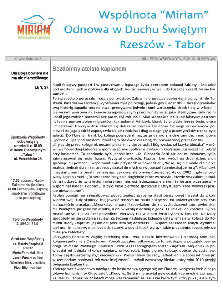 27 września 2016 Dla Boga bowiem nie ma nic niemożliwego BIULETYN WSPÓLNOTY, ROK IX, NUMER 396 Bezdomny ateista kapłanem Kupił fałszywy paszport i w poszukiwaniu lepszego życia pontonem pokonał Adriatyk. Mieszkał Łk 1, 37 pod mostem i jadł w stołówce dla ubogich. Po raz pierwszy w życiu do kościoła wszedł, by nie być Spotkania Wspólnoty odbywają się we wtorki o 18.00 w Domu Diecezjalnym „Tabor” ul. Połonińska 25 17.00 adoracja Najśw. Sakramentu (kaplica) 18.00 Eucharystia (kaplica) i spotkanie modlitewne (aula pod kaplicą) Telefon Wspólnoty 884.31.51.51 Struktura Wspólnoty ks. Marcin Szopiński pasterz Marta Fortuniak, lider Jacek Fura, v-ce lider Wiesława Mac, v-ce lider Piotr Bilo, v-ce lider samym… To świadectwo poruszało mocą swej prostoty. Zabrzmiało podczas papieskiej pielgrzymki do Toskanii. Katedra we Florencji wypełniona była po brzegi, jednak gdy Bledar Xhuli zaczął opowiadać swą historię zapadła totalna cisza, przerywana jedynie łzami wzruszenia. Urodził się w Albanii – pierwszym państwie na świecie zalegalizowanym przez konstytucję, jako ateistyczne. Gdy reżim upadł jego rodzice pozostali bez pracy. Był rok 1993. Miał szesnaście lat. Kupił fałszywy paszport i bilet na ponton pełen migrantów, tak pokonał Adriatyk. Liczył, że znajdzie lepsze życie, pracę i mieszkanie. Rzeczywistość okazała się daleka od marzeń. Do domu nie mógł jednak wrócić ponieważ na jego podróż zapożyczyła się cała rodzina i dług zaciągnięty u przemytników trzeba było spłacić. Do Florencji trafił, bo kolega powiedział mu, że za darmo znajdzie tam dach nad głową i jedzenie. Spał pod mostem i żywił się w stołówce dla ubogich, prowadzonej przez Caritas. „Kryjąc się przed kolegami, nocami płakałem z desperacji. I Bóg wysłuchał krzyku biedaka” – mówił we florenckiej katedrze wspominając swe spotkanie z włoskim kapłanem. Już wcześniej żebrał przy kościołach. To spotkanie było jednak inne. „Ks. Giancarlo Setti nie dał mi jałmużny, tylko zainteresował się moim losem. Wypytał o sytuację. Poprosił bym wrócił na drugi dzień, a on spróbuje mi pomóc” – wspominał. Gdy przyszedłem powiedział: „Nic mi się nie udało dla ciebie znaleźć. Jednak dla mnie, to Jezus zapukał do mych drzwi, zostań i zamieszkaj ze mną”. Albańczyk mieszkał z nim na parafii nie miesiąc, czy dwa, ale prawie dziesięć lat. Aż do 2002 r. gdy schorowany kapłan zmarł. „To serdeczne przyjęcie dogłębnie mnie wzruszyło. Przede wszystkim jednak dał mi odczuć, że to iż jestem migrantem nie jest jednoznaczne z tym, że jestem przestępcą” – wspominał Bledar. I dodał: „To było moje pierwsze spotkanie z Chrystusem, choć wówczas jeszcze nieświadome”. Kapłan pomógł mu zalegalizować pobyt, znaleźć pracę na stacji benzynowej i wysłał do szkoły wieczorowej. Gdy skończył księgowość poszedł na nauki polityczne na uniwersytecie cały czas jednocześnie pracując. „Mieszkając na parafii spotykałem się z przychodzącymi tam rówieśnikami. Pamiętam jak graliśmy w piłkę, a oni w każdą niedzielę o godz. 11 uciekali do kościoła. By nie zostać samym i ja za nimi poszedłem. Pierwszy raz w moim życiu byłem w kościele. Na Mszy spodobały mi się czytania i śpiew. Za tydzień naśladując kolegów ustawiłem się w kolejce do Komunii. Kiedy ksiądz mi jej nie dał poczułem się dotknięty” – wspominał Bledar. Ksiądz wytłumaczył mu, że najpierw musi być ochrzczony, a gdy chłopak wyraził takie pragnienie, rozpoczęły się miesiące katechezy. „Przyjąłem Chrzest w Wigilię Paschalną roku 1994, a także bierzmowanie i pierwszą Komunię. Kolejne spotkanie z Chrystusem. Powoli zacząłem odkrywać, że to jest dopiero początek pewnej drogi. W czasie Wielkiego Jubileuszu Roku 2000 zapragnąłem zostać księdzem. Mój opiekun powiedział mi jednak: «Skończ najpierw uniwersytet. Bogu się nie śpieszy, dobrze się zastanów. To my często jesteśmy zbyt niecierpliwi». Posłuchałem tej rady, jednak on nie zobaczył mnie już w seminarium ponieważ rok wcześniej zmarł” – mówił wzruszony Bledar, który roku 2010 przyjął święcenie kapłańskie. Kończąc swe świadectwo nawiązał do hasła odbywającego się we Florencji kongresu kościelnego „Nowy humanizm w Chrystusie”. „Kiedy ks. Setti mnie przyjął powiedział: «do mych drzwi zapukał Jezus». Jednak po 22 latach mogę was zapewnić, że Jezus nie był w tym który pukał, ale w tym Animatorzy diakonii Alicja Smalarz diakonia adoracyjna Marta Fortuniak diakonia nauczania i prorocka Jolanta Skotnicka diakonia uwielbienia Maciej Mierzejewski diakonia prowadzenia spotkań Piotr Bilo diakonia ewangelizacyjna Jacek Fura diakonia modlitwy wstawienniczej i uwolnienia Maria Bassara diakonia modlitwy osłonowej kto mu otworzył drzwi - mówił swą perfekcyjną włoszczyzną. - Chciałbym jedynie, tak jak ks. Setti naprawdę umieć żyć tym, co nauczam”. To świadectwo nie potrzebuje komentarza. Jeśli już, mogą być nim słowa samego albańskiego kapłana dziś aktywnie zaangażowanego w pracę duszpasterską z potrzebującymi. „Na progu Jubileuszu Miłosierdzia Jezus powtarza Kościołowi i światu: «kołaczcie, a otworzą wam»”. źródło: info.wiara.pl - 14.11.2015 r. Słowo Boże do medytacji − − − − − − − śr. – Łk 9, 57-62 Naśladowanie Chrystusa wymaga wyrzeczenia czw. – J 1, 47-51 Ujrzycie aniołów Bożych pt . – Łk 10, 13-16 Kto gardzi Chrystusem, gardzi Tym, który Go posłał sob. – Łk 10, 17-24 Przywileje uczniów niedz. – Łk 17, 5-10 Służyć z pokorą pn. – Łk 10, 25-37 Przypowieść o miłosiernym Samarytaninie wt. – Łk 10, 38-42 Jezus w gościnie u Marty i Marii Intencje do modlitwy Paweł Kobosz diakonia modlitwy w nagłych potrzebach Maria Hubert diakonia modlitwy za kapłanów Marek Wiśniewski diakonia liturgicz