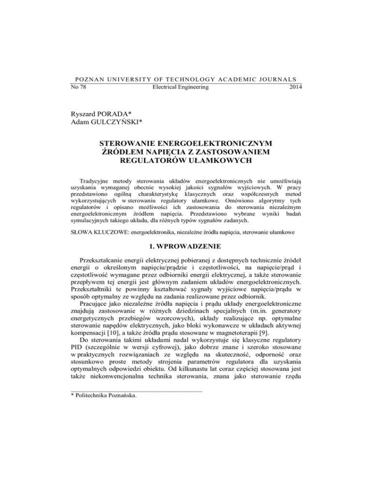P O Z N A N UN I VE RS I T Y O F T E C HN O L O G Y ACA D E MI C J O URN A L S No 78 Electrical Engineering 2014 Ryszard PORADA* Adam GULCZYŃSKI* STEROWANIE ENERGOELEKTRONICZNYM ŹRÓDŁEM NAPIĘCIA Z ZASTOSOWANIEM REGULATORÓW UŁAMKOWYCH Tradycyjne metody sterowania układów energoelektronicznych nie umożliwiają uzyskania wymaganej obecnie wysokiej jakości sygnałów wyjściowych. W pracy przedstawiono ogólną charakterystykę klasycznych oraz współczesnych metod wykorzystujących w sterowaniu regulatory ułamkowe. Omówiono algorytmy tych regulatorów i opisano możliwości ich zastosowania do sterowania niezależnym energoelektronicznym źródłem napięcia. Przedstawiono wybrane wyniki badań symulacyjnych takiego układu, dla różnych typów sygnałów zadanych. SŁOWA KLUCZOWE: energoelektronika, niezależne źródła napięcia, sterowanie ułamkowe 1. WPROWADZENIE Przekształcanie energii elektrycznej pobieranej z dostępnych technicznie źródeł energii o określonym napięciu/prądzie i częstotliwości, na napięcie/prąd i częstotliwość wymagane przez odbiorniki energii elektrycznej, a także sterowanie przepływem tej energii jest głównym zadaniem układów energoelektronicznych. Przekształtniki te powinny kształtować sygnały wyjściowe napięcia/prądu w sposób optymalny ze względu na zadania realizowane przez odbiornik. Pracujące jako niezależne źródła napięcia i prądu układy energoelektroniczne znajdują zastosowanie w różnych dziedzinach specjalnych (m.in. generatory energetycznych przebiegów wzorcowych), układy realizujące np. optymalne sterowanie napędów elektrycznych, jako bloki wykonawcze w układach aktywnej kompensacji [10], a także źródła prądu stosowane w magnetoterapii [9]. Do sterowania takimi układami nadal wykorzystuje się klasyczne regulatory PID (szczególnie w wersji cyfrowej), jako dobrze znane i szeroko stosowane w praktycznych rozwiązaniach ze względu na skuteczność, odporność oraz stosunkowo proste metody strojenia parametrów regulatora dla uzyskania optymalnych odpowiedzi obiektu. Od kilkunastu lat coraz częściej stosowana jest także niekonwencjonalna technika sterowania, znana jako sterowanie rzędu __________________________________________ * Politechnika Poznańska. 202 Ryszard Porada, Adam Gulczyński ułamkowego [5, 6, 8] ze względu na możliwość zwiększenia jakości sterowania, a tym samym polepszenia jakości sygnałów wyjściowych. W pracy przedstawiono badania układu zamkniętego niezależnego energoelektronicznego źródła napiecia. Porównanie regulatora klasycznego (dobranego według kryterium modułu) z regulatorem ułamkowym wykonano dla tego samego układu, o tych samych parametrach. Przedstawiono wybrane wyniki badań symulacyjnych dla różnych typów sygnałów zadanych oraz różnych warunków obciążenia. 2. REGULATORY UŁAMKOWE PI ( ) D ( ) Klasyczne regulatory o działaniu proporcjonalno-całkująco-różniczkującym (РID) [1, 2, 3] są od kilkudziesięciu lat stosowane w układach automatycznej regulacji. Idealną postać tych regulatorów opisuje transmitancja: GR ( s) K p 1 1 sTD (1) sTI gdzie: K p – współczynnik wzmocnienia, TI – stała całkowania (czas zdwojenia), TD – stała różniczkowania (czas wyprzedzenia). Parametry klasycznych regulatorów PID są dobierane według kryteriów jakości regulacji [1, 2], do których należą m.in: kryteria zapasu stabilności, kryteria rozkładu pierwiastków równania charakterystycznego, kryteria czasowe, kryteria częstotliwościowe czy kryteria całkowe. Obecnie coraz większe zainteresowanie budzą regulatory РID, w których procedury całkowania i różniczkowania odbywają się według algorytmów niecałkowitych rzędów [5, 6, 8]. Takie regulatory opisuje transmitancja niecałkowitego rzędu: GRPI D ( s) K p 1 1 TD s (2) TI s gdzie oprócz wyżej wymienionych parametrów K p , TI oraz TD dochodzą jeszcze dwa: – rząd całkowania oraz – rząd różniczkowania. Możliwość tę stwarza uogólnienie operacji całkowania i różniczkowania dla niecałkowitego (ułamkowego) rzędu. Dla zastosowań praktycznych w automatyce stosowane są metody transformaty Laplace'a. Transformata ułamkowa Laplace'a w sensie definicji pochodnych i całek niecałkowitego rzędu, wymaga zastosowania odpowiednich metod aproksymacji [7, 8]. Proponowane są różne metody aproksymacji takiego wyrażenia w czasie ciągłym oraz dyskretnym [8, 10, 11]. Dla takich regulatorów nie opracowano jeszcze jednoznacznych reguł strojenia. Najczęściej dla ilościowej oceny właściwości dynamicznych układu bada się Sterowanie energoelektronicznym źródłem napięcia z zastosowaniem … 203 odpowiedź na skok jednostkowy przy uwzględnieniu różnych wskaźników, m.in. zerowego błędu regulacji, zapasu fazy i wzmocnienia, odporności na zmiany wzmocnienia obiektu, odporności na szumy wysokiej częstotliwości czy minimalnego odkształcenia sygnału wyjściowego [6, 7, 9]. 3. STRUKTURA FALOWNIKA NAPIĘCIA Możliwość zastosowania regulatorów ułamkowych przetestowano na przykładzie 1-fazowego niezależnego źródła napięcia w środowisku Matlab®/Simulink®. Części składowe energoelektronicznego źródła napięcia pokazano na rysunku 1. Na wyjściu falownika zastosowano filtr dolnoprzepustowy LPF. Sygnał sterujący u jest generowany przez regulator; sygnał y jest sygnałem na wyjściu energetycznym falownika. a) b) L Ro C Lo Rys. 1. Struktura blokowa: a) części energetycznej niezależnego źródła napięcia oraz b) filtr wyjściowy (LPF) 2-go rzędu z gałęzią odbiornikową RoLo Badania miały na celu określenie skuteczności odwzorowania sygnału zadanego (napięcia wyjściowego na gałęzi odbiornikowej RoLo) dla następujących parametrów układu: napięcie zasilania falownika 400 [V], częstotliwość nośna modulacji MSI, fPWM = 12,5 kHz, modulacja MSI unipolarna. Przyjęte parametry dolnoprzepustowego filtru