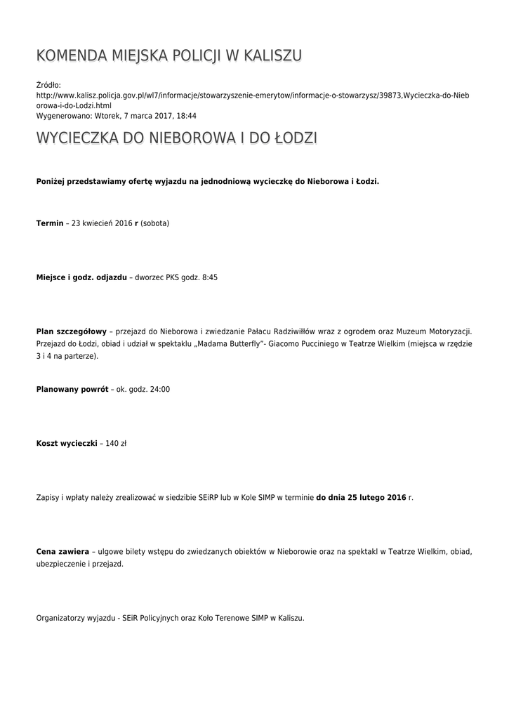 KOMENDA MIEJSKA POLICJI W KALISZU Źródło: http://www.kalisz.policja.gov.pl/wl7/informacje/stowarzyszenie-emerytow/informacje-o-stowarzysz/39873,Wycieczka-do-Nieb orowa-i-do-Lodzi.html Wygenerowano: Wtorek, 7 marca 2017, 18:44 WYCIECZKA DO NIEBOROWA I DO ŁODZI Poniżej przedstawiamy ofertę wyjazdu na jednodniową wycieczkę do Nieborowa i Łodzi. Termin – 23 kwiecień 2016 r (sobota) Miejsce i godz. odjazdu – dworzec PKS godz. 8:45 Plan szczegółowy – przejazd do Nieborowa i zwiedzanie Pałacu Radziwiłłów wraz z ogrodem oraz Muzeum Motoryzacji. Przejazd do Łodzi, obiad i udział w spektaklu „Madama Butterfly”- Giacomo Pucciniego w Teatrze Wielkim (miejsca w rzędzie 3 i 4 na parterze). Planowany powrót – ok. godz. 24:00 Koszt wycieczki – 140 zł Zapisy i wpłaty należy zrealizować w siedzibie SEiRP lub w Kole SIMP w terminie do dnia 25 lutego 2016 r. Cena zawiera – ulgowe bilety wstępu do zwiedzanych obiektów w Nieborowie oraz na spektakl w Teatrze Wielkim, obiad, ubezpieczenie i przejazd. Organizatorzy wyjazdu - SEiR Policyjnych oraz Koło Terenowe SIMP w Kaliszu. Kontakt: Waldemar Pawlak, tel. 662 073 586, e-mail: [email protected] Ocena: 0/5 (0) Tweetnij