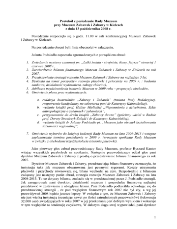Protokół z posiedzenie Rady Muzeum przy Muzeum Zabawek i Zabawy w Kielcach z dnia 13 października 2008 r. Posiedzenie rozpoczęło się o godz. 11.00 w sali konferencyjnej Muzeum Zabawek i Zabawy w Kielcach. Na posiedzeniu obecni byli: lista obecności w załączeniu. Jolanta Podsiadło zapoznała zgromadzonych z porządkiem obrad: 1. Zwiedzanie wystawy czasowej pn. „Lalki świata - strojnisie, ikony, fetysze” otwartej 1 czerwca 2008 r., 2. Zatwierdzenie bilansu finansowego Muzeum Zabawek i Zabawy w Kielcach za rok 2007, 3. Przedstawienie strategii rozwoju Muzeum Zabawek i Zabawy na najbliŜsze 5 lat, 4. Dyskusja na temat perspektyw rozwoju placówki ( priorytety na 2009 r. : badania naukowe, działalność wydawnicza, zakupy zbiorów), 5. Jubileusz trzydziestolecia istnienia Muzeum w 2009 roku – propozycja obchodów, 6. Omówienie planu prac wydawniczych: a. redakcja kwartalnika „Zabawy i Zabawki” (zmiana Rady Redakcyjnej, rozpatrzenie kandydatury na sekretarza pani dr Katarzyny Kabacińskiej), b. wydanie ksiąŜki prof. Haliny Mielickiej „Wspomnienia z dzieciństwa. Szkic antropologiczny o zabawach i zabawkach”, c. przygotowanie do druku ksiąŜki „Zabawy dawne” (gościnny udział w Radzie prof. Doroty Strzelczyk-śołądź i dr Katarzyny Kabacińskiej), d. wydanie ksiąŜki dr Jolanty Podsiadło pt. „Muzeum jako ośrodek kształtowania toŜsamości regionalnej”, 7. Omówienie wyborów do kolejnej kadencji Rady Muzeum na lata 2009-2013 i wstępne zaplanowanie terminu posiedzenia w 2009 r. (uroczyste spotkanie Rady Muzeum w związku z obchodami trzydziestolecia istnienia placówki). Jako pierwszy głos zabrał przewodniczący Rady Muzeum, profesor Ryszard Kantor witając wszystkich przybyłych na spotkanie. Następnie przewodniczący oddał głos pani dyrektor Muzeum Zabawek i Zabawy z prośbą o przedstawienie bilansu finansowego za rok 2007. Dyrektor Muzeum Zabawek i Zabawy, przedstawiając bilans finansowy zaznaczyła, Ŝe instytucja taka jak muzeum obwarowana jest pewnymi rygorami. Koszty utrzymania placówki i przychody równowaŜą się, bilans wychodzi na zero. Bezpośrednio z bilansem związany jest następny punkt obrad, strategia rozwoju Muzeum Zabawek i Zabawy na lata 2008-2013. To co dotyczy bilansu, znalazło się w przedstawionej przez J. Podsiadło strategii. Jak zasugerowała pani dyrektor, działalność muzeum i gospodarkę finansową najlepiej przedstawić w zestawieniu z ubiegłymi latami. Pani Podsiadło podkreśliła odwołując się do przedstawionej strategii , Ŝe pod względem finansowym rok 2007 nie był zły, a wg jej przewidywań 2008 będzie jeszcze lepszy. W związku z tym, Ŝe Muzeum Zabawek i Zabawy nie jest wielką instytucją (oceniając nawet po ilości zatrudnionych pracowników) frekwencja 32.000 osób zwiedzających w roku 2007 w jej przekonaniu jest dobrym wynikiem i wskazuje w tym względzie na tendencję zwyŜkową. W dalszym ciągu swej wypowiedzi, pani dyrektor 1 przeszła do omówienia drugiego punktu przedstawionej strategii, tj. kwestii dotacji organizatora dla muzeum. Pomimo starań, dotacja na rok obecny nie wzrosła, chociaŜ zwiększyły się koszty utrzymania budynku. Taki stan rzeczy przełoŜył się równieŜ na działalność podstawową muzeum. W związku z brakiem odpowiednich środków były ogromne problemy z organizacją wystawy „Lalki świata – strojnisie, ikony, fetysze”. Nie udało się pozyskać na ten projekt środków zewnętrznych, a była to wystawa najwaŜniejsza w tym roku. Pomimo wielkich kosztów organizacyjnych, udało się tę wystawę przygotować. Następnie dyrektor przeszła do omówienia środków zewnętrznych dla instytucji. W 2007 roku była to niewielka kwota, odrzucone były dwa wnioski. Natomiast w 2008 roku udało się pozyskać duŜo więcej pieniędzy. W pkt. 4 strategii omówiono przychody z biletów, sprzedaŜy zabawek, etc. Tu pani Podsiadło podkreśliła, Ŝe bilety w Muzeum Zabawek i Zabawy są bardzo tanie, szczególnie w porównaniu z innymi muzeami. W przyszłym roku jest plan, aby ceny biletów podnieść na 4 zł i 8zł. Instytucja taka jak muzeum nie jest nastawiona na zysk, ale w związku z brakiem wzrostu dotacji, pani dyrektor musiała podjąć decyzję związaną z pozyskiwaniem dodatkowym środków finansowych. W roku 2007 zamknięta została Galeria Abrakadabra, po to, by tę powierzchnię wynająć pod urządzenie kawiarni. Wg pani Podsiadło decyzja ta zaowocowała dochodami w postaci 4 tys zł miesięcznie, co stanowi konkretny „zastrzyk finansowy” do działalności merytorycznej placówki. Ta powierzchnia jest wynajęta na 7 lat, więc i te dochody będą przez ten czas stałe. Ponadto, jak podkreśliła pani Podsiadło, w 2007 r. ponad 15% kosztów utrzymania muzeum płynie z dochodów własnych, co jak na placówkę muzealną, stanowi bardzo znaczący procent. W odniesieniu do bilansu, dyrektor MZiZ wyraziła nadzieję, Ŝe ten stały dochód własny muzeum utrzyma się jeśli nie na poziomie 15 %, to przynajmniej 10%. Przy czym wiele imprez, czy to warsztaty, czy lekcje muzealne, nie są w całości nastawione na zysk. Koszt ich przygotowania nie zwraca się w przychodach z biletów. W podsumowaniu pani Podsiadło, oznajmiła, Ŝe w bilansie nie było Ŝadnych przekroczeń, a ostatnia kontrola zewnętrzna nie wykazała Ŝadnych niezgodności. Następnie głos zabrał prof. Kantor, oświadczając, Ŝe najwaŜniejsze, Ŝe muzeum jakoś sobie daje radę, istnieje i rozwija się. Jednocześnie podsumował wypowiedź poprzedniczki, Ŝe była przekonywująca. Po czym nastąpiło głosowanie nad zatwierdzeniem bilansu. W głosowaniu jawnym, jednomyślnie bilans zatwierdzono. Po głosowaniu głos ponownie zabrała dyrektor muzeum w celu przedstawienia pkt. 3 porządku obrad – przedstawienie strategii rozwoju Muzeum Zabawek i Zabawy w Kielcach za rok 2007 (załącznik nr 3. do protokołu). W kontekście strategii, za najwaŜniejsze dyrektor Podsia