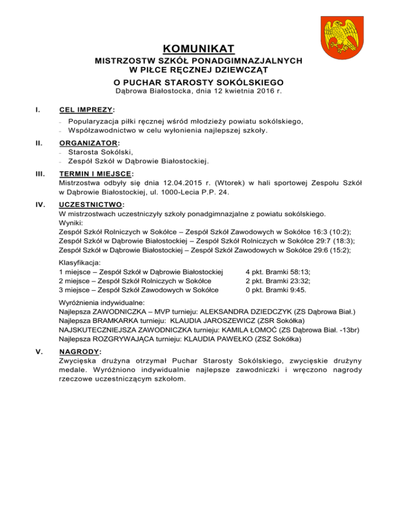 KOMUNIKAT MISTRZOSTW SZKÓŁ PONADGIMNAZJALNYCH W PIŁCE RĘCZNEJ DZIEWCZĄT O PUCHAR STAROSTY SOKÓLSKIEGO Dąbrowa Białostocka, dnia 12 kwietnia 2016 r. I. CEL IMPREZY: II. Popularyzacja piłki ręcznej wśród młodzieży powiatu sokólskiego, Współzawodnictwo w celu wyłonienia najlepszej szkoły. ORGANIZATOR: Starosta Sokólski, Zespół Szkół w Dąbrowie Białostockiej. III. TERMIN I MIEJSCE: Mistrzostwa odbyły się dnia 12.04.2015 r. (Wtorek) w hali sportowej Zespołu Szkół w Dąbrowie Białostockiej, ul. 1000-Lecia P.P. 24. IV. UCZESTNICTWO: W mistrzostwach uczestniczyły szkoły ponadgimnazjalne z powiatu sokólskiego. Wyniki: Zespół Szkół Rolniczych w Sokółce – Zespół Szkół Zawodowych w Sokółce 16:3 (10:2); Zespół Szkół w Dąbrowie Białostockiej – Zespół Szkół Rolniczych w Sokółce 29:7 (18:3); Zespół Szkół w Dąbrowie Białostockiej – Zespół Szkół Zawodowych w Sokółce 29:6 (15:2); Klasyfikacja: 1 miejsce – Zespół Szkół w Dąbrowie Białostockiej 2 miejsce – Zespół Szkół Rolniczych w Sokółce 3 miejsce – Zespół Szkół Zawodowych w Sokółce 4 pkt. Bramki 58:13; 2 pkt. Bramki 23:32; 0 pkt. Bramki 9:45. Wyróżnienia indywidualne: Najlepsza ZAWODNICZKA – MVP turnieju: ALEKSANDRA DZIEDCZYK (ZS Dąbrowa Biał.) Najlepsza BRAMKARKA turnieju: KLAUDIA JAROSZEWICZ (ZSR Sokółka) NAJSKUTECZNIEJSZA ZAWODNICZKA turnieju: KAMILA ŁOMOĆ (ZS Dąbrowa Biał. -13br) Najlepsza ROZGRYWAJĄCA turnieju: KLAUDIA PAWEŁKO (ZSZ Sokółka) V. NAGRODY: Zwycięska drużyna otrzymał Puchar Starosty Sokólskiego, zwycięskie drużyny medale. Wyróżniono indywidualnie najlepsze zawodniczki i wręczono nagrody rzeczowe uczestniczącym szkołom.
