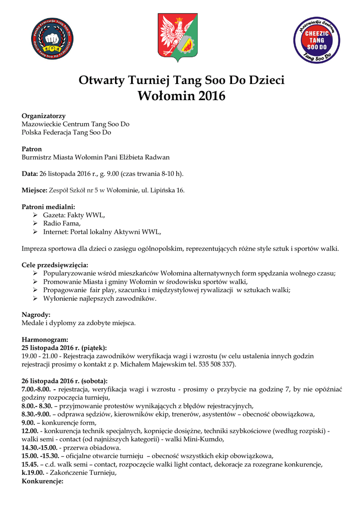 Otwarty Turniej Tang Soo Do Dzieci Wołomin 2016 Organizatorzy Mazowieckie Centrum Tang Soo Do Polska Federacja Tang Soo Do Patron Burmistrz Miasta Wołomin Pani Elżbieta Radwan Data: 26 listopada 2016 r., g. 9.00 (czas trwania 8-10 h). Miejsce: Zespół Szkół nr 5 w Wołominie, ul. Lipińska 16. Patroni medialni: Gazeta: Fakty WWL, Radio Fama, Internet: Portal lokalny Aktywni WWL, Impreza sportowa dla dzieci o zasięgu ogólnopolskim, reprezentujących różne style sztuk i sportów walki. Cele przedsięwzięcia: Popularyzowanie wśród mieszkańców Wołomina alternatywnych form spędzania wolnego czasu; Promowanie Miasta i gminy Wołomin w środowisku sportów walki, Propagowanie fair play, szacunku i międzystylowej rywalizacji w sztukach walki; Wyłonienie najlepszych zawodników. Nagrody: Medale i dyplomy za zdobyte miejsca. Harmonogram: 25 listopada 2016 r. (piątek): 19.00 - 21.00 - Rejestracja zawodników weryfikacja wagi i wzrostu (w celu ustalenia innych godzin rejestracji prosimy o kontakt z p. Michałem Majewskim tel. 535 508 337). 26 listopada 2016 r. (sobota): 7.00.-8.00. - rejestracja, weryfikacja wagi i wzrostu - prosimy o przybycie na godzinę 7, by nie opóźniać godziny rozpoczęcia turnieju, 8.00.- 8.30. – przyjmowanie protestów wynikających z błędów rejestracyjnych, 8.30.-9.00. – odprawa sędziów, kierowników ekip, trenerów, asystentów – obecność obowiązkowa, 9.00. – konkurencje form, 12.00. - konkurencja technik specjalnych, kopnięcie dosiężne, techniki szybkościowe (według rozpiski) walki semi - contact (od najniższych kategorii) - walki Mini-Kumdo, 14.30.-15.00. - przerwa obiadowa. 15.00. -15.30. – oficjalne otwarcie turnieju – obecność wszystkich ekip obowiązkowa, 15.45. – c.d. walk semi – contact, rozpoczęcie walki light contact, dekoracje za rozegrane konkurencje, k.19.00. - Zakończenie Turnieju, Konkurencje: Kopniecie okrężne na czas (10 sekund): dzieci młodsze, dzieci, Kopnięcie dosiężne: dzieci młodsze, dzieci, młodzicy, kadeci, Mini Kundo (soft-stick): dzieci młodsze, dzieci, młodzicy, Mini Kundo Dla Początkujących (soft-stick): dzieci młodsze, dzieci, młodzicy, Formy: dzieci młodsze, dzieci, młodzicy, kadeci, Semi contact: młodzicy, kadeci, Light contact (bez low kick): kadeci. Rozegramy dodatkowe kategorie w Mini Kumdo (soft stick) dla dzieci trenujących kilka miesięcy, nie posiadających żadnego stopnia w sztukach walki. Ważne - dziecko może wystartować w Mini Kundo (soft-stick) albo Mini Kundo Dla Początkujących (soft-stick) Kategorie wiekowe : do 6 r.ż. (2010 r.) - dzieci młodsze, do 9 r.ż. (2007 r.) - dzieci, do 12 r.ż. (2004 r.) - młodzicy, do 15 r.ż. (2001 r.) - kadeci. Wpisowe: 50 zł - Bez względu na ilość konkurencji, 10 zł - Dodatkowa kategoria w semi-contact lub light-contact, 20 zł – Jedna konkurencja. Zgłoszenia : Przyjmujemy do 20 listopad, tylko na oficjalnym druku (patrz załącznik do e-maila). Zgłoszenia proszę wysyłać na e-mail : [email protected]. Nocleg: Hotel Livia Mariańska 9A, Wołomin, tel. 22 776 30 01 (300 m od miejsca turnieju). Bezpieczeństwo: zawodnicy biorący udział w konkurencji walk (semi, light contact) muszą posiadać zgodę lekarza sportowego na udział w zawodach. Ważność badań będzie sprawdzana podczas rejestracji. każdy Klub zgłaszający musi we własnym zakresie posiadać polisę NW. na zgłaszającym Klubie spoczywa też obowiązek uzyskania pisemnej zgody rodziców na udział w Turnieju oraz polisę, którą powinien mieć kierownik zespołu do wglądu przez organizatora. zawodnik stawia się do walki w obowiązkowym sprzęcie ochronnym. Atrakcje turystyczne w Wołominie i okolicach: Muzeum im. Zofii i Wacława Nałkowskich, Rezerwat przyrody Grabicz, Torfowiska Białe Błota, Pawilon ekspozycyjny Panorama Ossowska w Ossowie. Zapraszamy: Michał Majewski & Marcin Kostyra Kontakty: - Michał Majewski, [email protected], tel. 535 508 337, Organizator Zawodów i Prezes Mazowieckiego Centrum Tang Soo Do - mazovia-tangsoodo.manifo.com. - Marcin Kostyra, [email protected], tel. 605 119 666, Sędzia Główny i Prezes Polskiej Federacji Tang Soo Do - www.tangsoodo.pl. partnerzy: