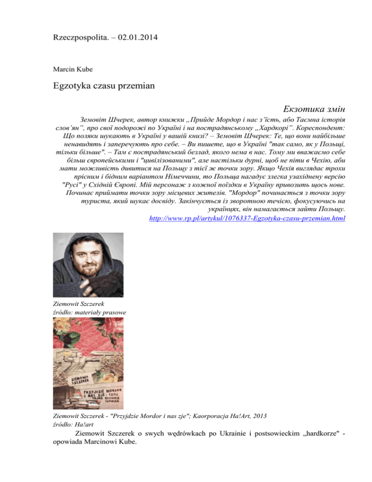 Rzeczpospolita. – 02.01.2014 Marcin Kube Egzotyka czasu przemian Екзотика змін Земовіт Шчерек, автор книжки „Прийде Мордор і нас з’їсть, або Таємна історія слов’ян”, про свої подорожі по Україні і на пострадянському „Хардкорі”. Кореспондент: Що поляки шукають в Україні у вашій книзі? – Земовіт Шчерек: Те, що вони найбільше ненавидять і заперечують про себе. – Ви пишете, що в Україні "так само, як у Польщі, тільки більше". – Там є пострадянський безлад, якого нема в нас. Тому ми вважаємо себе більш європейськими і "цивілізованими", але настільки дурні, щоб не піти в Чехію, аби мати можливість дивитися на Польщу з тієї ж точки зору. Якщо Чехія виглядає трохи прісним і бідним варіантом Німеччини, то Польща нагадує злегка узахіднену версію "Русі" у Східній Європі. Мій персонаж з кожної поїздки в Україну привозить щось нове. Починає приймати точки зору місцевих жителів. "Мордор" починається з точки зору туриста, який шукає досвіду. Закінчується із зворотною течією, фокусуючись на українцях, він намагається зайти Польщу. http://www.rp.pl/artykul/1076337-Egzotyka-czasu-przemian.html Ziemowit Szczerek źródło: materiały prasowe Ziemowit Szczerek - "Przyjdzie Mordor i nas zje"; Kaorporacja Ha!Art, 2013 źródło: Ha!art Ziemowit Szczerek o swych wędrówkach po Ukrainie i postsowieckim „hardkorze" opowiada Marcinowi Kube. Rz: Czego na Ukrainie szukają Polacy w pana książce? Ziemowit Szczerek: Wypatrują tego, czego sami najbardziej u siebie nienawidzimy i skrzętnie wypieramy. Zobacz na Empik.rp.pl Pisze pan, że na Ukrainie jest „tak samo jak w Polsce, tylko bardziej". Tam postsowiecki bałagan był na widoku, więc można powiedzieć, że takich rzeczy u nas nie ma. Czujemy się więc bardziej europejscy i dowartościowani jako „cywilizowany kraj", choć wystarczy pojechać do głupich Czech, by z tej samej perspektywy móc patrzeć na Polskę. Najmocniejszy fragment „Mordoru" to dla mnie scena, gdy polscy studenci przymuszają ukraińskiego dziadka i jego syna do pijaństwa, bo chcą się napić z „lokalsami". Takich scen widziałem więcej, spotkałem wielu rodaków szukających mitycznego „ruskiego hardkoru". Młodzi artyści fotografowali to, co najbardziej pokraczne i ponure. Potem robili z tego wystawy w Polsce, rozczulając się nad wschodnią biedą, choć nasz kraj też nadaje się na miejsce kontemplacji wschodniego „hardkoru". Jeśli Czechy trochę wyglądają jak przaśna i biedna wersja Niemiec, to Polska kojarzy się z nieco uzachodnioną wersją „ruskiej" Europy Wschodniej. Nie oszczędza pan nikogo. Nie chciałbym przesadzać, bo na Wschód gna nas także ciekawość świata. Nie jeździmy tylko po to, by się dowartościować, ale też by zobaczyć to, co wydaje się u nas już niemożliwe wskutek przemian. Na nasz sposób podróżowania nakładają się klisze i stereotypy – tradycje kresowe, schulzowski Drohobycz. Ostatecznie jednak podróżujemy, bo jesteśmy ciekawi tej krainy na wschodzie, jej kultury i tego, co nas łączy. Problem leży w tym, do czego się często ograniczamy w naszych podróżach. „Gonzo", do którego pan się odwołuje, to reportaż pełen zmyśleń. Wierzy pan w obiektywizm i prawdę w reportażu? Rzetelny reportaż to jedno, ale w literaturze nie jest to dla mnie najważniejsze. Nie lubię pisać dokumentalnych relacji, bez elementów fikcyjnych. Każdą literacką opowieść przetwarzam, dzięki temu bohater może zrobić więcej, niż ja bym sobie pozwolił. Rozumiem tych, którzy bronią rzetelności reportażu, sam, gdy go piszę, trzymam się faktów. Ale nie wszystko musi być klasycznym reportażem. „Gonzo" ma także tę zaletę, że może pan się za nim schować jako autor. Na pytanie, czy narrator jest panem, można odpowiedzieć: Daj spokój, to „gonzo". Lubię, kiedy twórca rozmywa swoją biografię. Gdzie się podział motyw autora, który w każdym wywiadzie zmyśla na nowo swój życiorys? Gdzie się podział element autokreacji? Brakuje mi tego i dlatego sięgnąłem po metodę „gonzo". Mogłem obdarzyć bohatera doświadczeniami, których nie mam. Mógł przeprowadzić rozmowy, których nie przeprowadziłem, i robić rzeczy, których bym nie zrobił, jak choćby – uwaga, drogie dzieci – jazda samochodem pod wpływem alkoholu. Ziemowit Szczerek Ur. w 1978 w Radomiu, dziennikarz, podróżnik, pisarz. Jeden z najciekawszych debiutantów 2013 roku, w którym ukazały się jego dwie książki, tzw. reportaże „gonzo": „Przyjdzie Mordor i nas zje, czyli tajna historia Słowian" (Ha!Art) oraz „Rzeczpospolita Zwycięska" (Znak) o alternatywnej historii Polski w XX wieku. Za „Przyjdzie Mordor" nominowany do Paszportu „Polityki". Czyli Łukasz Ponczyński – bohater i narrator „Mordoru" – jest alternatywną wersją Ziemowita Szczerka? Tak jakby. To nie jest moje alter ego, ale wiadomo, że obdarzam go swoją biografią i doświadczeniem. To jest sztuka, by wyjść od pisania o sobie, a dalej postać powinna zacząć żyć własnym życiem. Najlepszy przykład to Gombrowicz, który cały czas chował się za Witoldem, który był i nie był nim. Jak długo zbierał pan reportaże do „Mordoru"? Podróżowałem na U