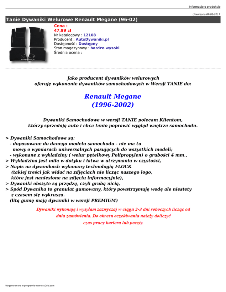 Informacje o produkcie Utworzono 07-03-2017 Tanie Dywaniki Welurowe Renault Megane (96-02) Cena : 47,99 zł Nr katalogowy : 12108 Producent : AutoDywaniki.pl Dostępność : Dostępny Stan magazynowy : bardzo wysoki Średnia ocena : Jako producent dywaników welurowych oferuję wykonanie dywaników samochodowych w Wersji TANIE do: Renault Megane (1996-2002) Dywaniki Samochodowe w wersji TANIE polecam Klientom, którzy sprzedają auto i chca tanio poprawić wygląd wnętrza samochodu. > Dywaniki Samochodowe są: - dopasowane do danego modelu samochodu - nie ma tu mowy o wymiarach uniwersalnych pasujących do wszystkich modeli; - wykonane z wykładziny ( welur pętelkowy Polipropylen) o grubości 4 mm., > Wykładzina jest miła w dotyku i łatwa w utrzymaniu w czystości, > Napis na dywanikach wykonany technologią FLOCK (takiej treści jak widać na zdjęciach nie licząc naszego logo, które jest naniesione na zdjęciu informacyjnie), > Dywaniki obszyte są przędzą, czyli grubą nicią, > Spód Dywanika to granulat gumowany, który powstrzymuję wodę ale niestety z czasem się wykrusza. (litą gumę mają dywaniki w wersji PREMIUM) Wygenerowano w programie www.oscGold.com Informacje o produkcie Wygenerowano w programie www.oscGold.com Dostępne opcje Tanie Dywaniki Welurowe Renault Megane (96-02) » Kolor Dywanika: Czarny, Antracyt, Jasny Grafit (szary). » Kolor Obszyć: Czarny, Czerwony, Grafitowy, Piaskowy, Brązowy, Granatowy, Niebieski, Szary, Zielony, Żółty, Biały, Jasno Szary. » Kolor Napisów: Szary, Jasno Szary (siwy), Grafitowy, Czarny, Czerwony, Granatowy, Niebieski, Zielony, Piaskowy, Żółty, Brązowy, Bez Napisów taniej (-5,00 zł), Biały. » Komplet: Przód i Tył 4szt., Przód 2 szt. taniej (-11,00 zł).