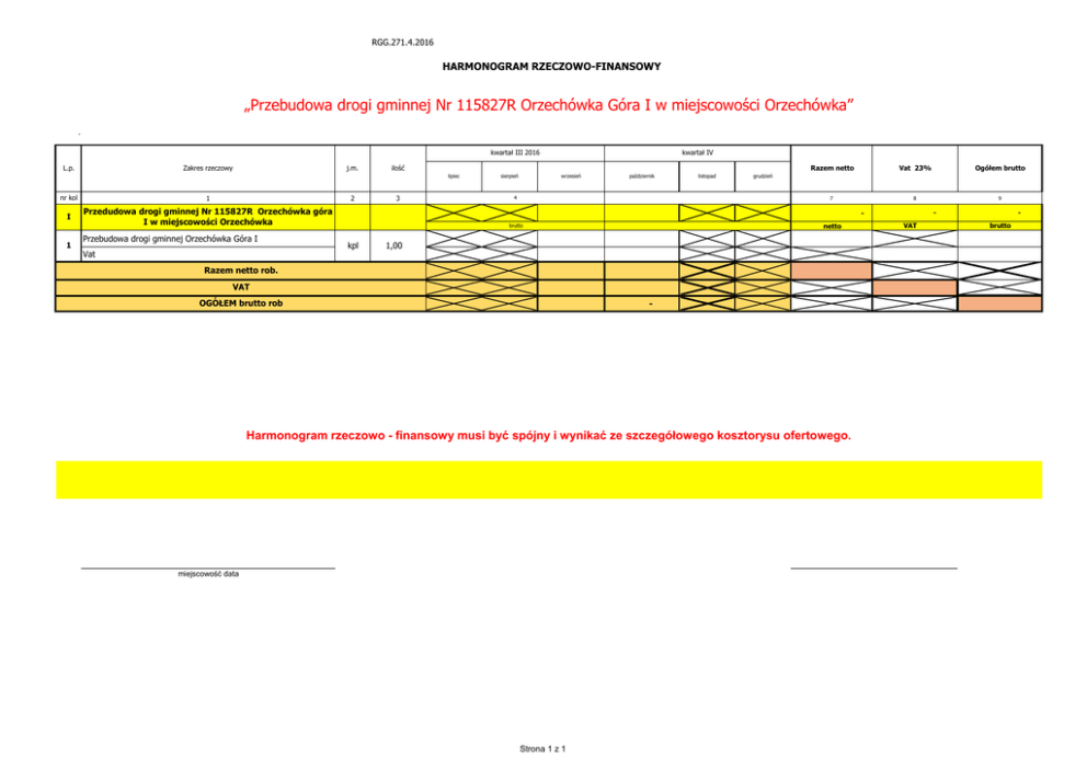 RGG.271.4.2016 HARMONOGRAM RZECZOWO-FINANSOWY „Przebudowa drogi gminnej Nr 115827R Orzechówka Góra I w miejscowości Orzechówka” 2 kwartał III 2016 L.p. Zakres rzeczowy j.m. 1 I Przedudowa drogi gminnej Nr 115827R Orzechówka góra I w miejscowości Orzechówka 1 2 Przebudowa drogi gminnej Orzechówka Góra I Vat 3 Vat 23% Razem netto lipiec nr kol kwartał IV ilość sierpień wrzesień październik 4 listopad 7 8 netto kpl 9 - brutto Ogółem brutto grudzień VAT brutto - 1,00 Razem netto rob. VAT OGÓŁEM brutto rob - Harmonogram rzeczowo - finansowy musi być spójny i wynikać ze szczegółowego kosztorysu ofertowego. miejscowość data Strona 1 z 1
