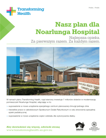 Transforming Health Polski / Polish Nasz plan dla Noarlunga Hospital Najlepsza opieka. Za pierwszym razem. Za każdym razem. W ramach planu Transforming Health, rząd stanowy inwestuje 7 milionów dolarów w modernizację pomieszczeń Noarlunga Hospital, włączając w to: >> wyposażenie w nowe urządzenia specjalnego centrum planowanej chirurgii jednego dnia >> niewielkie prace w całodobowym Społecznym Dziale Ratunkowym w celu stworzenia specjalnej opieki pediatrycznej >> wyposażenie w nowe urządzenia części oddziału dla wykonywania dializy. Aby dowiedzieć się więcej, odwiedź stronę www.transforminghealth.sa.gov.au Budowanie na naszej inwestycji Od 2002 r. w Noarlunga Hospital zainwestowaliśmy: >> 12,5 miliona dolarów w utworzenie GP Plus Super Clinic >> 3,3 miliona dolarów w unowocześnienie oddziału zdrowia psychicznego Morier >> 4,3 miliona dolarów w nowe, 15-łóżkowe pomieszczenie dla przejściowego oddziału zdrowia psychicznego na terenie szpitala Noarlunga Hospital zawsze będzie częścią lokalnej społeczności W Noarlunga Hospital będą nadal świadczone usługi zdrowotne. Jeśli potrzebujesz opieki w nagłych wypadkach, usług zdrowia psychicznego lub dializy, nadal będziesz mógł je otrzymać w Noarlunga Hospital. Będziemy również oferować więcej opieki w domu, byś mógł przebywać z bliskimi w znajomym otoczeniu. >> 4 miliony w nowe, 20-łóżkowe Społeczne Centrum Rehabilitacyjne na terenie przylegającym do szpitala. Obecnie chcemy w oparciu o tę inwestycję mieć pewność, że nasz system zapewni stałą, wysokiej jakości opiekę za pierwszym i za każdym razem. strona 2 Szybsze leczenie problemów zdrowia psychicznego Miejscowe usługi z zakresu zdrowia psychicznego będą nadal świadczone w Noarlunga Hospital. Oznaczać to będzie więcej bezpośrednich przyjęć do łóżek i mniej czasu spędzanego na oddziałach ratunkowych. Krótszy czas oczekiwania na planowane operacje i mniej anulacji Operacje planowane są często opóźniane w naszych szpitalach. Z tego powodu planujemy zapewnienie centrum planowanej chirurgii jednego dnia na unowocześnionej przestrzeni w Noarlunga Hospital. Tworząc oddzielne, wyspecjalizowane strumienie dla chirurgii planowanej, zamierzamy zmniejszyć liczbę anulacji, skrócić listy oczekujących i zapewnić lepiej zaplanowaną i lepiej kierowaną opiekę dla pacjentów. Poprawa usług ambulansów 15 milionów dolarów zostanie zainwestowane w zapewnienie większej liczby ambulansów i ich załóg oraz powiększenie nowej stacji ambulansów w Noarlunga. Szybka pomoc w nagłych wypadkach, 24 godziny na dobę, 7 dni w tygodniu Społeczny Oddział Ratunkowy Noarlunga Hospital zapewniać będzie całodobową opiekę ratunkową, włącznie z opieką pediatryczną w nagłych wypadkach. Społeczny Oddział Ratunkowy pozostanie na miejscu w Noarlunga Hospital, wraz z lekarzami i pielęgniarkami. Oznacza to, że jeśli twoje dziecko czuje się niedobrze, albo, jeżeli złamiesz rękę grając w piłkę nożną, zostaniesz nadal przyjęty w Noarlunga Hospital 24 godziny na dobę, 7 dni w tygodniu. W stosownych przypadkach, ambulans zabierze cię do Noarlunga Hospital. W nagłych wypadkach należy zawsze zadzwonić pod trzy zera (000). strona 3 Najlepsza z dostępnych opieka specjalistyczna W poważnych nagłych przypadkach, takich, jak wypadek samochodowy, atak serca lub udar, nie zostaniesz zabrany do Noarlunga Hospital. Zostaniesz natomiast przewieziony do dużego Oddziału Ratunkowego w szpitalu takim, jak Flinders Medical Centre. Szpitale te zapewniają na miejscu doświadczonych lekarzy i pielęgniarki 24 godziny na dobę, jak również dostęp do wszystkich pomocy diagnostycznych potrzebnych w ich specjalizacjach, co znaczy, że znajdziesz się we właściwym miejscu by otrzymać najlepszą opiekę od pierwszego razu. Podobnie, jeżeli wymagasz planowanej operacji, która jest często wykonywana jedynie raz w życiu, będziesz musiał się udać do właściwego szpitala dla tego typu operacji, jak na przykład do Noarlunga Hospital w przypadku chirurgii jednego dnia lub do Queen Elizabeth Hospital w przypadku konieczności wielodniowej chirurgii. Jest tak dlatego, że doświadczenie pokazuje, że najlepsze wyniki przynosi zajęcie się sprawą przez specjalistę, który leczy „krytyczną masę” pacjentów z podobnymi potrzebami, raczej, niż, gdy przyjmuje tylko kilku pacjentów rocznie. Inwestujemy w opiekę zdrowotną mieszkańców Australii Południowej W ramach Transforming Health: >> zainwestujemy ponad 250 milionów dolarów w poprawę stanowej infrastruktury zdrowotnej >> będziemy dbać o naszych weteranów inwestując do 15 milionów dolarów w Ośrodek Rozwoju Technologicznego w celu leczenia stresu pourazowego i zapewniania większej ilości usług bliżej domu >> będziemy inwestować znaczne sumy na zwiększenie ilości pracowników ambulansów i zapewnienie dodatkowych ambulansów >> będziemy zapewniać lepsze usługi zdrowia psychicznego dzięki większej ilości przyjęć do szpitali i skracaniu pobytów na oddziałach ratunkowych >> będziemy tworzyć centra specjalistyczne chirurgii planowanej, udarowej, uszkodzeń kręgosłupa i mózgu, choroby serca i choroby płuc. Zmiany te nie nastąpią natychmiast Będziemy cię informowali o wszelkich zmianach w Noarlunga Hospital, zanim one nastąpią. W celu uzyskania dodatkowych informacji odwiedź stronę internetową: transforminghealth.sa.gov.au wyślij e-maila na: [email protected] zadzwoń pod telefon bezpłatny: 1800 557 004 © Department for Health and Ageing, Government of South Australia. All rights reserved. FIS: 14096.48 March 2015 www.ausgoal.gov.au/creative-commons Public-I3-A2