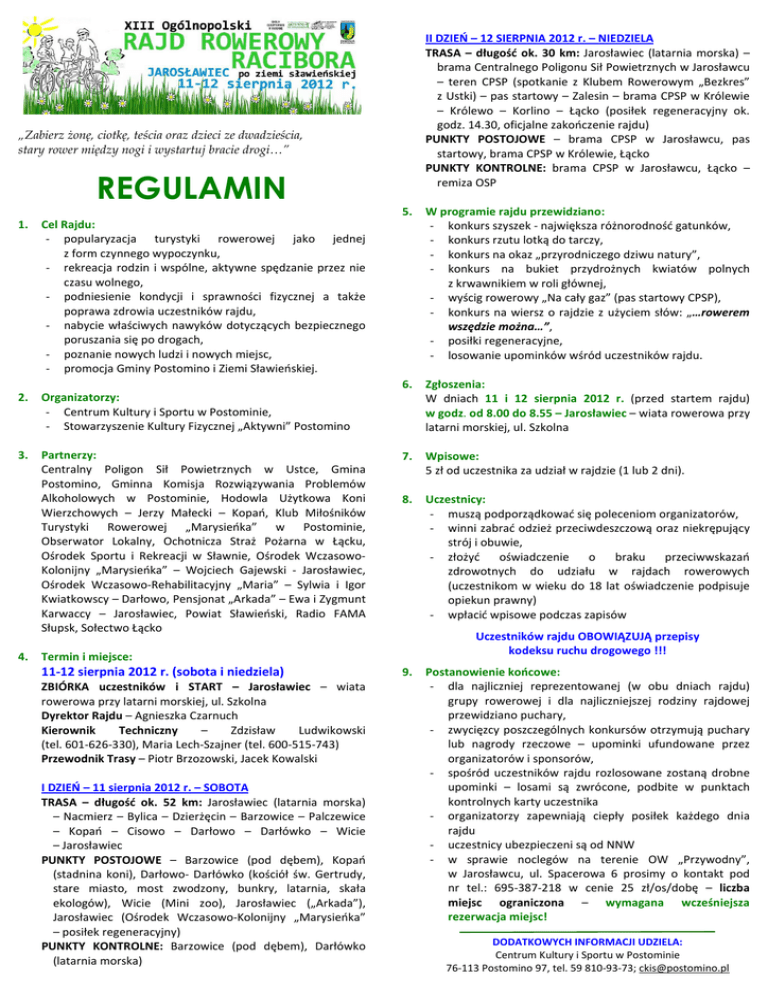 II DZIEŃ – 12 SIERPNIA 2012 r. – NIEDZIELA TRASA – długość ok. 30 km: Jarosławiec (latarnia morska) – brama Centralnego Poligonu Sił Powietrznych w Jarosławcu – teren CPSP (spotkanie z Klubem Rowerowym „Bezkres” z Ustki) – pas startowy – Zalesin – brama CPSP w Królewie – Królewo – Korlino – Łącko (posiłek regeneracyjny ok. godz. 14.30, oficjalne zakończenie rajdu) PUNKTY POSTOJOWE – brama CPSP w Jarosławcu, pas startowy, brama CPSP w Królewie, Łącko PUNKTY KONTROLNE: brama CPSP w Jarosławcu, Łącko – remiza OSP „Zabierz żonę, ciotkę, teścia oraz dzieci ze dwadzieścia, stary rower między nogi i wystartuj bracie drogi…” REGULAMIN 1. Cel Rajdu: - popularyzacja turystyki rowerowej jako jednej z form czynnego wypoczynku, - rekreacja rodzin i wspólne, aktywne spędzanie przez nie czasu wolnego, - podniesienie kondycji i sprawności fizycznej a także poprawa zdrowia uczestników rajdu, - nabycie właściwych nawyków dotyczących bezpiecznego poruszania się po drogach, - poznanie nowych ludzi i nowych miejsc, - promocja Gminy Postomino i Ziemi Sławieńskiej. 2. Organizatorzy: - Centrum Kultury i Sportu w Postominie, - Stowarzyszenie Kultury Fizycznej „Aktywni” Postomino 3. Partnerzy: Centralny Poligon Sił Powietrznych w Ustce, Gmina Postomino, Gminna Komisja Rozwiązywania Problemów Alkoholowych w Postominie, Hodowla Użytkowa Koni Wierzchowych – Jerzy Małecki – Kopań, Klub Miłośników Turystyki Rowerowej „Marysieńka” w Postominie, Obserwator Lokalny, Ochotnicza Straż Pożarna w Łącku, Ośrodek Sportu i Rekreacji w Sławnie, Ośrodek WczasowoKolonijny „Marysieńka” – Wojciech Gajewski - Jarosławiec, Ośrodek Wczasowo-Rehabilitacyjny „Maria” – Sylwia i Igor Kwiatkowscy – Darłowo, Pensjonat „Arkada” – Ewa i Zygmunt Karwaccy – Jarosławiec, Powiat Sławieński, Radio FAMA Słupsk, Sołectwo Łącko 4. 5. W programie rajdu przewidziano: - konkurs szyszek - największa różnorodność gatunków, - konkurs rzutu lotką do tarczy, - konkurs na okaz „przyrodniczego dziwu natury”, - konkurs na bukiet przydrożnych kwiatów polnych z krwawnikiem w roli głównej, - wyścig rowerowy „Na cały gaz” (pas startowy CPSP), - konkurs na wiersz o rajdzie z użyciem słów: „…rowerem wszędzie można…”, - posiłki regeneracyjne, - losowanie upominków wśród uczestników rajdu. 6. Zgłoszenia: W dniach 11 i 12 sierpnia 2012 r. (przed startem rajdu) w godz. od 8.00 do 8.55 – Jarosławiec – wiata rowerowa przy latarni morskiej, ul. Szkolna 7. Wpisowe: 5 zł od uczestnika za udział w rajdzie (1 lub 2 dni). 8. Uczestnicy: - muszą podporządkować się poleceniom organizatorów, - winni zabrać odzież przeciwdeszczową oraz niekrępujący strój i obuwie, - złożyć oświadczenie o braku przeciwwskazań zdrowotnych do udziału w rajdach rowerowych (uczestnikom w wieku do 18 lat oświadczenie podpisuje opiekun prawny) - wpłacić wpisowe podczas zapisów Uczestników rajdu OBOWIĄZUJĄ przepisy kodeksu ruchu drogowego !!! Termin i miejsce: 11-12 sierpnia 2012 r. (sobota i niedziela) ZBIÓRKA uczestników i START – Jarosławiec – wiata rowerowa przy latarni morskiej, ul. Szkolna Dyrektor Rajdu – Agnieszka Czarnuch Kierownik Techniczny – Zdzisław Ludwikowski (tel. 601-626-330), Maria Lech-Szajner (tel. 600-515-743) Przewodnik Trasy – Piotr Brzozowski, Jacek Kowalski I DZIEŃ – 11 sierpnia 2012 r. – SOBOTA TRASA – długość ok. 52 km: Jarosławiec (latarnia morska) – Nacmierz – Bylica – Dzierżęcin – Barzowice – Palczewice – Kopań – Cisowo – Darłowo – Darłówko – Wicie – Jarosławiec PUNKTY POSTOJOWE – Barzowice (pod dębem), Kopań (stadnina koni), Darłowo- Darłówko (kościół św. Gertrudy, stare miasto, most zwodzony, bunkry, latarnia, skała ekologów), Wicie (Mini zoo), Jarosławiec („Arkada”), Jarosławiec (Ośrodek Wczasowo-Kolonijny „Marysieńka” – posiłek regeneracyjny) PUNKTY KONTROLNE: Barzowice (pod dębem), Darłówko (latarnia morska) 9. Postanowienie końcowe: - dla najliczniej reprezentowanej (w obu dniach rajdu) grupy rowerowej i dla najliczniejszej rodziny rajdowej przewidziano puchary, - zwycięzcy poszczególnych konkursów otrzymują puchary lub nagrody rzeczowe – upominki ufundowane przez organizatorów i sponsorów, - spośród uczestników rajdu rozlosowane zostaną drobne upominki – losami są zwrócone, podbite w punktach kontrolnych karty uczestnika - organizatorzy zapewniają ciepły posiłek każdego dnia rajdu - uczestnicy ubezpieczeni są od NNW - w sprawie noclegów na terenie OW „Przywodny”, w Jarosławcu, ul. Spacerowa 6 prosimy o kontakt pod nr tel.: 695-387-218 w cenie 25 zł/os/dobę – liczba miejsc ograniczona – wymagana wcześniejsza rezerwacja miejsc! DODATKOWYCH INFORMACJI UDZIELA: Centrum Kultury i Sportu w Postominie 76-113 Postomino 97, tel. 59 810-93-73; [email protected]