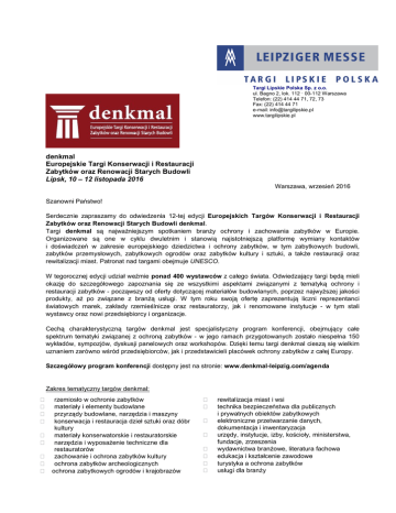Targi Lipskie Polska Sp. z o.o. ul. Bagno 2, lok. 112 · 00-112 Warszawa Telefon: (22) 414 44 71, 72, 73 Fax: (22) 414 44 71 e-mail: [email protected] www.targilipskie.pl denkmal Europejskie Targi Konserwacji i Restauracji Zabytków oraz Renowacji Starych Budowli Lipsk, 10 – 12 listopada 2016 Warszawa, wrzesień 2016 Szanowni Państwo! Serdecznie zapraszamy do odwiedzenia 12-tej edycji Europejskich Targów Konserwacji i Restauracji Zabytków oraz Renowacji Starych Budowli denkmal. Targi denkmal są najważniejszym spotkaniem branży ochrony i zachowania zabytków w Europie. Organizowane są one w cyklu dwuletnim i stanowią najistotniejszą platformę wymiany kontaktów i doświadczeń w zakresie europejskiego dziedzictwa i ochrony zabytków, w tym zabytkowych budowli, zabytków przemysłowych, zabytkowych ogrodów oraz zabytków kultury i sztuki, a także restauracji oraz rewitalizacji miast. Patronat nad targami obejmuje UNESCO. W tegorocznej edycji udział weźmie ponad 400 wystawców z całego świata. Odwiedzający targi będą mieli okazję do szczegółowego zapoznania się ze wszystkimi aspektami związanymi z tematyką ochrony i restauracji zabytków - począwszy od oferty dotyczącej materiałów budowlanych, poprzez najwyższej jakości produkty, aż po związane z branżą usługi. W tym roku swoją ofertę zaprezentują liczni reprezentanci światowych marek, zakłady rzemieślnicze oraz restauratorzy, jak i renomowane instytucje - w tym stali wystawcy oraz nowi przedsiębiorcy i organizacje. Cechą charakterystyczną targów denkmal jest specjalistyczny program konferencji, obejmujący całe spektrum tematyki związanej z ochroną zabytków - w jego ramach przygotowanych zostało niespełna 150 wykładów, sympozjów, dyskusji panelowych oraz workshopów. Dzięki temu targi denkmal cieszą się wielkim uznaniem zarówno wśród przedsiębiorców, jak i przedstawicieli placówek ochrony zabytków z całej Europy. Szczegółowy program konferencji dostępny jest na stronie: www.denkmal-leipzig.com/agenda Zakres tematyczny targów denkmal: rzemiosło w ochronie zabytków materiały i elementy budowlane przyrządy budowlane, narzędzia i maszyny konserwacja i restauracja dzieł sztuki oraz dóbr kultury materiały konserwatorskie i restauratorskie narzędzia i wyposażenie techniczne dla restauratorów zachowanie i ochrona zabytków kultury ochrona zabytków archeologicznych ochrona zabytkowych ogrodów i krajobrazów rewitalizacja miast i wsi technika bezpieczeństwa dla publicznych i prywatnych obiektów zabytkowych elektroniczne przetwarzanie danych, dokumentacja i inwentaryzacja urzędy, instytucje, izby, kościoły, ministerstwa, fundacje, zrzeszenia wydawnictwa branżowe, literatura fachowa edukacja i kształcenie zawodowe turystyka a ochrona zabytków usługi dla branży Do grona odwiedzających należą architekci, planiści, inżynierowie budownictwa, restauratorzy, konserwatorzy, przedstawiciele samorządów, wykonawcy inwestycji prywatnych, publicznych i kościelnych oraz inwestorzy i właściciele zabytkowych obiektów. Zapraszamy do bezpłatnego udziału w Międzynarodowej Giełdzie Kooperacji CONTACT, organizowanej w ramach światowej sieci enterprise europe network. Jej celem jest stworzenie wymiany kontaktów, usług, produktów oraz know-how dla wszystkich podmiotów reprezentujących branżę ochrony zabytków, konserwacji i restauracji, a także rewitalizacji miast i modernizacji budynków. W giełdzie udział biorą firmy, instytucje oraz zakłady z całej Europy. Zgłoszenie udziału w giełdzie możliwe jest do dnia 30 września 2016 roku - należy wypełnić on-line formularz profilu firmy, który znajduje się na: www.hwk-leipzig.de/contact-denkmal. Bilety wstępu na targi dostępne są w naszym sklepie internetowym: www.bilety.targilipskie.pl w cenach: Bilet na całe targi Bilet normalny jednodniowy Bilet ulgowy/grupowy jednodniowy* 170,00 zł 72,00 zł 36,00 zł * bilet ulgowy przysługuje uczniom i studentom na podstawie ważnej legitymacji oraz emerytom, rencistom i osobom niepełnosprawnym. * bilet grupowy – powyżej 10 osób. Miejsce odbywania się targów: Lipskie Tereny Targowe, Hala 2 oraz CCL - Lipskie Centrum Kongresowe Godziny otwarcia targów: 10. - 12.11.2016: od 9:30 do 18:00 W tym samym terminie odbędą się Branżowe Targi Budownictwa z Gliny Lehmbau oraz Branżowe Targi Technik Muzealniczych i Wystawienniczych MUTEC. Więcej informacji: www.targi-denkmal.pl, www.denkmal-leipzig.de. W przypadku dodatkowych pytań, prosimy o kontakt z naszym przedstawicielstwem. Z wyrazami szacunku Sylwia Petrażycka Manager ds. targów Targi Lipskie Polska Sp. z o.o.