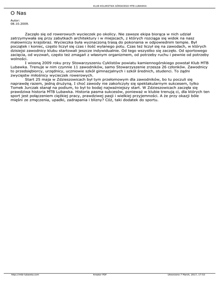 KLUB KOLARSTWA GÓRSKIEGO MTB LUBAWKA O Nas Autor: 08.10.2009. Zaczęło się od rowerowych wycieczek po okolicy. Nie zawsze ekipa biorąca w nich udział zatrzymywała się przy zabytkach architektury i w miejscach, z których rozciąga się widok na nasz malowniczy krajobraz. Wycieczka była wyznaczoną trasą do pokonania w odpowiednim tempie. Był początek i koniec, często liczył się czas i ilość wylanego potu. Czas też liczył się na zawodach, w których dzisiejsi zawodnicy klubu startowali jeszcze indywidualnie. Od tego wszystko się zaczęło. Od sportowego zacięcia, od wyzwań, często też zmagań z własnym organizmem, od potrzeby ruchu i pewnie od potrzeby wolności. I wiosną 2009 roku przy Stowarzyszeniu Cyklistów powiatu kamiennogórskiego powstał Klub MTB Lubawka. Trenuje w nim czynnie 11 zawodników, samo Stowarzyszenie zrzesza 26 członków. Zawodnicy to przedsiębiorcy, urzędnicy, uczniowie szkół gimnazjalnych i szkół średnich, studenci. To żądni zwycięstw miłośnicy wycieczek rowerowych. Start 25 maja w Zdzieszowicach był tym przełomowym dla zawodników, bo tu poczuli się naprawdę razem, jedną drużyną. I choć zawody nie zakończyły się spektakularnym sukcesem, tylko Tomek Jurczak stanął na podium, to był to bodaj najważniejszy start. W Zdzieszowicach zaczęła się prawdziwa historia MTB Lubawka. Historia pasma sukcesów, ponieważ w klubie trenują ci, dla których ten sport jest połączeniem ciężkiej pracy, prawdziwej pasji i wielkiej przyjemności. A że przy okazji bóle mięśni ze zmęczenia, upadki, zadrapania i blizny? Cóż, taki dodatek do sportu. http://mtb-lubawka.com Kreator PDF Utworzono 7 March, 2017, 17:53