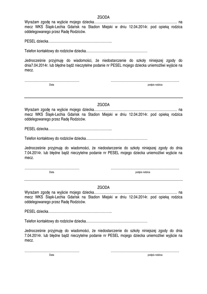 ZGODA Wyrażam zgodę na wyjście mojego dziecka……………………….……………………………………… na mecz WKS Śląsk-Lechia Gdańsk na Stadion Miejski w dniu 12.04.2014r. pod opieką rodzica oddelegowanego przez Radę Rodziców. PESEL dziecka……………………………………………….. Telefon kontaktowy do rodziców dziecka……………………………………………… Jednocześnie przyjmuję do wiadomości, że niedostarczenie do szkoły niniejszej zgody do dnia7.04.2014r. lub błędne bądź nieczytelne podanie nr PESEL mojego dziecka uniemożliwi wyjście na mecz. ………………………………………… …………………………………………………… Data podpis rodzica ZGODA Wyrażam zgodę na wyjście mojego dziecka……………………….……………………………………… na mecz WKS Śląsk-Lechia Gdańsk na Stadion Miejski w dniu 12.04.2014r. pod opieką rodzica oddelegowanego przez Radę Rodziców. PESEL dziecka……………………………………………….. Telefon kontaktowy do rodziców dziecka……………………………………………… Jednocześnie przyjmuję do wiadomości, że niedostarczenie do szkoły niniejszej zgody do dnia 7.04.2014r. lub błędne bądź nieczytelne podanie nr PESEL mojego dziecka uniemożliwi wyjście na mecz. ………………………………………… …………………………………………………… Data podpis rodzica ZGODA Wyrażam zgodę na wyjście mojego dziecka……………………….……………………………………… na mecz WKS Śląsk-Lechia Gdańsk na Stadion Miejski w dniu 12.04.2014r. pod opieką rodzica oddelegowanego przez Radę Rodziców. PESEL dziecka……………………………………………….. Telefon kontaktowy do rodziców dziecka……………………………………………… Jednocześnie przyjmuję do wiadomości, że niedostarczenie do szkoły niniejszej zgody do dnia 7.04.2014r. lub błędne bądź nieczytelne podanie nr PESEL mojego dziecka uniemożliwi wyjście na mecz. ………………………………………… Data …………………………………………………… podpis rodzica