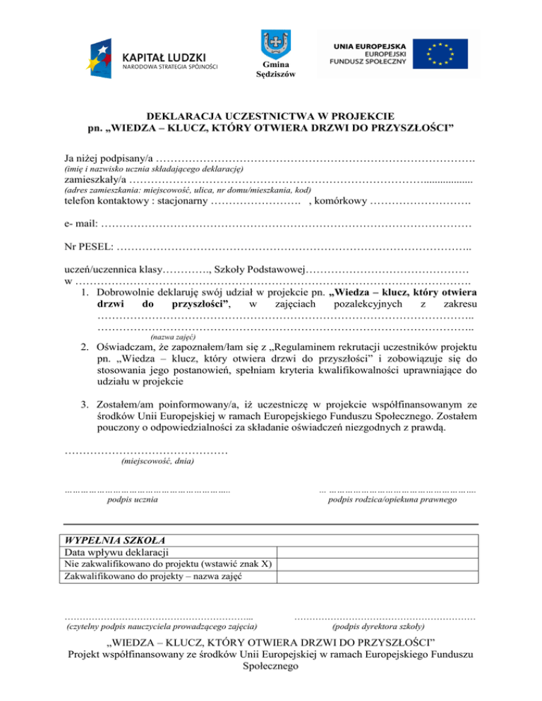Gmina Sędziszów DEKLARACJA UCZESTNICTWA W PROJEKCIE pn. „WIEDZA – KLUCZ, KTÓRY OTWIERA DRZWI DO PRZYSZŁOŚCI” Ja niżej podpisany/a ……………………………………………………………………………. (imię i nazwisko ucznia składającego deklarację) zamieszkały/a ……………………………………………………………………….................. (adres zamieszkania: miejscowość, ulica, nr domu/mieszkania, kod) telefon kontaktowy : stacjonarny ……………………. , komórkowy ………………………. e- mail: ………………………………………………………………………………………… Nr PESEL: …………………………………………………………………………………….. uczeń/uczennica klasy…………., Szkoły Podstawowej……………………………………… w ………………………………………………………………………………………………. 1. Dobrowolnie deklaruję swój udział w projekcie pn. „Wiedza – klucz, który otwiera drzwi do przyszłości”, w zajęciach pozalekcyjnych z zakresu ………………………………………………………………………………………….. ………………………………………………………………………………………….. (nazwa zajęć) 2. Oświadczam, że zapoznałem/łam się z „Regulaminem rekrutacji uczestników projektu pn. „Wiedza – klucz, który otwiera drzwi do przyszłości” i zobowiązuje się do stosowania jego postanowień, spełniam kryteria kwalifikowalności uprawniające do udziału w projekcie 3. Zostałem/am poinformowany/a, iż uczestniczę w projekcie współfinansowanym ze środków Unii Europejskiej w ramach Europejskiego Funduszu Społecznego. Zostałem pouczony o odpowiedzialności za składanie oświadczeń niezgodnych z prawdą. ……………………………………… (miejscowość, dnia) …………………………………………………….. podpis ucznia ... ………………………………………………. podpis rodzica/opiekuna prawnego WYPEŁNIA SZKOŁA Data wpływu deklaracji Nie zakwalifikowano do projektu (wstawić znak X) Zakwalifikowano do projekty – nazwa zajęć ……………………………………………………... (czytelny podpis nauczyciela prowadzącego zajęcia) …………………………………………………… (podpis dyrektora szkoły) „WIEDZA – KLUCZ, KTÓRY OTWIERA DRZWI DO PRZYSZŁOŚCI” Projekt współfinansowany ze środków Unii Europejskiej w ramach Europejskiego Funduszu Społecznego