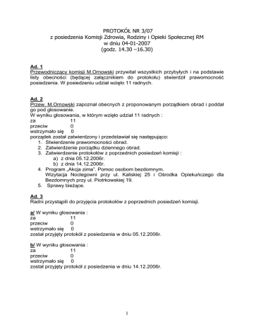 PROTOKÓŁ NR 3/07 z posiedzenia Komisji Zdrowia, Rodziny i Opieki Społecznej RM w dniu 04-01-2007 (godz. 14.30 –16.30) Ad. 1 Przewodniczący komisji M.Ornowski przywitał wszystkich przybyłych i na podstawie listy obecności (będącej załącznikiem do protokołu) stwierdził prawomocność posiedzenia. W posiedzeniu udział wzięło 11 radnych. Ad. 2 Przew. M.Ornowski zapoznał obecnych z proponowanym porządkiem obrad i poddał go pod głosowanie. W wyniku głosowania, w którym wzięło udział 11 radnych : za 11 przeciw 0 wstrzymało się 0 porządek został zatwierdzony i przedstawiał się następująco: 1. Stwierdzenie prawomocności obrad. 2. Zatwierdzenie porządku dziennego obrad. 3. Zatwierdzenie protokołów z poprzednich posiedzeń komisji : a) z dnia 05.12.2006r. b) z dnia 14.12.2006r. 4. Program „Akcja zima”. Pomoc osobom bezdomnym. Wizytacja Noclegowni przy ul. Kaliskiej 25 i Ośrodka Opiekuńczego dla Bezdomnych przy ul. Piotrkowskiej 19. 5. Sprawy bieżące. Ad. 3 Radni przystąpili do przyjęcia protokołów z poprzednich posiedzeń komisji. a/ W wyniku głosowania : za 11 przeciw 0 wstrzymało się 0 został przyjęty protokół z posiedzenia w dniu 05.12.2006r. b/ W wyniku głosowania : za 11 przeciw 0 wstrzymało się 0 został przyjęty protokół z posiedzenia w dniu 14.12.2006r. 1 Ad. 4 Radni przystąpili do realizacji kolejnego punktu porządku obrad i przeprowadzili wizytację Noclegowni przy ul. Kaliskiej 25 i Ośrodka Opiekuńczego dla Bezdomnych przy ul. Piotrkowskiej 19. Następnie w ośrodku przy ul. Piotrkowskiej odbyli część stacjonarną posiedzenia. Przew. M.Ornowski zapytał, jakie są zamiary wobec domu w Klimontowie. Z-ca Prez. Z.Jaskiernia odpowiedział, że tym domem była zainteresowana spółdzielnia socjalna. Poinformował, że temat był rozpatrywany na ostatnim kolegium. Przew. M.Ornowski ul.Piotrkowskiej. poprosił o zabranie głosu Kierownika ośrodka przy Kierownik Ośrodka Opiekuńczego dla Bezdomnych A.Kwiecień stwierdziła, że jest zadowolona z przeniesienia ośrodka z dniem 15 maja 2004r. do nowego budynku. Obecny obiekt jest tańszy medialnie. Ośrodek jest prowadzony oszczędnie i na bieżąco organizowane są spotkania z pensjonariuszami, stąd można było pod koniec roku zakupić kserokopiarkę, 40 kompletów pościeli, poduszki, kołdry. Obecnie w ośrodku przebywa 86 osób, w tym 20 kobiet i 8 dzieci. Dodała, że odbyło się spotkanie opłatkowe i zebranie dyscyplinujące na przyszły rok. Przedstawiła sposób funkcjonowania ośrodka, w którym obowiązuje regulamin a brama jest zamknięta od godziny 22-giej. Zauważyła, że zmiany w regulaminie dyktuje zachowanie mieszkańców, którzy przed przyjęciem do ośrodka podpisują jego znajomość. W ośrodku pracuje 11 osób w tym 6 opiekunów, psycholog, konserwator wyłoniony spośród mieszkańców, kierownik zespołu opiekuńczego. Poinformowała, że w dniu wczorajszym była w ośrodku interwencja policji z powodu agresywnej pensjonariuszki. Z-ca Dyr. MOPS W.Pawełek wtrąciła, że można pozyskać z Unii Europejskiej środki finansowe na wychodzenie z bezdomności. Kierownik A.Kwiecień stwierdziła, że jest bardzo przydatny zakupiony dla ośrodka fiat 126p. Przew. RM D.Miklasiński zapytał, jaki jest długi średni pobyt osoby w ośrodku ? Kierownik A.Kwiecień odpowiedziała, że zgodnie z regulaminem do 12 miesięcy, ale okres czasu można wydłużyć do czasu otrzymania mieszkania z MZZL. W zeszłym roku skorzystało z tego 11 osób do 8 mieszkań. Jakkolwiek bezdomni szukają mieszkań także we własnym zakresie. Radny T.Bańbuła zapytał, czy ten sam mieszkaniec ośrodka jest konserwatorem ? Kierownik A.Kwiecień odpowiedziała, że nie. 2 Przew. M.Ornowski stwierdził, że obecnie ośrodki dla bezdomnych spełniają w miarę dobrze swoje przeznaczenie i że podoba mu się działalność Punktu Aktywizacji Bezrobotnych. Stwierdził, że niedługo zostanie otwarta przy ul. Czystej pierwsza w Sosnowcu ogrzewalnia dla bezdomnych. Następnie radni przystąpili do omawiania tematu : Program „Akcja zima”. Pomoc osobom bezdomnym. Przedstawiciel MOPS B.Mikołajczyk przedstawiła temat (materiały w załączeniu do protokołu). Dodała, że problem stanowią powracające do Sosnowca bezdomne osoby posiadające poprzednie miejsce zamieszkania poza Sosnowcem. Poinformowała, że z powodu działań prowadzonych w celu przywrócenia osób bezdomnych społeczeństwu, ujawniła się większa liczba osób bezdomnych na terenie Sosnowca. Za-ca Dyr. MOPS W.Pawełek dodała, że w 2004 r. został zmieniona ustawowa definicja osoby bezdomnej, którą może być osoba posiadająca lokal mieszkalny nie spełniający warunków mieszkaniowych np. pozbawiony ogrzewania, ujęcia wodnego, zdewastowany. Dodała, że można obecnie z osobą bezdomną zawiązać kontrakt na mocy którego pomoc społeczna pomaga osobie bezdomnej w zamian za jej udział w programie, np. podjęcie pracy. Wyjaśniła, że ośrodek funkcjonuje długoterminowo i obejmuje pomocą osoby pracujące a noclegownia zapewnia schronienie. Uchwałą Rady Miejskiej określone są odpłatności za korzystanie z ośrodków tego typu, jeśli osoba bezdomna przekracza kryterium dochodowości. Osoba jest przyuczana do samodzielnego zamieszkiwania i ponoszenia kosztów mieszkania. Dodała, że na ośrodek trzeba sobie zasłużyć, wyjątkiem jest bezdomna matka z dzieckiem. Radny W.Suwalski poinformował, że doszły do niego informacje, że osoby bezdomne dewastują lokale otrzymane od MZZL. Za-ca Dyr. MOPS W.Pawełek odpowiedziała, że są to rzadkie przypadki powrotu do bezdomności. Gmina musi jednak zapewnić jeden posiłek dziennie, ubranie, schronienie i osoba taka trafia do noclegowni. Radny T. Bańbuła zauważył, że pomoc społeczna w mieście prowadzona jest w Sosnowcu przez różnorakie organizacje i miasto na wysokim poziomie. Zapytał, czy MOPS prowadzi dokumentację rzeczywistego stanu osób b