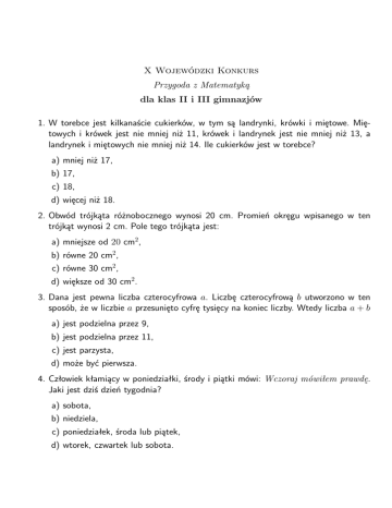 X Wojewódzki Konkurs Przygoda z Matematyką dla klas II i III gimnazjów 1. W torebce jest kilkanaście cukierków, w tym są landrynki, krówki i miętowe. Miętowych i krówek jest nie mniej niż 11, krówek i landrynek jest nie mniej niż 13, a landrynek i miętowych nie mniej niż 14. Ile cukierków jest w torebce? a) mniej niż 17, b) 17, c) 18, d) więcej niż 18. 2. Obwód trójkąta różnobocznego wynosi 20 cm. Promień okręgu wpisanego w ten trójkąt wynosi 2 cm. Pole tego trójkąta jest: a) mniejsze od 20 cm2, b) równe 20 cm2, c) równe 30 cm2, d) większe od 30 cm2. 3. Dana jest pewna liczba czterocyfrowa a. Liczbę czterocyfrową b utworzono w ten sposób, że w liczbie a przesunięto cyfrę tysięcy na koniec liczby. Wtedy liczba a + b a) jest podzielna przez 9, b) jest podzielna przez 11, c) jest parzysta, d) może być pierwsza. 4. Człowiek kłamiący w poniedziałki, środy i piątki mówi: Wczoraj mówiłem prawdę. Jaki jest dziś dzień tygodnia? a) sobota, b) niedziela, c) poniedziałek, środa lub piątek, d) wtorek, czwartek lub sobota. 5. Mamy do dyspozycji drut o długości 50 cm. Tworzymy z niego szkielet graniastosłupa prawidłowego sześciokątnego o całkowitych długościach krawędzi (jednostką długości są centymetry). Nie musimy wykorzystywać całego drutu. Ile różnych takich szkieletów można utworzyć? a) 8, b) 10, c) 12, d) więcej niż 12. 6. Dowolny kwadrat dzielimy na kwadraty mniejsze niekoniecznie tej samej wielkości. Wskaż zdanie fałszywe: a) istnieje podział na k kwadratów, jeśli k jest sześcianem liczby naturalnej, b) istnieje podział na k kwadratów wtedy i tylko wtedy, gdy k jest kwadratem liczby naturalnej, c) istnieje podział na k kwadratów dla każdej liczby naturalnej n > 5, d) nie istnieje podział na pewną liczbę naturalną większą niż 4. 7. Kwadrat pewnej liczby naturalnej n jest podzielny przez 30 i 12. Spośród liczb 2,3,4,8,15,18,20,25,30,45,60,90,120 wybieramy te, przez które podzielna jest liczba n. Wybranych liczb jest: a) nie więcej niż 6, b) więcej niż 6, ale nie wiecej niż 8, c) więcej niż 8, ale nie wiecej niż 10, d) więcej niż 10. 8. Z 60 kwadratów o obwodzie 8 cm każdy zbudowano prostokąt. Ile prostokątów o różnym obwodzie da się zbudować z tych kwadratów, jeśli zawsze wykorzystujemy wszystkie kwadraty? a) 6, b) 8, c) 10, d) więcej niż 10. 9. Równanie |1717 + √ 3 − x| = 0 a) ma trzy rozwiązania, b) ma dwa rozwiązania, c) ma jedno rozwiązanie, d) nie ma rozwiązań. 10. Dana jest liczba a = 36 + 35 + 34. Aby otrzymać liczbę a należy: a) dodać do siebie liczbę 3 dokładnie 13 · 27 razy, b) dodać do siebie liczbę 9 dokładnie 13 · 27 razy, c) dodać do siebie liczbę 3 dokładnie 324 razy, d) żadna z powyższych odpowiedzi nie jest poprawna. 11. W pewnym wielokącie wypukłym liczba przekątnych jest 5 razy większa od liczby boków. Liczba boków tego wielokąta: a) może być równa 17, b) może być liczbą parzystą, c) jest równa 13, d) jest mniejsza od 13. 12. Liczby a i b są całkowite oraz a2 + b2 jest podzielne przez 3. Wtedy: a) jedna z liczb a lub b może przy dzieleniu przez 3 dawać resztę 2, b) jedna z liczb a lub b może przy dzieleniu przez 3 dawać resztę 1, c) liczby a i b muszą dawać różne reszty z dzielenia przez 3, d) przynajmniej jedna z liczb a lub b musi być podzielna przez 3. 13. Ile można narysować kwadratów, których wierzchołkami są kropki przedstawionej kwadratowej siatki? a) nie więcej niż 36, b) więcej niż 36, ale nie więcej niż 40, c) więcej niż 40, ale nie więcej niż 46, d) więcej niż 46. 14. Wybieramy ciąg liczb spośród liczb 1,2,3,4,5,6,7,8 zgodnie z następującymi zasadami: druga liczba jest większa od pierwszej oraz każda liczba począwszy od trzeciej jest większa od sumy dwóch poprzednich liczb. Ile jest możliwych ciągów tego rodzaju złożonych z co najmniej trzech liczb? a) mniej niż 16, b) 16, c) więcej niż 16, ale nie więcej niż 24, d) więcej niż 24. 15. Na planszy pewnej gry wyznaczono 12 torów oznaczonych numerami 1-12. Tor zaczyna się startem a kończy metą. Pomiędzy nimi jest 10 pól do przejścia. Stawiamy po jednym pionku na każdym z torów. Rzucamy dwoma sześciennymi kostkami a suma wyrzuconych oczek oznacza numer toru, z którego pionek posuwa się do przodu o jedno pole. Rzucamy do momentu aż pewien pionek dojdzie do mety i tym samym wygra. a) istnieją dokładnie dwa tory, na których ustawione pionki nigdy nie wygrają, b) najczęściej wygrywać będą pionki ustawione na torach o numerach parzystych, c) najczęściej wygrywać będą pionki stojące na torach o numerach większych niż 8 d) najczęściej wygrywać będzie pionek stojący na torze o numerze 7.