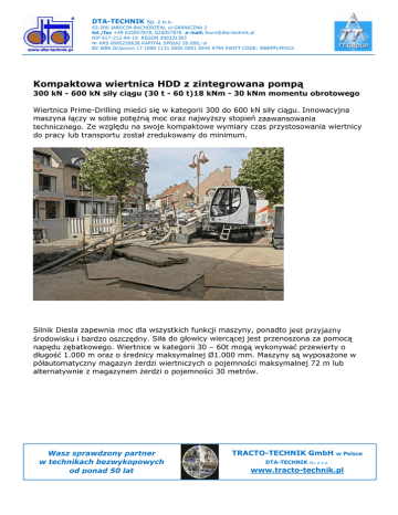 DTA-TECHNIK Sp. z o.o. 63-200 JAROCIN-BACHORZEW, ul.GRANICZNA 2 tel./fax +48 625057878, 625057876 e-mail: [email protected] NIP 617-212-84-10 REGON 300331383 Nr KRS 0000258638 KAPITAŁ SPÓŁKI 50.000,-zł BZ WBK O/Jarocin 17 1090 1131 0000 0001 0545 9794 SWIFT CODE: WBKPPLPPXXX Kompaktowa wiertnica HDD z zintegrowana pompą 300 kN - 600 kN siły ciągu (30 t - 60 t)18 kNm - 30 kNm momentu obrotowego Wiertnica Prime-Drilling mieści się w kategorii 300 do 600 kN siły ciągu. Innowacyjna maszyna łączy w sobie potężną moc oraz najwyższy stopień zaawansowania technicznego. Ze względu na swoje kompaktowe wymiary czas przystosowania wiertnicy do pracy lub transportu został zredukowany do minimum. Silnik Diesla zapewnia moc dla wszystkich funkcji maszyny, ponadto jest przyjazny środowisku i bardzo oszczędny. Siła do głowicy wiercącej jest przenoszona za pomocą napędu zębatkowego. Wiertnice w kategorii 30 – 60t mogą wykonywać przewierty o długość 1.000 m oraz o średnicy maksymalnej Ø1.000 mm. Maszyny są wyposażone w półautomatyczny magazyn żerdzi wiertniczych o pojemności maksymalnej 72 m lub alternatywnie z magazynem żerdzi o pojemności 30 metrów. Wasz sprawdzony partner w technikach bezwykopowych od ponad 50 lat TRACTO-TECHNIK GmbH DTA-TECHNIK w Polsce Sp. z o.o. www.tracto-technik.pl DTA-TECHNIK Sp. z o.o. 63-200 JAROCIN-BACHORZEW, ul.GRANICZNA 2 tel./fax +48 625057878, 625057876 e-mail: [email protected] NIP 617-212-84-10 REGON 300331383 Nr KRS 0000258638 KAPITAŁ SPÓŁKI 50.000,-zł BZ WBK O/Jarocin 17 1090 1131 0000 0001 0545 9794 SWIFT CODE: WBKPPLPPXXX Kabina posiada ergonomiczny fotel, ogrzewanie i radio w standardzie. Dodatkowe opcje, takie jak klimatyzacja, rejestrator przewiertu itp. są dostępne na życzenie. Szczególną cechą naszej kompaktowej wiertnicy jest pompa "na pokładzie". Oszczędza miejsce w czasie transportu i na budowie, a także oferuje większą elastyczność. PRIME-DRILLING SWOJE INNOWACJE PREZENTOWAŁ NA WYSTAWIE INTERMAT PRIME-DRILLING prezentował najnowszą innowację – PRIME PIPE PUSHER podczas wystawy Intermat w Paryżu, która odbyła się w 2012 roku. Prime Pipe Pusher służy głównie jako dodatkowy wspomagacz siły ciągu wciąganej rury, ale również oferuje idealne rozwiązanie dla maszyn wykonujących tuneling. Wasz sprawdzony partner w technikach bezwykopowych od ponad 50 lat TRACTO-TECHNIK GmbH DTA-TECHNIK w Polsce Sp. z o.o. www.tracto-technik.pl DTA-TECHNIK Sp. z o.o. 63-200 JAROCIN-BACHORZEW, ul.GRANICZNA 2 tel./fax +48 625057878, 625057876 e-mail: [email protected] NIP 617-212-84-10 REGON 300331383 Nr KRS 0000258638 KAPITAŁ SPÓŁKI 50.000,-zł BZ WBK O/Jarocin 17 1090 1131 0000 0001 0545 9794 SWIFT CODE: WBKPPLPPXXX PRIME DRILLING® może się pochwalić dostawą ponad 150 systemów wiertniczych, które pracują niemalże na wszystkich kontynentach. 30 letnie doświadczenie w produkcji wiertnic horyzontalnych pozwala z pewnością zaspokoić najbardziej wymagających klientów z międzynarodowego przemysłu HDD. Przemyślana konstrukcja jest zawsze przyjazna operatorom, a obsługa serwisowa na placu budowy, wykonywana często we własnym zakresie, nie stanowi żadnego problemu. Zawsze wspieramy klientów wiedzą i doświadczeniem podczas planowania i realizacji projektu. Najważniejszym celem dla nas jest zadowolenie naszych Klientów, dlatego podchodzimy do każdego indywidualnie, aby zaoferować produkty najlepiej dostosowane do potrzeb. Wysoka jakość, niezawodność oraz zastosowanie prostych i sprawdzonych rozwiązań technicznych zyskało uznanie na całym świecie, a szczególnie zostało docenione w niegościnnych i ekstremalnie trudnych rejonach Alaski, Arktyki i Syberii. Wasz sprawdzony partner w technikach bezwykopowych od ponad 50 lat TRACTO-TECHNIK GmbH DTA-TECHNIK w Polsce Sp. z o.o. www.tracto-technik.pl