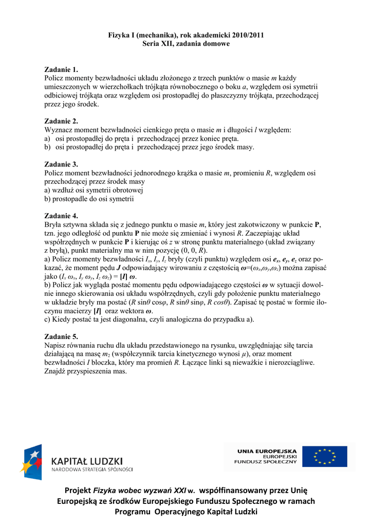 Fizyka I (mechanika), rok akademicki 2010/2011 Seria XII, zadania domowe Zadanie 1. Policz momenty bezwładności układu złożonego z trzech punktów o masie m każdy umieszczonych w wierzchołkach trójkąta równobocznego o boku a, względem osi symetrii odbiciowej trójkąta oraz względem osi prostopadłej do płaszczyzny trójkąta, przechodzącej przez jego środek. Zadanie 2. Wyznacz moment bezwładności cienkiego pręta o masie m i długości l względem: a) osi prostopadłej do pręta i przechodzącej przez koniec pręta. b) osi prostopadłej do pręta i przechodzącej przez jego środek masy. Zadanie 3. Policz moment bezwładności jednorodnego krążka o masie m, promieniu R, względem osi przechodzącej przez środek masy a) wzdłuż osi symetrii obrotowej b) prostopadle do osi symetrii Zadanie 4. Bryła sztywna składa się z jednego punktu o masie m, który jest zakotwiczony w punkcie P, tzn. jego odległość od punktu P nie może się zmieniać i wynosi R. Zaczepiając układ współrzędnych w punkcie P i kierując oś z w stronę punktu materialnego (układ związany z bryłą), punkt materialny ma w nim pozycję (0, 0, R). a) Policz momenty bezwładności Ix, Iy, Iz bryły (czyli punktu) względem osi ex, ey, ez oraz pokazać, że moment pędu J odpowiadający wirowaniu z częstością ω=(ωx,ωy,ωz) można zapisać jako (Ix ωx, Iy ωy, Iz ωz) = [I] ω. b) Policz jak wygląda postać momentu pędu odpowiadającego częstości ω w sytuacji dowolnie innego skierowania osi układu współrzędnych, czyli gdy położenie punktu materialnego w układzie bryły ma postać (R sinθ cosφ, R sinθ sinφ, R cosθ). Zapisać tę postać w formie iloczynu macierzy [I] oraz wektora ω. c) Kiedy postać ta jest diagonalna, czyli analogiczna do przypadku a). Zadanie 5. Napisz równania ruchu dla układu przedstawionego na rysunku, uwzględniając siłę tarcia działającą na masę m2 (współczynnik tarcia kinetycznego wynosi µ), oraz moment bezwładności I bloczka, który ma promień R. Łączące linki są nieważkie i nierozciągliwe. Znajdź przyspieszenia mas. Projekt Fizyka wobec wyzwań XXI w. współfinansowany przez Unię Europejską ze środków Europejskiego Funduszu Społecznego w ramach Programu Operacyjnego Kapitał Ludzki Zadanie 6 (Jojo) Na obu końcach, poziomego, jednorodnego, masywnego walca o promieniu R przymocowano nieważkie krążki o promieniu r < R tak, że ich osie pokrywają się z osią walca. Na każdy z krążków nawinięto nieważką nić w taki sposób, że obie nici mogą się swobodnie odwijać, gdy walec został na nich zawieszony w polu siły ciężkości o natężeniu g. Znaleźć przyspieszenie z jakim zawieszony walec opuszcza się w trakcie odwijania nici. Znaleźć prędkość kątową do jakiej rozpędzi się nieruchomy początkowo walec opuszczając się z wysokości H oraz prędkość środka masy, jaką wtedy uzyska. Zadanie 7 Klocek o masie m1 przywiązany jest do wiotkiej, nierozciągliwej i nieważkiej nici, którą przewieszono przez krążki dwóch zamocowanych pod sufitem bloczków, z których każdy ma masę M i promień R, a do drugiego końca nici przymocowano drugi klocek o masie m2. Oba bloczki są jednorodnymi walcami mogącymi się swobodnie obracać wokół swych poziomych osi symetrii, a każdy z nich ma zatem moment bezwładności I = 0.5∙M∙R2. Układ znajduje się w jednorodnym polu siły ciężkości o natężeniu g. Policzyć przyspieszenie a z jakim poruszają się klocki, znaleźć jego wartość liczbową, gdy m1 = 1 kg, m2 = 2 kg, M = 1 kg, g = 10m/s2 oraz określić w którą stronę w takim przypadku następuje ten ruch, jeśli układ początkowo spoczywał. Zadanie 8. Jednorodny krążek o masie M leży płasko na gładkiej poziomej płaszczyźnie, po której może się poruszać bez tarcia. Na brzegu krążka zamocowana jest punktowa masa m. Punktowy pocisk o masie m nadlatuje z prędkością V styczną do obwodu krążka i zatrzymuje się tuż pod jego powierzchnią (patrz rysunek). Oblicz: a) z jaką prędkością liniową i jaką prędkością kątową zacznie poruszać się krążek po zderzeniu? b) jaka część energii kinetycznej pocisku zamienia się na energię kinetyczną ruchu postępowego krążka, a jaka obrotowego? Projekt Fizyka wobec wyzwań XXI w. jest wspierany przez Europejski Fundusz Społeczny w ramach Programu Operacyjnego Kapitał Ludzki Zadanie 9. Płaski krążek o masie m i promieniu R zawieszony jest na stałej osi prostopadłej do jego powierzchni w jednorodnym polu grawitacyjnym. Jak będzie zależała częstość drgań własnych Ω tego krążka od odległości zawieszenia od środka jego masy? W jakim punkcie należy zawiesić wahadło, aby częstość drgań własnych krążka była największa? Jaka jest długość zredukowana tego wahadła? Projekt Fizyka wobec wyzwań XXI w. współfinansowany przez Unię Europejską ze środków Europejskiego Funduszu Społecznego w ramach Programu Operacyjnego Kapitał Ludzki