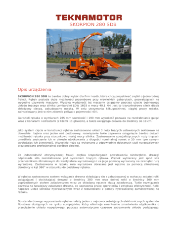 SKORPION 280 SDB Opis urządzenia SKORPION 280 SDB to bardzo dobry wybór dla firm i osób, które chcą pozyskiwać zrębki o jednorodnej frakcji. Rębak posiada duże możliwości przerobowe przy niewielkich gabarytach, pozwalających na wygodne używanie maszyny. Wysoką wydajność tej maszyny osiągamy poprzez użycie bębnowego układu tnącego oraz silnika Lombardini LDW 1603 o mocy 40,1 KM. Jest to trzycylindrowy silnik diesla chłodzony cieczą, zabudowany maską. W celu utrzymania kilkugodzinnej, ciągłej pracy rębaka, zainstalowany jest w nim zbiornik paliwa o pojemności 40 l. Gardzieli rębaka o wymiarach 265 mm szerokość i 190 mm wysokość pozwala na rozdrabnianie gałęzi wraz z konarami i odrostami (z liśćmi i z igliwiem), a także okrągłego drewna do średnicy do 18 cm. Jako system cięcia w konstrukcji rębaka zastosowano układ 3 noży tnących ustawionych sektorowo na obwodzie bębna oraz jeden nóż podporowy, rozwiązanie takie zapewnia osiągnięcie bardzo dużych możliwości rębaka przy stosunkowo małej mocy silnika. Zastosowanie specjalistycznych noży tnących umożliwia zostrzenie ich w okresie użytkowania z długości nominalnej nawet o 20 mm tym samym wydłużając ich żywotność. Wszystkie noże są wykonane z odpowiednio dobranych stali narzędziowych oraz poddane profesjonalnej obróbce cieplnej. Za jednorodność otrzymywanej frakcji zrębka (zapobieganie powstawaniu niedorębów, drzazg) odpowiada sito zainstalowane pod systemem tnącym rębaka. Zrębek wybierany jest spod sita przenośnikiem ślimakowym do wentylatora wyrzutowego i za jego pomocą wyrzucany na zewnątrz rurą wyrzutową. Zastosowana w rębaku rura wyrzutowa obracana jest ręcznie za pomocą ślimakowej obrotnicy o kąt 360° w stosunku do podstawy rębaka. W rębaku zastosowano system wciągania drewna składający się z zabudowanej w wahaczu zębatej rolki wciągającej i dociskającej drewno o średnicy 280 mm oraz dolnej rolki o średnicy 200 mm poprzedzonych stołem załadowczym wraz ze składaną ręcznie klapą załadowczą. Takie rozwiązanie pozwala na łatwiejszy załadunek drewna, co usprawnia pracę operatorów i zwiększa efektywność. Rolki napędza układ silników hydraulicznych wraz z reduktorami z pompy hydraulicznej zamontowanej na rębaku. Do standardowego wyposażenia rębaka należy jeden z najnowocześniejszych elektronicznych systemów No-stress dostępnych na rynku europejskim, który eliminuje ewentualne zmartwienia użytkownika o przeciążenie układu napędowego, poprzez automatyczne czasowe zatrzymanie układu podającego. Edytowalne oprogramowanie systemu antyprzeciążeniowego No-stress pozwala w prosty sposób na zmianę ustawień pracy maszyny i dostosowanie do indywidualnych potrzeb. Program „grube drewno”, „cienkie drewno” umożliwia szybką zmianę trybu pracy rębaka celem dostosowania do aktualnie rozdrabnianego materiału i efektywniejszej pracy rębaka. System ten ma wbudowany licznik motogodzin. Ze względu na oczekiwania użytkowników, rębak Skorpion 280 SDB otrzymał europejską homologację, która pozwala na rejestrację maszyny i dopuszczenie do ruchu drogowego. Konstrukcja rębaka osadzona jest na podwoziu jednoosiowym, wyposażonym w hamulec najazdowy i postojowy oraz zaczep holowniczy pod sworzeń kulisty lub uchwyt oczkowy. Rębak w formie przyczepy specjalnej pozwala na szybkie przemieszczanie się między miejscami pracy. Rębak wyposażony jest w nowoczesne LED-owe oświetlenie drogowe. Uzyskany poprzez proces zrębkowania zrębek może zostać wykorzystany do bezpośredniego spalania w piecach, do produkcji kompostu, do celów dekoracyjnych oraz po wtórnym rozdrobnieniu przez młyn bijakowy jako surowiec do produkcji brykietu i pelletu. Dane techniczne MODEL URZĄDZENIA Gabaryty (dł. x szer. x wys.) [mm] Waga [kg] Średnica rozdrabnianego materiału [mm] Ilość noży[szt.] Szybkość podawania [mb/min] Wydajność zrębkowania [m3/h] Szerokość zrębka [mm] Sposób podawania Średnica cięcia bębna [mm] Wymiary gardzieli (szer. x wys.) [mm] Sito - oczko [mm] SKORPION 280 SDB 3750 (4460)* x 1810 x 2300 (3100)* 1550 180 3 tnące + 1 podporowy do 22 do 10 do 25 mm w zależności od materiału dwie rolki o napędzie hydraulicznym 420 265 x 190 od 30 do 50 DANE TECHNICZNE SILNIKA Typ Pojemność skokowa [cm3] Moc silnika [KM] Rodzaj chłodzenia Rodzaj paliwa Pojemność zbiornika paliwa [l] Max. zużycie paliwa [l/h] LOMBARDINI 1603 1649 40,1 ciecz olej napędowy 40 6 ()* - wymiar po rozłożeniu. Wyposażenie standardowe: Koło zapasowe Rura wyrzutowa ze ślimakową obrotnicą 360°, deflektor. Nowoczesne LED-owe oświetlenie drogowe. Własny system hydrauliczny. System antyprzeciążeniowy No–stress z licznikiem motogodzin. Składana rura wyrzutowa. Powered by TCPDF (www.tcpdf.org)