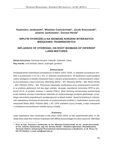 Ochrona Środowiska i Zasobów Naturalnych nr 52, 2012 r. Kazimierz Jankowski*, Wiesław Czeluściński*, Jacek Sosnowski*, Jolanta Jankowska*, Dorota Herda* WPŁYW HYDROŻELU NA BIOMASĘ KORZENI WYBRANYCH MIESZANEK TRAWNIKOWYCH INFLUENCE OF HYDROGEL ON ROOT BIOMASS OF DIFERENT LAWN MIXTURES Słowa kluczowe: biomasa korzeni, trawniki, hydrożel, trawy. Key words: root biomas, lawns, hydrogel, grasess. Streszczenie Doświadczenie trawnikowe prowadzono w latach 2002-2004, w układzie losowanych bloków o powierzchni 4 m2 (4 x 1m), w czterech powtórzeniach. W badaniach wykorzystano cztery dostępne w handlu mieszanki traw o różnym przeznaczeniu i zróżnicowanym udziale procentowym Lolium perenne: Wembley (80%) – M1; Parkowa (60%) – M2; Relax (40%) – M3 i Półcień (20%) – M4. Powyższe mieszanki użytkowano przy zastosowaniu hydrożelu w podłożu glebowym lub bez jego udziału, stosując nawożenie mineralne NPK w proporcji 6:2:4, w postaci nawozu o nazwie Pokon. Ilość biomasy korzeniowej wytwarzanej przez badane murawy trawnikowe zależała od zastosowanego podłoża glebowego i przebiegu warunków pogodowych występujących w latach badań. Spośród badanych mieszanek największą biomasę korzeniową na zastosowanym podłożu z hydrożelem wytworzyła mieszanki Relax (M3) i Półcień (M4), z 40 i 20% udziałem życicy trwałej, a więc mieszanki o mniejszym procentowym udziale życicy trwałej. Summary Lawn experience was conducted in the years 2002-2004, on the experimental plots. In the study were used four mixture of grasses with different percentage of Lolium perenne: Wembley * Prof. dr hab. Kazimierz Jankowski, dr inż. Wiesław Czeluściński, dr inż. Jacek Sosnowski, dr inż. Jolanta Jankowska, mgr inż. Dorota Herda – Katedra Łąkarstwa i Kształtowania Terenów Zieleni, Uniwersytet Przyrodniczo-Humanistyczny w Siedlcach, ul. B. Prusa 14, 08-110 Siedlce; e-mail: [email protected] 79 Kazimierz Jankowski i in. (80%) - M1 and Parkowa (60%) - M2; Relax (40%) - M3 and Półcień (20%) - M4. Those mixtures were used in the subsoil with a hydrogel or without his participation. At the end of each growing period in all plots from object the samples of turf with the root system were taken. Number of root biomass produced by the tested lawn turf was depended on the used hydrogel and weather conditions occurred during the study (especially for longer sustained drought). Among the tested mixtures the largest root biomass on substrate with the hydrogel produced mixtures with 20 and 40% share of ryegrass. 1. WPROWADZENIE Biomasa korzeniowa stanowi najważniejszy element stabilizujący tereny zadarnione. Trawy posiadają największe znaczenie w ograniczaniu ujemnego wpływu erozji, ponieważ mają mocny system korzeniowy i wykształcają gęstą i zwartą darń [Domański 1995; Frey i Mizianty 2006; Kozłowski 2000; Wolski 2006]. W procesie darniowym właściwy rozwój wiązkowego systemu korzeniowego jest zasadniczym elementem stabilizującym podłoże horyzontalnie i pionowo. Korzenie traw są zwykle rozmieszczone horyzontalnie, ale tworzą również silnie rozwiniętą i głęboką, ortotropowo rozmieszczoną masę korzeniową [Turgeon 2005; Wolski 2006]. Zbiorowiska traw są bardzo wrażliwe na intensywność użytkowania, m.in. częste koszenie. To również oddziałuje na zmiany ilości biomasy korzeniowej (głównie jej redukcji), a także na rozmieszczenie korzeni traw w profilu glebowym [Pielota, Smucker 1995]. Według Pechačkova i Krahulec [1995] na regularnie koszonych łąkach ogólna biomasa podziemna bywa prawie dwukrotnie większa niż na łąkach niekoszonych lub koszonych nieregularnie. Rozmieszczenie w profilu glebowym korzeni traw wykazuje znaczne odchylenia mimo, że główna masa korzeniowa mieści się w warstwie do 20 cm [Rychnowska 1983]. Znajomość ilości aktywnych, żywych korzeni i ich rozkładu w profilu glebowym różnych stanowisk, a także informacja o ilości rezerwowych substancji akumulowanych w podziemnych organach roślin, dostarczają danych istotnych do porównania trwałości różnych stanowisk w aspekcie różnych zdarzeń zachodzących w danym siedlisku. Z powyższych badań wynika, że na wytwarzanie masy korzeniowej traw duży wpływ ma wiele czynników, zarówno pratotechnicznych, jak i pogodowych. Jednak w literaturze brak jest danych na temat oddziaływania hydrożelu umieszczonego w podłożu na ilość masy korzeniowej muraw trawnikowych. Dlatego też celem prezentowanej pracy było określenie wpływu hydrożelu na intensywność korzenienia się czterech zróżnicowanych mieszanek trawnikowych. 2. MATERIAŁ I METODY Doświadczenie trawnikowe prowadzono w latach 2002-2004, na poletkach doświadczalnych Katedry Łąkarstwa i Kształtowania Terenów Zieleni, w układzie losowanych bloków o powierzchni 4 m2 (4 x 1m), w czterech powtórzeniach. W badaniach wykorzystano 80 Wpływ hydrożelu na biomasę korzeni wybranych mieszanek trawnikowych cztery dostępne w handlu mieszanki traw o różnym przeznaczeniu i zróżnicowanym udziale procentowym Lolium perenne: Wembley (80%) – M1; Parkowa (60%) – M2; Relax (40%) – M3 i Półcień (20%) – M4. Mieszanki te użytkowano przy zastosowaniu hydrożelu w podłożu glebowym lub bez jego udziału, stosując nawożenie mineralne NPK w proporcji 6:2:4, w postaci nawozu o nazwie Pokon. W kombinacji z hydrożelem stosowano poliakrylamid granulowany, o nazwie handlowej Aqua-Gel P4. Preparat ten, w ilości 0,05 kg/m2, umieszczono na głębokości 5–10 cm pod powierzchnią gleby. Pod koniec każdego okresu wegetacji ze wszystkich badanych poletek pobierano próbki darni wraz z systemem korzeniowym do głębokości 10 cm. Na podstawie pobranych próbek darni w każdym roku badawczym oceniano suchą masę korzeni, stosując metodę badania systemów korzeniowych [Böhm 1985]. Dane meteorologiczne z lat 2002-2004 uzyskano ze Stacji Hydrologiczno-Meteorologicznej w Siedlcach. W celu okre