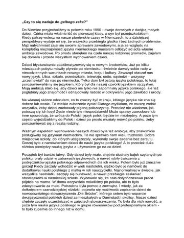 „Czy to się nadaje do gelbego zaka?” Do Niemiec przyjechaliśmy w połowie roku 1990 - dwoje dorosłych z dwójką małych dzieci. Córka miała właśnie iść do pierwszej klasy, a syn był przedszkolakiem. Kiedy patrzę wstecz na nasze pionierskie czasy w Niemczech, to z dzisiejszej perspektywy wydaje mi się, że wszystko przebiegło gładko i bez żadnych problemów. Mąż natychmiast zajął się swoimi sprawami zawodowymi, a ja ze względu na kompletną nieznajomość języka niemieckiego musiałam odłożyć ad acta własne ambicje zawodowe. Po prostu stanęłam na czele naszej rodzinnej gromadki, zajęłam się domem i przede wszystkim wychowaniem dzieci. Dzieci błyskawicznie zaaklimatyzowały się w nowym środowisku. Już po kilku miesiącach pobytu mówiły płynnie po niemiecku i świetnie dawały sobie radę w niecodziennych warunkach nowego miasta, kraju i kultury. Zewsząd otaczał nas nowy język. Ulica, szkoła, przedszkole, telewizja, radio, sąsiedzi – wszyscy „przemawiali” do nas po niemiecku. Tylko dom był ostoją języka polskiego, to tutaj porozumiewaliśmy się językiem, który był dla naszej czwórki językiem ojczystym. Moją ambicją stało się, aby dzieci nie tylko nie zapomniały języka polskiego, ale też pogłębiały jego znajomość i odnajdowały radość w odkrywaniu jego zawiłości i urody. Na własnej skórze odczułam, co to znaczy żyć w kraju, którego języka nie zna się dobrze lub wcale. To wielkie zubożenie życia! Dlatego myślałam, że muszę zrobić wszystko, żeby dzieci zachowały piękną polszczyznę. Przecież nie wiadomo, jak potoczą się ich losy! Życie niesie tyle niespodzianek! Może sprawy zawodowe lub inne spowodują, że wrócą do Polski i język polski będzie im niezbędny. A poza tym często wyjeżdżaliśmy do Polski i dzieci po prostu musiały mówić po polsku, żeby porozumiewać się z resztą rodziny. Ważnym aspektem wychowania naszych dzieci była też ambicja, aby znakomicie posługiwały się językiem niemieckim. To nie sprawiło nam wielu trudności. Dobre miejscowe szkoły, do których uczęszczały, wykonały swoje zadania bez zarzutu. Gorzej było z namówieniem dzieci do nauki języka polskiego! A to przecież duża różnica pomiędzy nauką języka a używaniem go na co dzień. Początek był bardzo łatwy. Gdy dzieci były małe, chętnie słuchały bajek czytanych po polsku, brały udział w zabawach językowych, a nawet robiły ćwiczenia z podręczników języka polskiego odpowiednich dla ich wieku. Potem było już znacznie gorzej! Kiedy zaczęły wchodzić w wiek nastoletni, ciężko było je namówić do dodatkowej nauki polskiego z matką w roli nauczycielki. Najnormalniej w świecie, jak wszystkie nastolatki, zaczęły się buntować, a nawet przebiegle zasłaniać obowiązkami w niemieckiej szkole. Wydawało się, że cała dotychczasowa praca pójdzie na marne. W domu oczywiście mówiliśmy po polsku, ale to było zdecydowanie za mało. Potrzebna była pomoc z zewnątrz. I wtedy, jak za dotknięciem czarodziejskiej różdżki, pojawiła się możliwość zapisania dzieci do nowopowstałego stowarzyszenia „Die Brücke”, którego celem było wsparcie dwujęzyczności polskich dzieci zamieszkałych w Darmstadt i okolicy. Nasze dzieci chętnie zaczęły uczestniczyć w zajęciach stowarzyszenia. To była dla nich nowość, a poza tym nauka języka polskiego w grupie rówieśników pod profesjonalnym okiem to było zupełnie co innego niż w domu. W tym czasie obraz Polski w Niemczech zaczął się diametralnie zmieniać. Zmiany polityczne, przygotowywania Polski do wstąpienia do Unii Europejskiej spowodowały wzrost zainteresowania naszym krajem. Wiele osób zaczęło odwiedzać Polskę i dostrzegać wielkie zmiany, jakie tam zachodziły. Zarówno w Polsce, jak i w Niemczech słyszałam zdania, jak to dobrze, że nasze dzieci doskonale posługują się zarówno językiem niemieckim, jak i polskim, i że to wielka wartość. Nie bez dumy odbierałam te opinie i bardzo się cieszyłam, że nigdy nie ustąpiłam i z uporem prowadziłam dzieci przez meandry dwujęzyczności. Stowarzyszenie „Die Brücke” było dla nas w tej kwestii wielkim wsparciem. Przede wszystkim dlatego, że zdecydowanie poszerzyło dzieciom horyzonty językowe. W warunkach domowych często posługujemy się skrótem myślowym, prostym codziennym językiem. To niestety powoduje zubożenie języka. Dlatego potrzeba dodatkowych bodźców, żeby wzbogacać język i rozbudzać ciekawość, a nawet radość poznawania coraz to nowych jego aspektów. I taką pomocniczą rolę spełniło w dwujęzycznym życiu naszych dzieci Die Brücke, za co jesteśmy wdzięczni z całego serca. Nasze dzieci są już dorosłymi ludźmi, wybrały zawody, w których przede wszystkim posługują się językiem niemieckim, ale zdarza się, że w swojej pracy wykorzystują znajomość języka polskiego. Język polski jest też dla nich pomostem do polskiej kultury i historii, do bycia Polakami w Niemczech. Oboje dzieci mieszka daleko od rodzinnego domu. Regularnie korespondujemy, często nas odwiedzają. Tak jak w pionierskich czasach naszego pobytu w Niemczech, komunikujemy się ze sobą tylko po polsku. Bez wątpienia nasze dzieci są osobami dwujęzycznymi. Oczywiście wciąż dbamy o to, aby ta dwujęzyczność nie wyglądała tak, jak w tytule tego tekstu. Elżbieta Heller, 2014 W mojej rodzinie nigdy nie było jakichkolwiek wątpliwości, że dzieci będą wychowywane dwujęzycznie - tym bardziej, że mój mąż pochodzi z takiej właśnie rodziny (matka jest Hiszpanką, a ojciec Niemcem), gdzie niestety tej możliwości nie wykorzystano. My nie chcieliśmy popełnić tego samego błędu. Od samego początku role między nami były wyraźnie podzielone: ja uczyłam dzieci języka polskiego, a mąż języka niemieckiego. Z zachwytem patrzyliśmy na ten fenomen, gdy dzieci bez większego wysiłku, w naturalny sposób odpowi