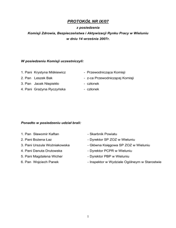 PROTOKÓŁ NR IX/07 z posiedzenia Komisji Zdrowia, Bezpieczeństwa i Aktywizacji Rynku Pracy w Wieluniu w dniu 14 września 2007r. W posiedzeniu Komisji uczestniczyli: 1. Pani Krystyna Miśkiewicz - Przewodnicząca Komisji 2. Pan Leszek Bak - z-ca Przewodniczącej Komisji 3. Pan Jacek Niepiekło - członek 4. Pani Grażyna Ryczyńska - członek Ponadto w posiedzeniu udział brali: 1. Pan Sławomir Kaftan - Skarbnik Powiatu 2. Pani Bożena Łaz - Dyrektor SP ZOZ w Wieluniu 3. Pani Urszula Woźniakowska - Główna Księgowa SP ZOZ w Wieluniu 4. Pani Danuta Drutowska - Dyrektor PCPR w Wieluniu 5. Pani Magdalena Wicher - Dyrektor PBP w Wieluniu 6. Pan Wojciech Panek - Inspektor w Wydziale Ogólneym w Starostwie 1 Proponowany porządek posiedzenia: 1. Otwarcie IX posiedzenia Komisji. 2. Stwierdzenie prawomocności obrad. 3. Przyjęcie porządku obrad. 4. Przyjęcie protokołu z VIII posiedzenia Komisji. 5. Przyjęcie informacji z wykonania budżetu powiatu wieluńskiego za I półrocze 2007r. wraz z informacją o przebiegu wykonania planu finansowego SP ZOZ w Wieluniu oraz Powiatowej Biblioteki Publicznej. 6. Przyjęcie informacji o realizacji kontraktów przez SP ZOZ w Wieluniu za I półrocze 2007r. 7. Zaopiniowanie projektu uchwały Rady Powiatu w Wieluniu w sprawie wyrażenia zgody na wynajem na okres do 10 lat w trybie bezprzetargowym części dachu budynku szpitala położonego w Wieluniu przy ulicy Szpitalnej 16. 8. Zaopiniowanie projektu uchwały Rady Powiatu w Wieluniu w sprawie podziału środków PFRON przypadających na teren powiatu wieluńskiego wg algorytmu w 2007r. na realizację zadań określonych w ustawie z dnia 27 sierpnia 1997r. o rehabilitacji zawodowej i społecznej oraz zatrudnianiu osób niepełnosprawnych. 9. Przyjęcie informacji o funkcjonowaniu i działaniach Powiatowego Centrum Zarządzania Kryzysowego w okresie od września 2006r. do września 2007r. 10. Sprawy bieżące. 11. Wolne wnioski i zapytania. 12. Zamknięcie IX posiedzenia Komisji. 2 Pkt 1 Otwarcie IX posiedzenia Komisji. Radna Krystyna Miśkiewicz – Przewodnicząca Komisji – otwieram IX posiedzenie Komisji Zdrowia, Bezpieczeństwa i Aktywizacji Rynku Pracy. Witam członków Komisji oraz zaproszonych gości. Pkt 2 Stwierdzenie prawomocności obrad. Radna Krystyna Miśkiewicz – Przewodnicząca Komisji – na 6 członków Komisji obecnych jest 4, czyli obrady są prawomocne. Pkt 3 Przyjęcie porządku obrad. Radna Krystyna Miśkiewicz – Przewodnicząca Komisji – otrzymaliście Państwo proponowany porządek posiedzenia. Czy są uwagi, propozycje zmian do porządku obrad? Nie widzę. Ponieważ Pan Wojciech Panek o godzinie 13.30 ma 3 zaplanowane kolejne spotkanie proponuję dotychczasowy punkt 9 – Przyjęcie informacji o funkcjonowaniu i działaniach Powiatowego Centrum Zarządzania Kryzysowego w okresie od września 2006r. do września 2007r. rozpatrzyć w punkcie 5. Pozostałe punkty ulegną przesunięciu. Kto z Państwa jest za przyjęciem proponowanego porządku obrad, proszę o podniesienie ręki. Członkowie Komisji Zdrowia, Bezpieczeństwa i Aktywizacji Rynku Pracy jednogłośnie przyjęli proponowany porządek posiedzenia (4 radnych głosowało). Przyjęty porządek posiedzenia: 1. Otwarcie IX posiedzenia Komisji. 2. Stwierdzenie prawomocności obrad. 3. Przyjęcie porządku obrad. 4. Przyjęcie protokołu z VIII posiedzenia Komisji. 5. Przyjęcie informacji o funkcjonowaniu i działaniach Powiatowego Centrum Zarządzania Kryzysowego w okresie od września 2006r. do września 2007r. 6. Przyjęcie informacji z wykonania budżetu powiatu wieluńskiego za I półrocze 2007r. wraz z informacją o przebiegu wykonania planu finansowego SP ZOZ w Wieluniu oraz Powiatowej Biblioteki Publicznej. 7. Przyjęcie informacji o realizacji kontraktów przez SP ZOZ w Wieluniu za I półrocze 2007r. 8. Zaopiniowanie projektu uchwały Rady Powiatu w Wieluniu w sprawie wyrażenia zgody na wynajem na okres do 10 lat w trybie bezprzetargowym części dachu budynku szpitala położonego w Wieluniu przy ulicy Szpitalnej 16. 9. Zaopiniowanie projektu uchwały Rady Powiatu w Wieluniu w sprawie podziału środków PFRON przypadających na teren powiatu wieluńskiego wg algorytmu w 2007r. na realizację zadań określonych w ustawie z dnia 27 sierpnia 1997r. o rehabilitacji zawodowej i społecznej oraz zatrudnianiu osób niepełnosprawnych. 10. Sprawy bieżące. 11. Wolne wnioski i zapytania. 12. Zamknięcie IX posiedzenia Komisji. 4 Pkt 4 Przyjęcie protokołu z VIII posiedzenia Komisji. Radna Krystyna Miśkiewicz – Przewodnicząca Komisji – protokół z VIII posiedzenia Komisji wyłożony był do wglądu. Czy są uwagi, zastrzeżenia do treści protokołu? Nie widzę. Kto jest za przyjęciem protokołu z VIII posiedzenia Komisji Zdrowia, Bezpieczeństwa i Aktywizacji Rynku Pracy, proszę o podniesienie ręki. Członkowie Komisji Zdrowia, Bezpieczeństwa i Aktywizacji Rynku Pracy jednogłośnie przyjęli protokół z VIII posiedzenia Komisji (4 radnych głosowało). Pkt 5 Przyjęcie informacji o funkcjonowaniu i działaniach Powiatowego Centrum Zarządzania Kryzysowego w okresie od września 2006r. do września 2007r. Radna Krystyna Miśkiewicz – Przewodnicząca Komisji – proszę Pana Wojciecha Panka o przedstawienie informacji na temat funkcjonowania Powiatowego Centrum Zarządzania Kryzysowego. Pan Wojciech Panek – Inspektor w Wydziale Ogólnym – Powiatowe Centrum Zarządzania Kryzysowego w Wieluniu wykonuje zadania, które polegają na codziennym przyjmowaniu meldunków z Komendy Powiatowej Policji, z Komendy Powiatowej PSP o stanie bezpieczeństwa i zagrożeniach, jakie wystąpiły na terenie powiatu w ciągu doby. PCZK monitoruje również stan łóżek w SP ZOZ Wieluń na podstawie informacji dziennych i dobowych. Ponadto prowadzona jest codzienna 5 łączność z Gminnymi Zespołami Reagowania Kryzysowego oraz z Wojewódzkim Centrum Zarządzania Kryzysowego w Łodzi. W ciągu roku Powiatowy Ze