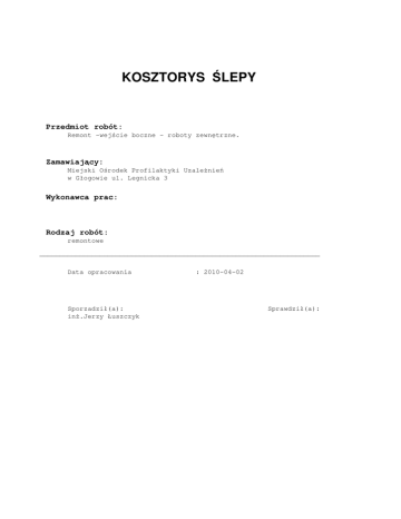 KOSZTORYS ŚLEPY Przedmiot robót: Remont -wejście boczne - roboty zewnętrzne. Zamawiający: Miejski Ośrodek Profilaktyki Uzależnień w Głogowie ul. Legnicka 3 Wykonawca prac: Rodzaj robót: remontowe ______________________________________________________________________ Data opracowania Sporzadził(a): inż.Jerzy Łuszczyk : 2010-04-02 Sprawdził(a): Charakterystyka robót 1.Kosztorys opracowano zgodnie z rozporządzeniem Ministra Infrastruktury z dnia 24.01.2004r. w sprawie metod i podstaw sporządzania kosztorysu inwestorskiego /Dz.U.nr 18 poz.172 z dnia 06.02.2004r./ 2.Miejski Ośrodek Profilaktyki Uzależnień znajduje się w Głogowie ul.Legnicka 4.Jest to budynek o konstrukcji tradycyjnej. Ściany murowane z cegły. Strop z płyt kanałowych. Dach płaski kryty papą termozgrzewalną. W budynku istnieją instalacje:wod.-kan.,c.o. i c.w. z węzła cieplnego,elektryczna. 3.Zakres robót objęty kosztorysem: - demontaż i montaż chodników, demontaż i montaż krawężników, demontaż i montaż barierek ochronnych, demontaż i montaż pokrywy nastudziennej, położenie płytek na schodach-antypoślizgowych, położenie płytek antypoślizgowych na podeście, gruntowanie i malowanie ścian elewacji, malowanie rur,krat,obróbek blacharskich, wymiana stolarki okiennej na PCV. 4.Podstawa sporządzenia kosztorysu inwestorskiego: - uzgodnienia z inwestorem, - nakłady rzeczowe wg:KNR 4-01,KNR 5-08,KNR 2-02,KNRW 4-03,KNR 4-02,KNR2-15,kalkulacje indywidualne 2-02,KNR Autorstwo programu: ZUI bluepoint*,tel.(068) 327-58-91 Przedmiot robót :Remont -wejście boczne - roboty zewnętrzne. - 1: MOPU-WEJŚCIE_BOCZNE-ROBOTY_ZEWNĘTRZNE_____________________________________________________________________________________________________________________________ Lp P R Z E D M I A R _____________________________________________________________________________________________________________________________ Element robót: 1 wejście boczne-roboty zewnętrzne. 1 KNR 231 T0815/01 Rozebranie chodników, wysepek przystankowych i przejść dla pieszych płyty betonowe 35x35x5 na podsypce piaskowej Obmiar : 0.9*2.7*2+2.9*1.4= 8,920 ____________ 8,920 [m2] _____________________________________________________________________________________________________________________________ 2 KNR 231 T0813/03 Rozebranie krawężników betonowych o wym. 15x30 cm na podsypce cementowo-piaskowej Obmiar : 2.9*2= 5,800 ____________ 5,800 [m] _____________________________________________________________________________________________________________________________ 3 KNR 231 T0812/03 Rozebranie ław pod krawężniki ławy z betonu Obmiar : 5.8*0.4*0.12+5.8*0.20*0.15= 0,452 ____________ 0,452 [m3] _____________________________________________________________________________________________________________________________ 4 KNR 231 T0402/03 Ławy pod krawężniki betonowa zwykła z betonu B-15 Obmiar : 2.9*0.4*0.15= 0,174 ____________ 0,174 [m3] _____________________________________________________________________________________________________________________________ 5 KNR 231 T0403/03 Krawężniki betonowe wystające o wym. 15x30 cm na podsypce cementowo-piaskowej Obmiar : 2,900 [m] _____________________________________________________________________________________________________________________________ 6 KNR 231 T0407/01 Obrzeża betonowe o wymiarach 20x6 cm na podsypce piaskowej z wypełnieniem spoin zaprawą cementową Obmiar : 2,900 [m] _____________________________________________________________________________________________________________________________ 7 KNR 231 T9003/03 Chodniki z kostki brukowej betonowej o grubości 6 cm,podsypka cementowo-piaskowa,prostokątna 20x10 cm Obmiar : 0.9*2.7*2+2.9*1.4+1.8*1.15= 10,990 ____________ 10,990 [m2] _____________________________________________________________________________________________________________________________ 8 KNR 231 T0818/01 Rozebranie poręczy, ogrodzeń,barier stalowych i słupków do znaków poręcze ochronne rurowe Obmiar : (0.95+2.0)*2= 5,900 ____________ 5,900 [m] _____________________________________________________________________________________________________________________________ 9 KNR 231 T0701/03 Poręcze ochronne ze stali nierdzewnej./analogia/ sztywne z rur 51 ; słupki z rur 40 o rozst.0.7m montaż barierek ochronnych przy schodach. Obmiar : 5,900 [m] _____________________________________________________________________________________________________________________________ 10 KNR 401 T0212/02 Roboty rozbiórkowe elementów konstrukcji betonowych niezbrojonych o grubości ponad 15 cm Obmiar : 1.8*1.15*0.2= 0,414 ____________ 0,414 [m3] _____________________________________________________________________________________________________________________________ 11 KNR 405 T0410/04 Demontaz pokrywy nadstudziennej z pierscieniem i wlazem 80cm Obmiar : 1,000 [kpl] _____________________________________________________________________________________________________________________________ 12 KNR 218 T0626/04 pokrywa nadstudzienna żelbetowa z pierścieniem odciążającym i włazem 80cm ponowny montaż włazu żeliwnego - MATERIAŁ INWESTORA Z DEMONTAŻU Obmiar : 1,000 [szt] _____________________________________________________________________________________________________________________________ Autorstwo programu: ZUI bluepoint*,tel.(068) 327-58-91 Przedmiot robót :Remont -wejście boczne - roboty zewnętrzne. - 2: MOPU-WEJŚCIE_BOCZNE-ROBOTY_ZEWNĘTRZNE_____________________________________________________________________________________________________________________________ Lp P R Z E D M I A R _____________________________________________________________________________________________________________________________ 13 KNR 23 T2611/02 gruntowanie podkładu betonowego gruntowanie emulsją, jednokrotnie Obmiar : 10,172 [m2] _____________________________________________________________________________________________________