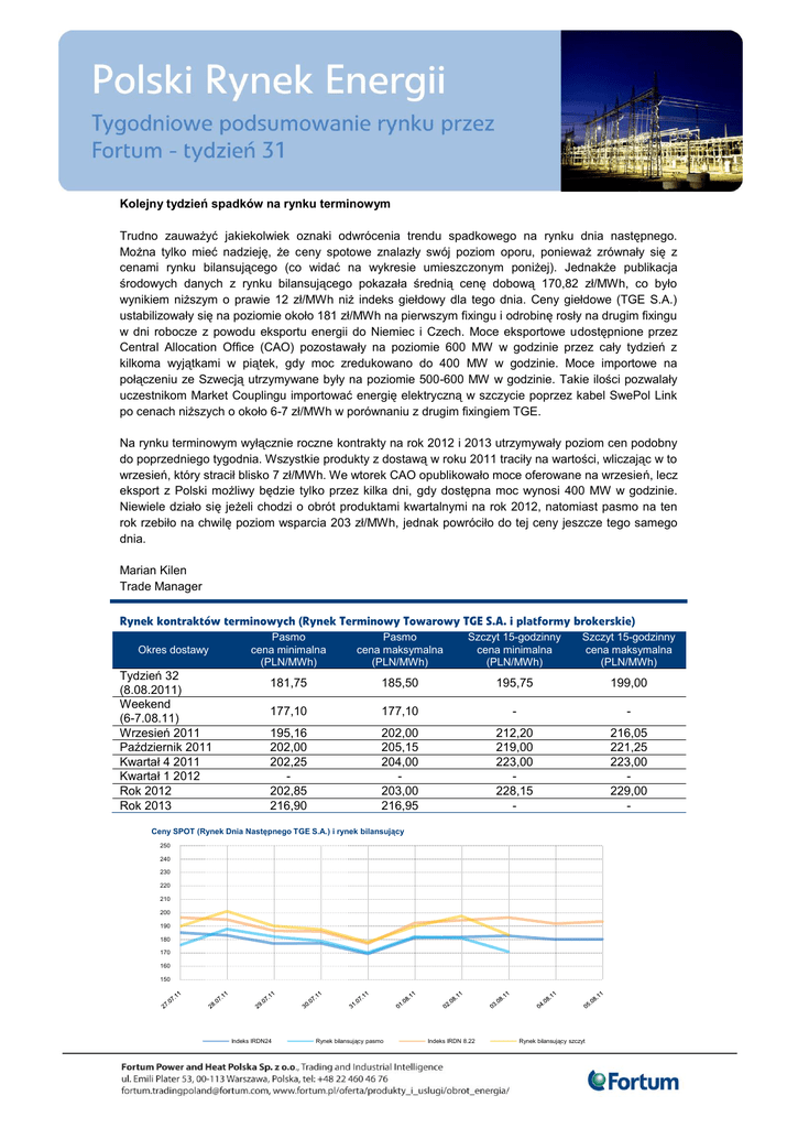 Kolejny tydzień spadków na rynku terminowym Trudno zauważyć jakiekolwiek oznaki odwrócenia trendu spadkowego na rynku dnia następnego. Można tylko mieć nadzieję, że ceny spotowe znalazły swój poziom oporu, ponieważ zrównały się z cenami rynku bilansującego (co widać na wykresie umieszczonym poniżej). Jednakże publikacja środowych danych z rynku bilansującego pokazała średnią cenę dobową 170,82 zł/MWh, co było wynikiem niższym o prawie 12 zł/MWh niż indeks giełdowy dla tego dnia. Ceny giełdowe (TGE S.A.) ustabilizowały się na poziomie około 181 zł/MWh na pierwszym fixingu i odrobinę rosły na drugim fixingu w dni robocze z powodu eksportu energii do Niemiec i Czech. Moce eksportowe udostępnione przez Central Allocation Office (CAO) pozostawały na poziomie 600 MW w godzinie przez cały tydzień z kilkoma wyjątkami w piątek, gdy moc zredukowano do 400 MW w godzinie. Moce importowe na połączeniu ze Szwecją utrzymywane były na poziomie 500-600 MW w godzinie. Takie ilości pozwalały uczestnikom Market Couplingu importować energię elektryczną w szczycie poprzez kabel SwePol Link po cenach niższych o około 6-7 zł/MWh w porównaniu z drugim fixingiem TGE. Na rynku terminowym wyłącznie roczne kontrakty na rok 2012 i 2013 utrzymywały poziom cen podobny do poprzedniego tygodnia. Wszystkie produkty z dostawą w roku 2011 traciły na wartości, wliczając w to wrzesień, który stracił blisko 7 zł/MWh. We wtorek CAO opublikowało moce oferowane na wrzesień, lecz eksport z Polski możliwy będzie tylko przez kilka dni, gdy dostępna moc wynosi 400 MW w godzinie. Niewiele działo się jeżeli chodzi o obrót produktami kwartalnymi na rok 2012, natomiast pasmo na ten rok rzebiło na chwilę poziom wsparcia 203 zł/MWh, jednak powróciło do tej ceny jeszcze tego samego dnia. Marian Kilen Trade Manager Rynek kontraktów terminowych (Rynek Terminowy Towarowy TGE S.A. i platformy brokerskie) Okres dostawy Tydzień 32 (8.08.2011) Weekend (6-7.08.11) Wrzesień 2011 Październik 2011 Kwartał 4 2011 Kwartał 1 2012 Rok 2012 Rok 2013 Pasmo cena minimalna (PLN/MWh) Pasmo cena maksymalna (PLN/MWh) Szczyt 15-godzinny cena minimalna (PLN/MWh) Szczyt 15-godzinny cena maksymalna (PLN/MWh) 181,75 185,50 195,75 199,00 177,10 177,10 - - 195,16 202,00 202,25 202,85 216,90 202,00 205,15 204,00 203,00 216,95 212,20 219,00 223,00 228,15 - 216,05 221,25 223,00 229,00 - Ceny SPOT (Rynek Dnia Następnego TGE S.A.) i rynek bilansujący 250 240 230 220 210 200 190 180 170 160 150 Indeks IRDN24 Rynek bilansujący pasmo Indeks IRDN 8.22 Rynek bilansujący szczyt