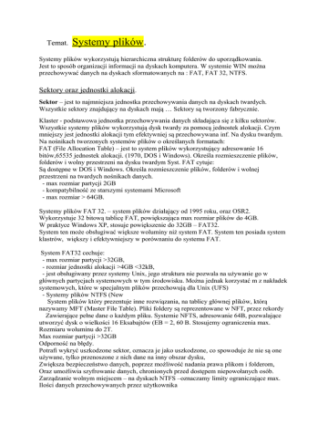 Temat. Systemy plików. Systemy plików wykorzystują hierarchiczna strukturę folderów do uporządkowania. Jest to sposób organizacji informacji na dyskach komputera. W systemie WIN można przechowywać danych na dyskach sformatowanych na : FAT, FAT 32, NTFS. Sektory oraz jednostki alokacji. Sektor – jest to najmniejsza jednostka przechowywania danych na dyskach twardych. Wszystkie sektory znajdujący na dyskach mają … Sektory są tworzony fabrycznie. Klaster - podstawowa jednostka przechowywania danych składająca się z kilku sektorów. Wszystkie systemy plików wykorzystują dysk twardy za pomocą jednostek alokacji. Czym mniejszy jest jednostki alokacji tym efektywniej są przechowywana inf. Na dysku twardym. Na nośnikach tworzonych systemów plików o określanych formatach: FAT (File Allocation Table) – jest to system plików wykorzystujący adresowanie 16 bitów,65535 jednostek alokacji. (1970, DOS i Windows). Określa rozmieszczenie plików, folderów i wolny przestrzeni na dysku twardym Syst. FAT cytuje: Są dostępne w DOS i Windows. Określa rozmieszczenie plików, folderów i wolnej przestrzeni na twardych nośnikach danych. - max rozmiar partycji 2GB - kompatybilność ze starszymi systemami Microsoft - max rozmiar > 64GB. Systemy plików FAT 32. – system plików działający od 1995 roku, oraz OSR2. Wykorzystuje 32 bitową tablicę FAT, powiększająca max rozmiar plików do 4GB. W praktyce Windows XP, stosuje powiększenie do 32GB – FAT32. System ten może obsługiwać większe woluminy niż system FAT. System ten posiada system klastrów, większy i efektywniejszy w porównaniu do systemu FAT. System FAT32 cechuje: - max rozmiar partycji >32GB, - rozmiar jednostki alokacji >4GB <32kB, - jest obsługiwany przez systemy Unix, jego struktura nie pozwala na używanie go w głównych partycjach systemowych w tym środowisku. Można jednak korzystać m z nakładek systemowych, które w specjalnym plików przechowują dla Unix (UFS) - Systemy plików NTFS (New System plików który prezentuje inne rozwiązania, na tablicy głównej plików, którą nazywamy MFT (Master File Table). Pliki foldery są reprezentowane w NFT, przez rekordy Zawierające pełne dane o każdym pliku. Systemie NFTS, adresowanie 64B, pozwalające utworzyć dysk o wielkości 16 Eksabajtów (EB = 2, 60 B. Stosujemy ograniczenia max. Rozmiaru woluminu do 2T. Max rozmiar partycji >32GB Odporność na błędy. Potrafi wykryć uszkodzone sektor, oznacza je jako uszkodzone, co spowoduje że nie są one używane, tylko przenoszone z nich dane na inny obszar dysku, Zwiększa bezpieczeństwo danych, poprzez możliwość nadania prawa plikom i folderom, Oraz umożliwia szyfrowanie danych, chronionych przed dostępem niepowołanych osób. Zarządzanie wolnym miejscem – na dyskach NTFS –oznaczamy limity ograniczające max. Ilości danych przechowywanych przez użytkownika Lepsze niż w poprzednich systemach wykorzystanie Przestrzeni dysku Możliwość odczytania partycji NTFS, przez jądro systemu Linux. Podczas instalacji możliwość wyboru plików dla poszczególnych systemów komputera. Jeżeli któryś z dysków sformatowano w systemie FAT można go skonwertować Do systemu NTFS , należy pamiętać ze odwrotność nie jest możliwa . Możliwość przywróceni a jest sformatowani dysku i odtworzeni danych z kopii zapasowej przed konwersją plików należy wykonać kopię systemu, gdyż system pracuje nie stabilnie i może nie wystartować konwersja – conwert z wiersza polecenia. Zadanie Konwersja systemu plików. Aby dysk sformatowany w systemie FAT, FAT32 skonwertować do systemu NTFS, należy: - Start/uruchom/otwórz cmd/enter uruchomiony wiersz plecenia/ Polecenie – conwertnazwa_dysku/fs:ntfs[enter]/ uruchom ponownie komputer. Wykonanie polecenia spowoduje skonwertowanie dysku E. Aby wyświetlić pomoc kontekstową programu conwert należy wierszy polecenia wpisać convert/? W starszych systemach przez Explorator Windows. Konwertuje wolumin FAT na plik NTFS. Uprawnienia plików NFTS Uprawnienia systemów plików. Prawa dostępu mogą być nadawane dla całego dysku, folderu lub pojedynczego pliku. Jeżeli użytkownik posiada odpowiednie uprawnienia do tworzenia plików i folderów, wówczas tworzenie plików jest takie same jak na dyskach FAT. Uprawnienia plików NFTS pozwalają na precyzyjne określenie prawa do plików i folderów systemu Windows. Ze względu na swoja precyzje i dużą liczbę możliwych uprawnień możemy pogrupować pliki w celu dostępu do nich. Grupy uprawnień odnajdujemy w wyborze z menu kontekstowego lub folderu właściwości/zakładka zabezpieczenia/edytuj/zaawansowane jeśli przechodzimy do następnego folderu. Sprawdzić uprawnienia dla uprawnienia/zabezpieczenia/grupa użytkowników. Dowiedz się o konsoli dostępu. Wykonać zrzut i opisać. Poziomy uprawnień dla systemu plików Odczyt i wykonywanie. Można wyświetlać zawartość istniejących plików i folderów oraz uruchamiać programy w folderze. Użytkownicy mogą wyświetlać zawartość folderu, oraz otwierać pliki i foldery. Zapis Użytkownicy mogą tworzyć nowe pliki foldery oraz je zmieniać. (tabela) Tabela uprawnień NTFS (tabela) Istnieje ogromna różnica miedzy jawnym ograniczeniem grupie odczytu, a nadaniem tej grupie żadnych uprawnień. Związane jest to z tym, ze jeden i ten sam użytkownik może być członkiem dowolnej grup użytkowników. Nadanie praw odmów jest priorytetowe i spowoduje unieważnienie nadanego prawa zezwalań i odmów. Jest to wyjątek od uniwersalnej reguły zgodnie która uprawnienia się kumulują . jeżeli użytkownik jest użytkownikiem wielu grup to grupa druga ma inne prawa. Do zapisu to trzeci tylko do odczytu i zapisu. Zadanie Przypisywanie uprawnień. Załóż konta użytkowników: mechanik i projektant. Nadajemy uprawnienia użytkownika. Zakładamy konto właściciel z uprawnieniami administratora i hasłem qverty 123. Na dysku twardym c zakładamy fo