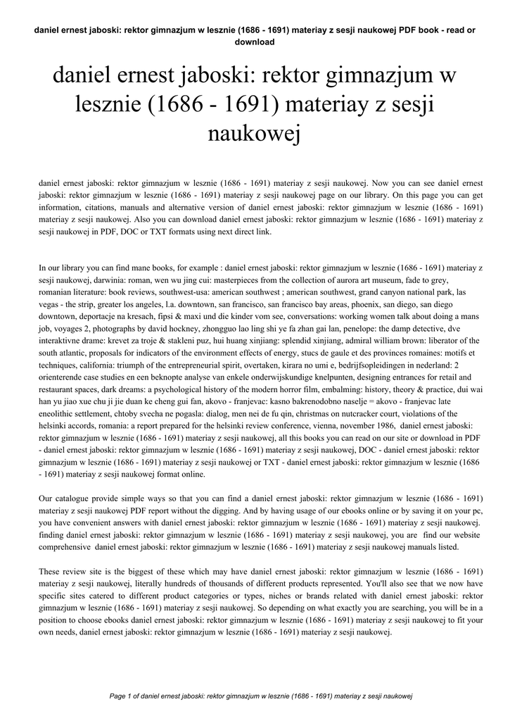 daniel ernest jaboski: rektor gimnazjum w lesznie (1686 - 1691) materiay z sesji naukowej PDF book - read or download daniel ernest jaboski: rektor gimnazjum w lesznie (1686 - 1691) materiay z sesji naukowej daniel ernest jaboski: rektor gimnazjum w lesznie (1686 - 1691) materiay z sesji naukowej. Now you can see daniel ernest jaboski: rektor gimnazjum w lesznie (1686 - 1691) materiay z sesji naukowej page on our library. On this page you can get information, citations, manuals and alternative version of daniel ernest jaboski: rektor gimnazjum w lesznie (1686 - 1691) materiay z sesji naukowej. Also you can download daniel ernest jaboski: rektor gimnazjum w lesznie (1686 - 1691) materiay z sesji naukowej in PDF, DOC or TXT formats using next direct link. In our library you can find mane books, for example : daniel ernest jaboski: rektor gimnazjum w lesznie (1686 - 1691) materiay z sesji naukowej, darwinia: roman, wen wu jing cui: masterpieces from the collection of aurora art museum, fade to grey, romanian literature: book reviews, southwest-usa: american southwest ; american southwest, grand canyon national park, las vegas - the strip, greater los angeles, l.a. downtown, san francisco, san francisco bay areas, phoenix, san diego, san diego downtown, deportacje na kresach, fipsi & maxi und die kinder vom see, conversations: working women talk about doing a mans job, voyages 2, photographs by david hockney, zhongguo lao ling shi ye fa zhan gai lan, penelope: the damp detective, dve interaktivne drame: krevet za troje & stakleni puz, hui huang xinjiang: splendid xinjiang, admiral william brown: liberator of the south atlantic, proposals for indicators of the environment effects of energy, stucs de gaule et des provinces romaines: motifs et techniques, california: triumph of the entrepreneurial spirit, overtaken, kirara no umi e, bedrijfsopleidingen in nederland: 2 orienterende case studies en een beknopte analyse van enkele onderwijskundige knelpunten, designing entrances for retail and restaurant spaces, dark dreams: a psychological history of the modern horror film, embalming: history, theory & practice, dui wai han yu jiao xue chu ji jie duan ke cheng gui fan, akovo - franjevac: kasno bakrenodobno naselje = akovo - franjevac late eneolithic settlement, chtoby svecha ne pogasla: dialog, men nei de fu qin, christmas on nutcracker court, violations of the helsinki accords, romania: a report prepared for the helsinki review conference, vienna, november 1986, daniel ernest jaboski: rektor gimnazjum w lesznie (1686 - 1691) materiay z sesji naukowej, all this books you can read on our site or download in PDF - daniel ernest jaboski: rektor gimnazjum w lesznie (1686 - 1691) materiay z sesji naukowej, DOC - daniel ernest jaboski: rektor gimnazjum w lesznie (1686 - 1691) materiay z sesji naukowej or TXT - daniel ernest jaboski: rektor gimnazjum w lesznie (1686 - 1691) materiay z sesji naukowej format online. Our catalogue provide simple ways so that you can find a daniel ernest jaboski: rektor gimnazjum w lesznie (1686 - 1691) materiay z sesji naukowej PDF report without the digging. And by having usage of our ebooks online or by saving it on your pc, you have convenient answers with daniel ernest jaboski: rektor gimnazjum w lesznie (1686 - 1691) materiay z sesji naukowej. finding daniel ernest jaboski: rektor gimnazjum w lesznie (1686 - 1691) materiay z sesji naukowej, you are find our website comprehensive daniel ernest jaboski: rektor gimnazjum w lesznie (1686 - 1691) materiay z sesji naukowej manuals listed. These review site is the biggest of these which may have daniel ernest jaboski: rektor gimnazjum w lesznie (1686 - 1691) materiay z sesji naukowej, literally hundreds of thousands of different products represented. You'll also see that we now have specific sites catered to different product categories or types, niches or brands related with daniel ernest jaboski: rektor gimnazjum w lesznie (1686 - 1691) materiay z sesji naukowej. So depending on what exactly you are searching, you will be in a position to choose ebooks daniel ernest jaboski: rektor gimnazjum w lesznie (1686 - 1691) materiay z sesji naukowej to fit your own needs, daniel ernest jaboski: rektor gimnazjum w lesznie (1686 - 1691) materiay z sesji naukowej. Page 1 of daniel ernest jaboski: rektor gimnazjum w lesznie (1686 - 1691) materiay z sesji naukowej
