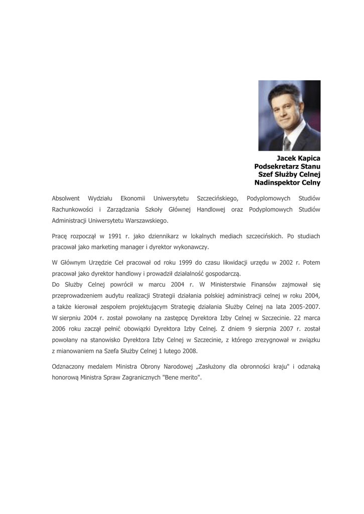 Jacek Kapica Podsekretarz Stanu Szef Służby Celnej Nadinspektor Celny Absolwent Wydziału Rachunkowości i Ekonomii Zarządzania Uniwersytetu Szkoły Głównej Szczecińskiego, Handlowej oraz Podyplomowych Podyplomowych Studiów Studiów Administracji Uniwersytetu Warszawskiego. Pracę rozpoczął w 1991 r. jako dziennikarz w lokalnych mediach szczecińskich. Po studiach pracował jako marketing manager i dyrektor wykonawczy. W Głównym Urzędzie Ceł pracował od roku 1999 do czasu likwidacji urzędu w 2002 r. Potem pracował jako dyrektor handlowy i prowadził działalność gospodarczą. Do Służby Celnej powrócił w marcu 2004 r. W Ministerstwie Finansów zajmował się przeprowadzeniem audytu realizacji Strategii działania polskiej administracji celnej w roku 2004, a także kierował zespołem projektującym Strategię działania Służby Celnej na lata 2005-2007. W sierpniu 2004 r. został powołany na zastępcę Dyrektora Izby Celnej w Szczecinie. 22 marca 2006 roku zaczął pełnić obowiązki Dyrektora Izby Celnej. Z dniem 9 sierpnia 2007 r. został powołany na stanowisko Dyrektora Izby Celnej w Szczecinie, z którego zrezygnował w związku z mianowaniem na Szefa Służby Celnej 1 lutego 2008. Odznaczony medalem Ministra Obrony Narodowej „Zasłużony dla obronności kraju" i odznaką honorową Ministra Spraw Zagranicznych "Bene merito".