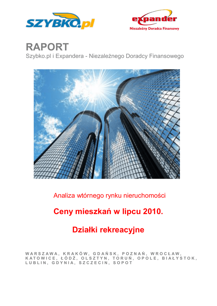 RAPORT Szybko.pl i Expandera - Niezależnego Doradcy Finansowego Analiza wtórnego rynku nieruchomości Ceny mieszkań w lipcu 2010. Działki rekreacyjne WA R S Z AW A , K R A K Ó W, G D A Ń S K , P O Z N A Ń , W R O C Ł AW, K AT O W I C E , Ł Ó D Ź , O L S Z T Y N , T O R U Ń , O P O L E , B I A Ł Y S T O K , LUBLIN, GDYNIA, SZCZECIN, SOPOT 11kkkk2 W SKRÓCIE: Zmiany cen, które nastąpiły w lipcu 2010 potwierdzają brak stałej tendencji na polskim rynku nieruchomości. W czerwcu średnie ceny ofertowe wzrosły o 0,8%, natomiast w lipcu wskaźnik zmiany średniej ceny wyniósł -0,6%. W ofercie wszystkich gruntów wystawionych na sprzedaż działki rekreacyjne stanowią około 2,9%. Z analizy przeprowadzonej na bazie 2300 ogłoszeo z serwisu www.szybko.pl wynika, że działki rekreacyjne są średnio dwukrotnie taosze niż działki budowlane Najtaosze działki rekreacyjne można kupid w województwie świętokrzyskim – średnio za 30 złotych za metr, podlaskim – średnio 35 złotych za metr i lubuskim – 38 złotych. W podlaskim i świętokrzyskim działka rekreacyjna jest trzykrotnie taosza od działki budowlanej. W województwach mazowieckim, wielkopolskim działki rekreacyjne stają się ekwiwalentem działek budowlanych Przeciętna marża kredytów w złotych spadła do najniższego poziomu od grudnia 2008 r. i wynosi 1,88% Najniższy w historii WIBOR w połączeniu ze spadkiem przeciętnej marży kredytów w złotych spowodował, że przeciętne oprocentowanie kredytów w złotych wynosi zaledwie 5,71% 11kkkk3 RYNEK KREDYTÓW HIPOTECZNYCH Lipcowe dane na temat oferty kredytów hipotecznych przynoszą dobre informacje dla osób zainteresowanych zadłużeniem się w złotych. Przeciętna (mediana) marża kredytu na kwotę 300 tys. zł (25% wkładu własnego) spadła bowiem do poziomu 1,88%. Jest to najniższa wartość od grudnia 2008 r. kiedy mediana marż wynosiła 1,6%. Przyczyną spadku przeciętnej marży są oferty promocyjne w Allianz Banku i Millennium. Oprocentowanie i marże kredytów hipotecznych w PLN Bank Oprocentowanie Allianz 5,12% BZ WBK 5,16% ING Bank Śląski 5,49% Eurobank 5,54% HSBC 5,57% Alior Bank 5,61% Citi Handlowy 5,62% Nordea Bank 5,62% Millennium 5,62% Pekao 5,64% BOŚ 5,69% Lukas Bank 5,70% PKO BP 5,70% Pocztowy 5,71% Pekao Bank Hipoteczny 5,74% BNP Paribas Fortis 5,81% mBank 5,86% Multibank 5,86% Kredyt Bank 6,01% Deutsche Bank PBC 6,02% DnB Nord 6,06% Raiffeisen Bank 6,06% BGŻ 6,09% BPS 6,16% Getin Noble Bank 6,31% Polbank EFG 6,86% BPH 8,62% Mediana 5,71% Kredyt na kwotę 300 tys. zł, wkład własny 25% Marża 1,30% 1,35% 1,50% 1,69% 1,70% 1,80% 1,80% 1,80% 1,80% 1,70% 1,70% 1,85% 1,88% 1,90% 1,75% 1,99% 2,00% 2,00% 2,19% 2,20% 2,05% 2,20% 2,10% 2,30% 2,45% 3,00% 4,80% 1,88% 11kkkk4 Allianz Bank w ramach promocji „Słoneczna hipoteka” zaoferował marżę na poziomie 1,3% (1,5% w przypadku wkładu własnego poniżej 20%) przebijając tym samym BZ WBK, którego 1,35% od września 2009 r. było najlepszą ofertą kredytu w złotych. Aby skorzystać ze słonecznej promocji wnioskodawca musi otworzyć konto w Allianz, na które co miesiąc ma wpływać przynajmniej 2 000 zł. Klient musi również wykonać co miesiąc przynajmniej 3 operacje bezgotówkowe (płatności kartą lub przelewów). Wymagane jest również skorzystanie z oferowanego przez bank ubezpieczenia na życie. Koszt to 1% lub 1,4% sumy ubezpieczania rocznie. Jeśli kwota kredytu to 300 tys. zł, to roczny koszt ubezpieczenia wyniesie więc 3 000 zł lub 4200 zł. Jeśli jednak choćby jeden raz klient nie spełni opisanych warunków, to marża zostanie podwyższona do poziomu 2,8% (3% w przypadku wkładu własnego poniżej 20%). Co ważne, podwyżka jest nieodwracalna, czyli nawet jeśli w kolejnych miesiącach klient ponownie spełni warunki, to i tak będzie płacił wyższe odsetki. Do obniżenia przeciętnej marży przyczynił się również Bank Millennium. W tym przypadku obniżka jest jednak znacznie mniejsza, bo zaledwie o 0,2 pkt. proc. Warunkiem otrzymania niższej marży jest otwarcie lub posiadanie konta w tym banku. Drugi warunek to posiadanie karty debetowej i wykonywanie nią co miesiąc transakcji bezgotówkowych na kwotę przynajmniej 500 zł. W Millennium nie wypełnienie warunków promocji również kończy się podwyżką marży. W przeciwieństwie do promocji w Allianz nie jest ona jednak nieodwracalna. Ponowne spełnienie warunków oznacza obniżkę marży. Dobrą informacją dla kredytobiorców jest również najniższy w historii poziom stawki WIBOR. 2 sierpnia wynosił on 3,81%, czyli o 0,06 pkt. proc. mniej niż przed miesiącem. W rezultacie niskiej wartości stawki referencyjnej i niższych marż spadło również przeciętne oprocentowanie kredytów w złotych. W przypadku zaciągnięcia długu w wysokości 300 tys. zł (25% wkładu własnego) mediana oprocentowań wynosi 5,71%. Jest więc już o ponad 1 pkt. proc. niższe niż na początku roku. Najniższe oprocentowanie – 5,12% - ofertuje wspomniany już Allianz Bank, a najwyższe – 8,62% - Bank BPH. Oprocentowanie i marże kredytów hipotecznych w EUR Bank Oprocentowanie DnB Nord 3,06% Alior Bank 3,23% Raiffeisen Bank 3,35% Deutsche Bank PBC 3,40% PKO BP 3,42% Nordea Bank 3,49% Kredyt Bank 3,60% BPH 3,63% Multibank 3,83% mBank 3,90% Pekao 4,20% Polbank EFG 4,30% BOŚ 4,35% Getin Noble Bank 5,42% Mediana 3,62% Kredyt na kwotę 300 tys. zł, wkład własny 25% Marża 2,00% 2,40% 2,60% 2,50% 2,52% 2,60% 2,70% 2,80% 3,00% 3,00% 3,50% 3,60% 3,20% 4,70% 2,75% 11kkkk5 W przypadku kredytów walutowych dane nie są tak dobre. W minionym miesiącu przeciętna marża kredytów w euro wzrosła nieznacznie - z 2,70% do 2,75%. Podwyższyła się również wartość stawki bazowej, czyli EURIBOR 3M – z 0,782% do 0,898%. W rezultacie przeciętne oprocentowanie kredytów w euro wynosi obecnie 3,62%. Najniższe odsetki – 3,06% - nalicza DnB Nord, a najwyższe - 7,09% PKO BP. W przypadku kredytów 