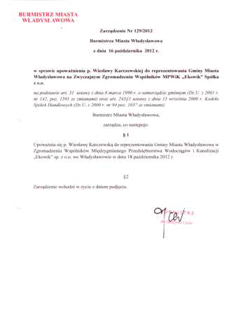 BURMISTRZ MIASTA WŁADYSŁAWOWA Zarządzenie Nr 129/2012 Burmistrza Miasta Władysławowa z dnia 16 października 2012 r. w sprawie upoważnienia p. Wieslawy Karczewskiej do reprezentowania Gminy Miasta Władysławowa na Zwyczajnym Zgromadzeniu Wspólników MPWiK "Ekowik" Spółka z 0.0. na podstawie art. 31 ustawy z dnia 8 marca 1990 r. o samorządzie gminnym (Dz. U z 2001 r. nr 142, poz. 1591 ze zmianami) oraz art. 243§1 ustawy z dnia 15 września 2000 r. Kodeks Spółek Handlowych (Dz. U z 2000 r. nr 94 poz. 1037 ze zmianami) Burmistrz Miasta Władysławowa, zarządza, co następuje: §1 Upoważnia się p. Wiesławę Karczewską do reprezentowania Gminy Miasta Władysławowa w Zgromadzeniu Wspólników Międzygminnego Przedsiębiorstwa Wodociągów i Kanalizacji .Ekowik" sp. z 0.0. we Władysławowie w dniu 18 października 2012 r. §2 Zarządzenie wchodzi w życie z dniem podjęcia. I I rr"h' Sfr R Z d ~Cern