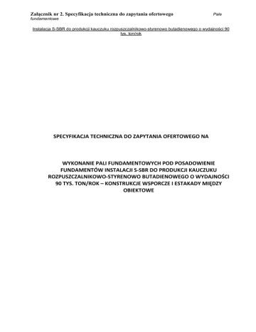 Załącznik nr 2. Specyfikacja techniczna do zapytania ofertowego Pale fundamentowe Instalacja S-SBR do produkcji kauczuku rozpuszczalnikowo-styrenowo butadienowego o wydajności 90 tys. ton/rok SPECYFIKACJA TECHNICZNA DO ZAPYTANIA OFERTOWEGO NA WYKONANIE PALI FUNDAMENTOWYCH POD POSADOWIENIE FUNDAMENTÓW INSTALACJI S-SBR DO PRODUKCJI KAUCZUKU ROZPUSZCZALNIKOWO-STYRENOWO BUTADIENOWEGO O WYDAJNOŚCI 90 TYS. TON/ROK – KONSTRUKCJE WSPORCZE I ESTAKADY MIĘDZY OBIEKTOWE Specyfikacja techniczna do zapytania ofertowego Pale fundamentowe Instalacja S-SBR do produkcji kauczuku rozpuszczalnikowo-styrenowo butadienowego o wydajności 90 tys. ton/rok 1. ZAKRES WYMAGANYCH PRAC OBJĘTYCH ZAPYTANIEM: - Wykonanie projektu wykonawczo - technologicznego posadowienia pośredniego za pomocą kolumn jet-grouting; Wykonanie projektu wykonawczo - technologicznego robót palowych; Wykonanie projektu próbnych obciążeń; Prace ziemne oraz wykonanie podbudowy Wykonanie zaprojektowanej w Projekcie Budowlanym liczby pali objętych zamówieniem ; Wykonanie podkładu betonowego; Wykonanie próbnych obciążeń zgodnie z wymogami obowiązujących norm budowlanych; Sporządzenie dokumentacji powykonawczej wraz z geodezyjną inwentaryzacją położenia pali po rozkuciu głowic i metryką pali; 2. SZCZEGÓŁOWY ZAKRES PRAC BUDOWLANYCH. Zgodnie z Projektem Budowlanym do wykonania w pierwszej części prac fundamentowych w południowej części terenu przy budowie instalacji S-SBR jest 479 pali fundamentowych pod planowane konstrukcje wsporcze oraz 236 pali fundamentowych pod estakady między obiektowe. Z uwagi na konieczność posadowienia przyszłych obiektów na warstwie gruntów o dobrych właściwościach, czyli do głębokości zalegania gruntów nośnych wykształconych w postaci pospółki z domieszką gliny wyznaczona w projekcie długość pali wynosi 18,0 m. Dokładną długość wykonania pali należy wyznaczyć w projekcie wykonawczo-technologicznym posadowienia pośredniego za pomocą kolumn jet-grouting w zależności od warunków gruntowych w miejscu palowania. Zakres prac budowlanych został podzielony na dwie grupy: roboty palowe i roboty towarzyszące. Roboty palowe - Zakup i transport na budowę wszystkich niezbędnych czynników produkcji; Montaż i demontaż oraz przemieszczenie sprzętu; Przygotowanie stanowisk do próbnego obciążenia pali; Przygotowanie platform pod palownice; Wykonanie pali zbrojonych za pomocą zbrojenia sztywnego przenoszącego samodzielnie obciążenia w gruntach organicznych wg projektu wykonawczo – technologicznego; Wykonanie próbnych obciążeń pali zgodnie z zaakceptowanym projektem; Wykonanie badania ciągłości pali; Rozkucie głowic pali; Roboty towarzyszące - - Wykonanie wykopów szerokoprzestrzennych na głębokość - 2,9 m wraz z wywozem części urobku poza obszar zakładu i jego utylizacją, a pozostałej ilości urobku na wskazane przez Zamawiającego miejsce w odległości do 1 km od miejsca prowadzonych prac, Wykonanie podbudowy z kruszywa łamanego o miąższości 30 cm z jego zagęszczeniem mechanicznym, Wywiezienie urobku i gruzu powstałego podczas prac palowych poza obszar zakładu (wysyp po stronie Wykonawcy), Wykonanie podkładu betonowego gr. 10 cm na podbudowie z kruszywa łamanego, Wykonanie odwodnienia wykopów poprzez wykonanie drenażu opaskowego planowanych płyt fundamentowych i odprowadzenie wody do istniejącego rurociągu kanalizacji deszczowej fi Specyfikacja techniczna do zapytania ofertowego Pale fundamentowe Instalacja S-SBR do produkcji kauczuku rozpuszczalnikowo-styrenowo butadienowego o wydajności 90 tys. ton/rok - 1500 zlokalizowanego w ulicy C (podłączenie do istniejących studzienek wykonanych z cegły klinkierowej); Uporządkowanie terenu; 3. OGÓLNE WYMAGANIA DOTYCZĄCE ROBÓT. Wykonawca robót jest odpowiedzialny za jakość ich wykonania oraz za zgodność z Dokumentacją Projektową, poleceniami Inżyniera kontraktu i inspektora nadzoru. Roboty palowe powinny być realizowane na podstawie przekazanego Projektu Budowlanego wraz z dokumentacją geologiczno-inżynierską oraz wykonanej przez Wykonawcę Dokumentacji Projektowej zawierającej projekt wykonawczo – technologiczny posadowienia pośredniego i projekt wykonawczo - technologiczny robót palowych. W przypadku stwierdzenia istotnych niezgodności warunków geotechnicznych z podanymi w projekcie (dokumentacji geologiczno-inżynierskiej), należy odpowiednio dostosować liczbę i wymiary pali - w uzgodnieniu z Inżynierem kontraktu, inspektorem nadzoru i nadzorem autorskim. Analogicznie należy postępować w przypadku natrafienia w trakcie wykonywania otworu w gruncie na nieprzewidziane przeszkody (istniejące fundamenty, sieci, kamienie). 4. ZAKRES PRAC PO STRONIE ZAMAWIAJĄCEGO. - Przekazanie placu budowy; Geodezyjne wyznaczenie głównych osi obiektów budowlanych; Zapewnienie dostępu do niezbędnych mediów Wyznaczenie miejsca na zaplecze budowy 5. OBMIAR ROBÓT W przypadku robót palowych jednostką obmiaru jest 1 pal o średnicy 600 mm i minimalnej nośności 800 kN wykonany w technologii iniekcji strumieniowej jet-grouting wraz ze zbrojeniem sztywnym przenoszącym samodzielnie obciążenia w gruntach organicznych. Natomiast prace towarzyszące należy wycenić zgodnie z załączonymi przedmiarami robót. 6. ODBIÓR ROBÓT 6.1. Zasady ogólne Pale należy uznać za wykonane zgodnie z wymaganiami jeżeli wszystkie próbne obciążenia pali dały wyniki pozytywne i zostały dotrzymane warunki wynikające z aktualnych norm budowlanych. W przypadku stwierdzenia usterek nie nadających się do usunięcia, lecz nie zagrażających bezpieczeństwu budowli w okresie jej całej przewidywanej eksploatacji, można warunkowo przyjąć pal. 6.2. Odbiory częściowe Odbiory częściowe dokonywane są w oparciu o metryki pali i faktyczne ilości wykonywanych pali. W miarę możliwości Wykonawca powinien sukcesywnie przekazywać atesty na zastosowane materiały. 6.3. Od