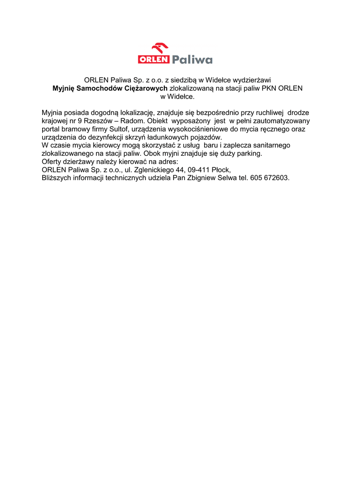 ORLEN Paliwa Sp. z o.o. z siedzibą w Widełce wydzierżawi Myjnię Samochodów Ciężarowych zlokalizowaną na stacji paliw PKN ORLEN w Widełce. Myjnia posiada dogodną lokalizację, znajduje się bezpośrednio przy ruchliwej drodze krajowej nr 9 Rzeszów – Radom. Obiekt wyposażony jest w pełni zautomatyzowany portal bramowy firmy Sultof, urządzenia wysokociśnieniowe do mycia ręcznego oraz urządzenia do dezynfekcji skrzyń ładunkowych pojazdów. W czasie mycia kierowcy mogą skorzystać z usług baru i zaplecza sanitarnego zlokalizowanego na stacji paliw. Obok myjni znajduje się duży parking. Oferty dzierżawy należy kierować na adres: ORLEN Paliwa Sp. z o.o., ul. Zglenickiego 44, 09-411 Płock, Bliższych informacji technicznych udziela Pan Zbigniew Selwa tel. 605 672603.