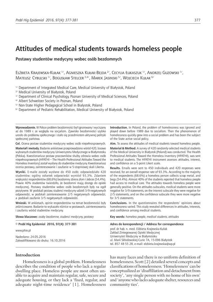 Krajewska-Kułak Probl Hig Epidemiol E, et2016, al. Attitudes 97(4): 377-381 of medical students towards homeless people 377 Attitudes of medical students towards homeless people Postawy studentów medycyny wobec osób bezdomnych Elżbieta Krajewska-Kułak 1/, Agnieszka Kułak-Bejda 2/, Cecylia Łukaszuk 1/, Andrzej Guzowski 1/, Mateusz Cybulski 1/, Bogusław Stelcer 3,4/, Marek Jasinski 5/, Wojciech Kułak 6/ Department of Integrated Medical Care, Medical University of Białystok, Poland Medical University of Białystok, Poland 3/ Department of Clinical Psychology, Poznan University of Medical Sciences, Poland 4/ Albert Schweitzer Society in Poznan, Poland 5/ Non-State Higher Pedagogical School in Bialystok, Poland 6/ Department of Pediatric Rehabilitation, Medical University of Białystok, Poland 1/ 2/ Wprowadzenie. W Polsce problem bezdomności był ignorowany i wyciszany aż do 1989 r. ze względu na socjalizm. Zjawisko bezdomności szybko urosło do problemu społecznego i stało się przedmiotem aktywnej polityki społecznej państwa. Introduction. In Poland, the problem of homelessness was ignored and played down before 1989 due to socialism. Then the phenomenon of homelessness quickly grew into a social problem and has been the subject of the State active social policy. Cel. Ocena postaw studentów medycyny wobec osób niepełnosprawnych. Aim. To assess the attitudes of medical students toward homeless people. Materiał i metody. Badanie ankietowe przeprowadzono wśród 420, losowo wybranych studentów medycyny Uniwersytetu Medycznego w Białymstoku (Polska). Kwestionariusz postaw pracowników służby zdrowia wobec osób niepełnosprawnych (HPATHI – The Health Professional Attitudes Toward the Homeless Inventory) został wysłany do studentów medycyny. Kwestionariusz ocenia postawy, zainteresowanie i zaufanie w 5-stopniowej skali Likerta. Material & Method. A survey of 420 randomly-selected medical students of the Medical University in Białystok (Poland) was conducted. The Health Professional Attitudes Toward the Homeless Inventory (HPATHI), was sent to medical students. The HPATHI instrument assesses attitudes, interest, and confidence on a 5-point Likert scale. Wyniki. E-maile zostały wysłane do 450 osób; odpowiedziało 420 studentów; ogólny odsetek odpowiedzi wyniósł 93,3%. Zdaniem większości respondentów (68,6%) bezdomny zbiera złom i żebrze (54,4%). Prawie 40% studentów twierdziło, że bezdomni mają dostęp do opieki medycznej. Postawy studentów wobec osób bezdomnych były na ogół pozytywne. W podskali postaw, studenci medycyny udzieli 3/9 negatywnych odpowiedzi, w podskali zainteresowanie 2/5 negatywnych odpowiedzi, a podskali zaufanie 3/5 negatywnych odpowiedzi. Results. Emails were sent to 450 individuals and 420 responses were received, for an overall response rate of 93.3%. According to the majority of the respondents (68.6%) a homeless person collects scrap metal, and begs (54.4%). Almost 40% of the students reported that homeless people had access to medical care. The attitudes towards homeless people were generally positive. On the attitudes subscales, medical students were more negative for 3/9 statements, on the interest subscale they were negative for 2/5 statements, and on the confidence subscale they were more negative for 3/5 statements. Wnioski. W ankietach, opinie respondentów na temat bezdomności były zróżnicowane. Badanie to wykazało różnice w postawach, zainteresowaniu i zaufaniu wśród studentów medycyny. Conclusions. In the questionnaires the respondents’ opinions about homelessness varied. This study revealed differences in attitudes, interests, and confidence among medical students. Słowa kluczowe: osoby bezdomne, studenci medycyny, postawy Key words: homeless people, medical students, attitudes © Probl Hig Epidemiol 2016, 97(4): 377-381 Adres do korespondencji / Address for correspondence www.phie.pl Nadesłano: 24.05.2016 Zakwalifikowano do druku: 16.10.2016 Introduction Homelessness is a global problem. Homelessness describes the condition of people who lack a regular dwelling place. Homeless people are most often unable to acquire and maintain regular, safe, secure and adequate housing, or they lack a ‘fixed, regular, and adequate night-time residence’ [1]. Homelessness prof. dr hab. n. med. Elżbieta Krajewska-Kułak Zakład Zintegrowanej Opieki Medycznej Uniwersytet Medyczny w Białymstoku ul. Marii Skłodowskiej-Curie 7A, 15-096 Białystok tel. 857 48 55 28, e-mail: [email protected] has many faces and there is no uniform definition of homelessness. Scott [2] detailed several concepts and classifications of homelessness. ‘Homelessness’ can be conceptualized as ‘disaffiliation and detachment from society’, ‘any single person with no home of his own’ and ‘anyone who lacks adequate shelter, resources and community ties’. 378 According to Baranowski [3] homelessness is a manifestation of social exclusion. As a social phenomenon, homelessness is highly diverse and often defies scientific knowledge. According to Duracz-Walczak [4] there exists a wide range of social policy solutions aimed at reducing homelessness and the presence of various forms of social work undertaken with homeless populations. In the United States and Western Europe the number of articles published on the topic in both the popular and professional literature has increased dramatically since 1980 [1, 5]. According to Philippot, et al. [6] in Europe the literature on homelessness has been published mostly in scientific journals and reviews (72%), with other material found in unpublished reports (16%) and books (12%). Furthermore, most of this research has been conducted in the UK (42%) and in France (17%), with a few publications concerning the whole European Community or multiple European countries (3.5%). Finally, very few studies have been found for Eastern countries. In Poland, the problem of homelessness was ignored and