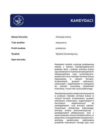 Nazwa kierunku Animacja kultury Tryb studiów stacjonarny Profil studiów praktyczny Wydział Wydział Humanistyczny Opis kierunku Absolwent studiów uzyskuje podstawową wiedzę z zakresu interdyscyplinarnych podstaw teorii i praktyki animacji kultury ugruntowanych w wybranych dyscyplinach i subdyscyplinach nauk humanistycznospołecznych oraz metodyki animacji kultury realizowanej w różnych formach, środowiskach, grupach wiekowych, instytucjach i organizacjach w nawiązaniu do szeroko rozumianej działalności kulturalnej i innych sfer życia publicznego. Absolwentposiadaumiejętnościstosowania w praktyce metodyki animacji kultury w różnych formach, środowiskach, grupach wiekowych, instytucjach i organizacjach w kluczowych współczesnych jej paradygmatach, czyli animacji zabawy, (re)animacji dziedzictwa kulturowego, animacji zmiany prohumanistycznej i paradygmatach eklektycznych, oraz z wykorzystaniem różnych dziedzin kultury, w połączeniu z managementem artystycznym, animacją społeczności realizowania projektów kulturalnych różnego typu oraz promowania wydarzeń kulturalnych i ich krytycznej analizy. Absolwent nabywa kompetencje społeczne w zakresie myślenia i działania prohumanistycznego w prospołecznego, krytyczno-konstruktywnego,innowacyjnego, kreatywnego i przedsiębiorczego w toku realizacji idei animacji kultury oraz ochrony dziedzictwa kulturowego i aktywnego uczestnictwa w życiu kulturalnym. Szczegółowy zakres wiedzy, umiejętności i kompetencji społecznych zawiera tabela efektów kierunkowych oraz efekty kształcenia w ramach poszczególnych przedmiotów. Specjalności Brak. Kryteria kwalifikacji Podstawąprzypostępowaniurekrutacyjnym są wyniki egzaminu maturalnego. Przy rekrutacji na studia pierwszego stopnia należy wybrać po jednym przedmiocie z każdej grupy. Grupa I (jeden przedmiot do wyboru): język polski; Grupa II (jeden przedmiot do wyboru): język obcy nowożytny; Grupa III (jeden przedmiot do wyboru): przedmiot dowolny. Jeżeli kandydat nie zdawał danego przedmiotu na egzaminie maturalnym to uzyskuje zero punktów za ten przedmiot. Brak przedmiotu nie dyskwalifikuje go jednak w postępowaniu rekrutacyjnym. Wyniki z wybranych przedmiotów podstawione do algorytmu dają wynik końcowy kandydata. Przykładowe przedmioty Studia nad czasem wolnym Edukacja medialna Management artystyczny Psychopedagogika twórczości Zarządzanie publiczne Możliwości zatrudnienia Absolwent kierunku - Animacja kultury jest przygotowany do pracy w już istniejących instytucjach i placówkach kultury, tworzenia placówek, organizacji i firm prywatnych zajmujących się działalnością kulturalną i podejmowania w nich pracy. Absolwent kierunku będzie mógł podejmować pracę przede wszystkim w : - urzędach administracji państwowej i samorządowej w wydziałach odpowiedzialnych za działalność kulturalną; - państwowych instytucjach kultury ( wojewódzkie ośrodki kultury, muzea, biura wystaw artystycznych, teatry, młodzieżowe domy kultury itd.) oraz samorządowych placówkach kultury ( miejskie centra kultury, gminne ośrodki kultury, kluby osiedlowe itd.); - innych instytucjach i placówkach, gdzie prowadzona jest działalność kulturalna ( szkoły, internaty, domy opieki społecznej i inne placówki oświatowe, ośrodki sanatoryjne i wypoczynkowe); - organizacjach i stowarzyszeniach społeczno - kulturalnych, fundacjach kulturalnych, towarzystwach regionalnych; prywatnych agencjach, galeriach, biurach zajmujących się działalnością kulturalną, artystyczną, turystyczno-rekreacyjną, promocyjną, wydawniczą itp.; - samodzielnych firmach prowadzących impresariat twórców i zespołów artystycznych; - innych instytucjach publicznych i formach prywatnych, w których istnieje zapotrzebowanie na działalność animacyjną. Kontynuacja nauki Absolwenci studiów pierwszego stopnia na kierunku animacja kultury może kontynuować kształcenie na studiach drugiego stopnia na kierunkach prowadzonych w Instytucie Pedagogiki, a także na studiach drugiego stopnia na kierunkach z obszarów nauk humanistycznych oraz nauk społecznych prowadzonych na Uniwersytecie Szczecińskim oraz innych uczelniach. Terminy Terminy postępowania rekrutacyjnego na studia stacjonarne i niestacjonarne na studia rozpoczynające się od semestru letniego roku akademickiego 2016/2017. Dokumenty Powered by TCPDF (www.tcpdf.org)