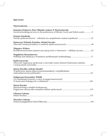 Spis treści Wprowadzenie ...............................................................................................................................7 Katarína Fichnová, Peter Mikuláš, Łukasz P. Wojciechowski Social networking services in the preferences of Slovak, Czech and Polish youth ............... 9 Danuta Smołucha Portale społecznościowe – substytut czy uzupełnienie realnej wspólnoty? .........................35 Katarzyna Walotek-Ściańska, Michał Szyszka Obecność instytucji kultury w mediach społecznościowych ................................................. 49 Zbigniew Widera Kształtowanie postaw poprzez percepcję treści w Internecie – refleksja etyczna ................ 63 Magdalena Harasimowicz Refleksja nad edukacją w kontekście problematyki multitaskingu....................................... 71 Rafał Guzowski Obecność organizacji społecznej w sieci jako ważny element budowania zaufania i wzmacniania wizerunku .......................................................................................................... 83 Marta Macełko, Izabela Mendel Współczesne miasto płaszczyzną komunikacji i współdziałania różnosektorowych podmiotów ..................................................................................................93 Małgorzata Koszembar-Wiklik Czy marketing wirusowy w sieci wymaga kontrowersji? O motywach szokujących w reklamach .................................................................................105 Marta Kierska Shockvertising w służbie bezdomnym. Negatywne emocje jako narzędzia reklam społecznych ...................................................... 119 Lilianna Lakomy Infans Irretitus ............................................................................................................................137 Mirosław Lakomy System propagandowy Korei Północnej..............................................................................................145