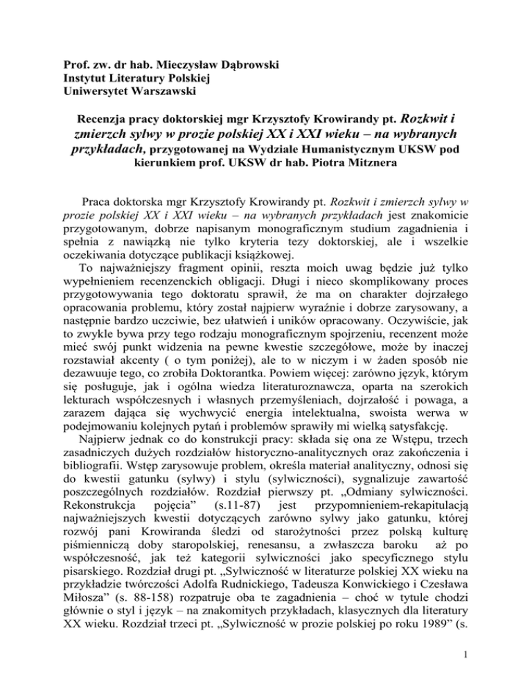 Prof. zw. dr hab. Mieczysław Dąbrowski Instytut Literatury Polskiej Uniwersytet Warszawski Recenzja pracy doktorskiej mgr Krzysztofy Krowirandy pt. Rozkwit i zmierzch sylwy w prozie polskiej XX i XXI wieku – na wybranych przykładach, przygotowanej na Wydziale Humanistycznym UKSW pod kierunkiem prof. UKSW dr hab. Piotra Mitznera Praca doktorska mgr Krzysztofy Krowirandy pt. Rozkwit i zmierzch sylwy w prozie polskiej XX i XXI wieku – na wybranych przykładach jest znakomicie przygotowanym, dobrze napisanym monograficznym studium zagadnienia i spełnia z nawiązką nie tylko kryteria tezy doktorskiej, ale i wszelkie oczekiwania dotyczące publikacji książkowej. To najważniejszy fragment opinii, reszta moich uwag będzie już tylko wypełnieniem recenzenckich obligacji. Długi i nieco skomplikowany proces przygotowywania tego doktoratu sprawił, że ma on charakter dojrzałego opracowania problemu, który został najpierw wyraźnie i dobrze zarysowany, a następnie bardzo uczciwie, bez ułatwień i uników opracowany. Oczywiście, jak to zwykle bywa przy tego rodzaju monograficznym spojrzeniu, recenzent może mieć swój punkt widzenia na pewne kwestie szczegółowe, może by inaczej rozstawiał akcenty ( o tym poniżej), ale to w niczym i w żaden sposób nie dezawuuje tego, co zrobiła Doktorantka. Powiem więcej: zarówno język, którym się posługuje, jak i ogólna wiedza literaturoznawcza, oparta na szerokich lekturach współczesnych i własnych przemyśleniach, dojrzałość i powaga, a zarazem dająca się wychwycić energia intelektualna, swoista werwa w podejmowaniu kolejnych pytań i problemów sprawiły mi wielką satysfakcję. Najpierw jednak co do konstrukcji pracy: składa się ona ze Wstępu, trzech zasadniczych dużych rozdziałów historyczno-analitycznych oraz zakończenia i bibliografii. Wstęp zarysowuje problem, określa materiał analityczny, odnosi się do kwestii gatunku (sylwy) i stylu (sylwiczności), sygnalizuje zawartość poszczególnych rozdziałów. Rozdział pierwszy pt. „Odmiany sylwiczności. Rekonstrukcja pojęcia” (s.11-87) jest przypomnieniem-rekapitulacją najważniejszych kwestii dotyczących zarówno sylwy jako gatunku, której rozwój pani Krowiranda śledzi od starożytności przez polską kulturę piśmienniczą doby staropolskiej, renesansu, a zwłaszcza baroku aż po współczesność, jak też kategorii sylwiczności jako specyficznego stylu pisarskiego. Rozdział drugi pt. „Sylwiczność w literaturze polskiej XX wieku na przykładzie twórczości Adolfa Rudnickiego, Tadeusza Konwickiego i Czesława Miłosza” (s. 88-158) rozpatruje oba te zagadnienia – choć w tytule chodzi głównie o styl i język – na znakomitych przykładach, klasycznych dla literatury XX wieku. Rozdział trzeci pt. „Sylwiczność w prozie polskiej po roku 1989” (s. 1 159-253) analizuje bardzo dokładnie tę problematykę na materiale tekstów z ostatnich lat dwudziestu, zarówno tych, które wpisują się w model gatunku, jak i takich, które jedynie wykorzystują sylwiczność jako sposób pisania (tu opadały mnie najczęściej wątpliwości). Ostatni fragment pt. „Zamiast zakończenia. Dwie śmierci i dwa życia – sylwa oraz sylwiczność po roku 1989” (s. 254 – 261) z dużą pewnością siebie głosi śmierć sylwy jako gatunku pisanego, za to wieszczy nadzwyczajny jej rozwój jako modelu/stylu, który uprawia się w internecie. Gdyby tylko internet nie trywializował tak wszystkiego, jakoś tę rozmaitość rzeczy hierarchizował... ale to próżne wołanie. Rozdział pierwszy ma charakter historyczno-teoretyczny, przypomina najważniejsze ustalenia badaczy dotyczące sylwy i sylwiczności od starożytności po przełom modernistyczny. Doktorantka porusza się po tym terenie swobodnie, korzysta zresztą z kompetentnych przewodniczek w osobach profesor Hanny Szelest, profesor Stefanii Skwarczyńskiej i in. Interesujące są np. ustalenia dotyczące popularności sylwy jako swoistego „głosu wolnego” w czasach kontrreformacji, co podkreślał Andrzej Frycz Modrzewski, jak w ogóle stwierdzenie, że sylwa była w swoich początkach gatunkiem buntowniczym i z marginesu gatunków oficjalnych. W stosunku do epok dawniejszych (staropolszczyzna, barok) pojawiają się stosowne exempla, ale brak ich np. w opisie sylwy romantycznej. Doktorantka słusznie wspomina w tym kontekście o twórczości Norwida, bo jego niektóre teksty, dawniej lekceważone (tzw. portfele) zyskują współcześnie na randze i znaczeniu. Wskazuje także na list jako gatunek, gdzie się objawia sylwiczność, ale w dosłownie 7 linijkach tekstu (s. 41) nie starczyło miejsca, aby wspomnieć o wielkiej epistolografii Zygmunta Krasińskiego, tych tysiącach listów o wszystkim, które przecież, wydobyte i przedstawione czytelnikowi przez profesora Z. Sudolskiego, z jego obszernym wstępem nt. teorii listu, zwłaszcza romantycznego, stanowią znaczną część spuścizny pisarskiej tej epoki. Uważam to za istotny brak. W uwagach nt. drugiej połowy 19. wieku Doktorantka słusznie rozdziela swoją uwagę na to, co dotyczy sylwy jako gatunku (który jest słabo obecny) i na to, co dotyczy sylwiczności jako stylu (i ta rozwija się bujnie w formach gatunkowych takich, jak felieton, kronika, publicystyka, modne wtedy listy z podróży itp.). W obrębie literatury XX wieku wskazuje na pogłębiający się kryzys powieści i karierę autentyku, co ma miejsce zwłaszcza w 7. dekadzie i później. Ale początki zmian w powieści (nie lubię słowa kryzys) zauważa już w Pałubie Irzykowskiego, w twórczości Micińskiego, Witkacego, Jaworskiego, potem – za Wyką – u Pruszyńskiego (Droga wiodła przez Narwik) i S. Szmaglewskiej (Dymy nad Birkenau) – to już kwalifikacje z dużym znakiem zapytania. W okresie po 1956 (s. 63-65) przywołani są tylko autorzy refleksji teoretycznej, brak choćby jednego przykładu literackiego w ścisłym sensie, więc nie wiadomo, o c