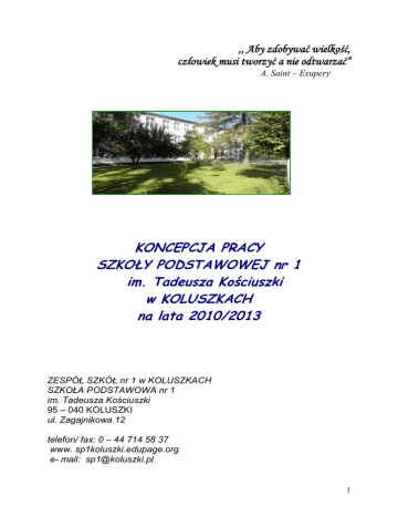 ,, Aby zdobywać wielkość, człowiek musi tworzyć a nie odtwarzać” A. Saint – Exupery KONCEPCJA PRACY SZKOŁY PODSTAWOWEJ nr 1 im. Tadeusza Kościuszki w KOLUSZKACH na lata 2010/2013 ZESPÓŁ SZKÓŁ nr 1 w KOLUSZKACH SZKOŁA PODSTAWOWA nr 1 im. Tadeusza Kościuszki 95 – 040 KOLUSZKI ul. Zagajnikowa 12 telefon/ fax: 0 – 44 714 58 37 www. sp1koluszki.edupage.org e- mail: [email protected] 1 INFORMACJE O SZKOLE ORGAN PROWADZĄCY SZKOŁĘ Urząd Miejski w Koluszkach ul. 11 Listopada 65 sposób obsługi finansowej: samodzielna księgowość ORGAN NADZORUJĄCY Łódzki Kurator Oświaty CHARAKTERYSTYKA SZKOŁY Rok założenia: 1961 Dyrektor Zespołu Szkół nr 1 w Koluszkach: Waldemar Siedlik Wicedyrektor: Anna Kropidłowska - Wieczorkiewicz status: szkoła publiczna liczba oddziałów: 16 liczba izb lekcyjnych: 11 ( łącznie z salą gimnastyczną) liczba uczniów: 359 ( 181 to uczniowie klas I – III ) liczba nauczycieli: 23 + 7 niepełnozatrudnionych personel pomocniczy: 15 ( w tym 4 palaczy zatrudnionych sezonowo) ♦ Koncepcja pracy szkoły Szkoła Podstawowa nr 1 im. Tadeusza Kościuszki w Koluszkach posiada wyraźnie określone i akceptowane przez nauczycieli, uczniów i rodziców cele i kierunki działania. Działalność szkoły jest zgodna z przyjętą przez radę pedagogiczną koncepcją pracy, która powstała w oparciu o rzetelną analizę mocnych i słabych stron szkoły, prognozy demograficzne oraz analizę szans i zagrożeń płynących ze środowiska. Koncepcja pracy szkoły jest zgodna z opracowaną przez wszystkie podmioty społeczności szkolnej wizją i misją szkoły, uwzględnia podstawy programowe i założenia rozporządzenia o nadzorze pedagogicznym. Nauczyciele, uczniowie i rodzice wiedzą, co szkoła chce osiągnąć i uczestniczą w realizacji wytyczonych celów. Koncepcja jest analizowania i poddawana modyfikacji. ♦ Zarządzanie i organizacja Szkoła dysponuje obiektami, pomieszczeniami i wyposażeniem, odpowiednimi do właściwego przebiegu procesu kształcenia, wychowania i opieki. Posiadamy: ◘ boisko sportowe ( oddane do użytku w 2009 r. w ramach programu ,,Blisko boisko” ) ◘ Gminne Centrum Edukacji Komunikacyjnej (oddane do użytku w roku 2010) 2 ◘ bibliotekę, z bogatym księgozbiorem ◘ szkoła dysponuje szerokopasmowym dostępem do Internetu DSL i posiadamy: pracownię komputerową otrzymaną w ramach projektu Pracownie internetowe w każdej szkole. Edycja 2007 - 13 stanowisk komputerowych Centrum Edukacji Multimedialnej - 4 stanowiska trzy pracownie multimedialne wyposażone w sprzęt audiowizualny ( projektory, ekrany, systemy nagłaśniające, tablicę interaktywną) dostęp do Internetu we wszystkich salach lekcyjnych, pokoju nauczycielskim i pomieszczeniach administracyjnych ◘ salą gimnastyczną, aulę do ćwiczeń i salkę do gimnastyki korekcyjnej. ◘ w godzinach 7.00 – 16. 00 działa świetlica ◘ w szkole jest stołówka ◘ uczniowie otoczeni są opieką pielęgniarską ◘ szkoła posiada nowocześnie wyposażony gabinet stomatologiczny Wyposażenie szkoły jest właściwie utrzymane i zapewnia uczniom, pracownikom oraz innym osobom przebywającym na jej terenie zdrowe, bezpieczne i higieniczne warunki nauki i pracy. Nauczyciele i pracownicy są przeszkoleni w zakresie bezpieczeństwa i higieny pracy. Dyrekcja systematycznie podejmuje skuteczne działania mające na celu wzbogacenie bazy dydaktycznej. Nauczyciele zatrudnieni w szkole zapewniają wysoki poziom pracy dydaktycznej, wychowawczej i opiekuńczej. Wszyscy nauczyciele ( 31 osób ) posiadają wymagane kwalifikacje. 22 osoby ukończyły dodatkowo studia podyplomowe. 12 nauczycieli ma uprawnienia do nauczania drugiego przedmiotu. Wszyscy członkowie rady pedagogicznej podejmują starania mające na celu uzyskanie kolejnych stopni awansu zawodowego. Obecnie pracuje 16 nauczycieli dyplomowanych, 9 mianowanych i 7 kontraktowych. Rozwój zawodowy jest związany z jakościowym rozwojem szkoły. W szkole realizuje się innowacje pedagogiczne i liczne projekty edukacyjne. Nauczyciele pracują zespołowo i są zaangażowani w ewaluację wewnętrzną . ♦ Kształcenie. Organizacja procesu kształcenia umożliwia realizację zadań szkoły i zmierza do jasno określonych celów ukierunkowanych na rozwój ucznia. Procesy edukacyjne są monitorowane i doskonalone. Metody pracy z uczniami są właściwie dobrane 3 i zróżnicowane. Programy nauczania są tak wybrane, aby zapewnić każdemu dziecku osiągnięcie postępów w nauce. W szkole analizuje się wyniki sprawdzianów wykorzystując różnorodne metody. Wnioski są wdrażane i przyczyniają się do wzrostu efektów kształcenia. Wyniki ostatniego sprawdzianu zewnętrznego plasują szkołę na poziomie wysokim. Średnia w szkole wyniosła 27 punktów ( OKE Łódź – 24,33 średnia w kraju – 24, 56 punktów ). Wymagania edukacyjne wobec uczniów są precyzyjnie określone i dostosowane do indywidualnych możliwości i predyspozycji dziecka. Uczniowie i rodzice znają i akceptują zasady oceniania, a informacja o postępach pomaga zaplanować indywidualny rozwój. Szkoła tworzy środowisko wspierające uczenie się. Stosujemy różnorodne formy pracy z uczniami o specyficznych potrzebach Oferta edukacyjna jest modyfikowana, wzbogacana i umożliwia rozwój zdolności i zainteresowań uczniów. ♦ Wychowanie i opieka. Działania wychowawcze podejmowane w szkole są spójne i adekwatne do potrzeb uczniów. Szkoła realizuje program wychowawczy i program profilaktyki uwzględniający między innymi: potrzeby wychowawcze uczniów, uniwersalne wartości, wychowanie patriotyczne, promocję postawy szacunku dla innych i samego siebie, samorządność uczniowską i formy pomocy psychologiczno – pedagogicznej. Szkoła zapewnia rozwój zainteresowań i szczególnych uzdolnień dzieci dając możliwość uczestniczenia w różnorodnych zajęciach pozalekcyjnych. Uczniowie są zachęcani do wysiłku i pracy nad sobą, a i