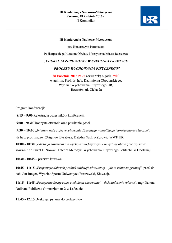 III Konferencja Naukowo-Metodyczna Rzeszów, 28 kwietnia 2016 r. II Komunikat III Konferencja Naukowo-Metodyczna pod Honorowym Patronatem Podkarpackiego Kuratora Oświaty i Prezydenta Miasta Rzeszowa „EDUKACJA ZDROWOTNA W SZKOLNEJ PRAKTYCE PROCESU WYCHOWANIA FIZYCZNEGO” 28 kwietnia 2016 roku (czwartek) o godz. 9:00 w auli im. Prof. dr. hab. Kazimierza Obodyńskiego, Wydział Wychowania Fizycznego UR, Rzeszów, ul. Cicha 2a Program konferencji: 8:15 – 9:00 Rejestracja uczestników konferencji. 9:00 – 9:30 Uroczyste otwarcie oraz powitanie gości. 9:30 – 10:00 „Intensywność zajęć wychowania fizycznego – implikacje teoretyczno-praktyczne”, dr hab. prof. nadzw. Zbigniew Barabasz, Katedra Nauk o Zdrowiu WWF UR 10:00 - 10:30 „Edukacja zdrowotna w wychowaniu fizycznym - uciążliwy obowiązek czy nowa szansa?” dr Paweł F. Nowak, Katedra Metodyki Wychowania Fizycznego Politechniki Opolskiej 10:30 - 10:45 – przerwa kawowa 10:45 - 11:15 „Propozycje dobrych praktyk edukacji zdrowotnej – jak to robią za granicą”, prof. dr hab. Jan Junger, Wydział Sportu Uniwersytet Preszowski, Słowacja. 11:15 - 11:45 „Praktyczne formy zajęć z edukacji zdrowotnej – doświadczenia własne”, mgr Danuta Duliban, Publiczne Gimnazjum nr 2 w Łańcucie. 11:45 - 12:15 Dyskusja, pytania do prelegentów. III Konferencja Naukowo-Metodyczna Rzeszów, 28 kwietnia 2016 r. II Komunikat Komitet Naukowy: prof. UR dr hab. Emilian Zadarko - przewodniczący (Katedra Nauk o Zdrowiu WWF UR) prof. dr hab. Wojciech Czarny (Dziekan Wydziału Wychowania Fizycznego UR) dr Paweł F. Nowak (Katedra Metodyki Wychowania Fizycznego, Politechnika Opolska) dr hab. prof. nadzw. Zbigniew Barabasz (Katedra Nauk o Zdrowiu WWF UR) prof. dr hab. Jan Junger (Wydział Sportu Uniwersytet Preszowski) dr hab. prof. nadzw. Mariusz Ozimek (Prodziekan Wydziału Wychowania Fizycznego i Sportu AWF Kraków) dr Maria Zadarko-Domaradzka (Katedra Nauk Biomedycznych WWF UR) dr Krzysztof Warchoł – prof. oświaty (Zespół Przedmiotowo - Dydaktyczny Metodyki Wychowania Fizycznego i Sportu WWF UR) mgr Ludwik Sobol (Dyrektor Wydziału Rozwoju Edukacji i Administracji Kuratorium Oświaty w Rzeszowie) Komitet Organizacyjny: Przewodnicząca: dr Maria Zadarko-Domaradzka (Katedra Nauk Biomedycznych WWF UR) [email protected] mgr Edyta Nizioł (Katedra Nauk o Zdrowiu WWF UR) studenci WWF UR – moduł „Trener Zdrowia” Sekretarze konferencji: dr Agata Rzeszutko-Polak (Katedra Nauk Biomedycznych WWF UR) [email protected] mgr Agnieszka Huzarska (Zakład Organizacji i Kształcenia „Europejczyk” WWF UR) [email protected] Współorganizatorzy: Stowarzyszenie Studentów i Absolwentów UR Klub Uczelniany AZS UR Sprawy różne: Koszty konferencji pokrywają organizatorzy. Uczestnicy przyjeżdżają na własny koszt. Po zakończeniu konferencji uczestnicy otrzymają imienny certyfikat uczestnictwa. Delegacje będzie można podbić w sekretariacie WWF - budynek konferencji, p. nr 04 (parter) Zgłoszenia na konferencję przyjmowane są do dnia 22.04.2016 r. Formularz zgłoszeniowy znajduje się pod adresem: http://goo.gl/forms/ryP5SsVVS3