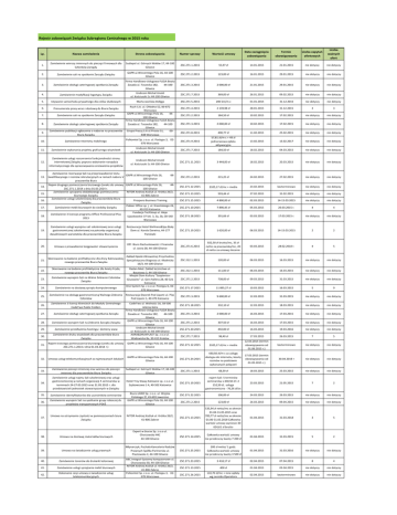 Rejestr zobowiązań Związku Subregionu Centralnego w 2015 roku Wartość umowy Data zaciągnięcia zobowiązania Termin obowiązywania Liczba zapytań ofertowych Liczba ważnych ofert ZSC.271.1.2015 55,97 zł 14.01.2015 21.01.2015 nie dotyczy nie dotyczy ZSC.271.2.2015 123,00 zł 16.01.2015 29.01.2015 nie dotyczy nie dotyczy Zamówienie obsługi cateringowej spotkania Zarządu Firma Handlowo-Usługowa FUZJA Beata Zasada ul. Toszecka 182, 44-100 Gliwice ZSC.271.3.2015 2 000,00 zł 21.01.2015 29.01.2015 nie dotyczy nie dotyczy 4. Zamówienie modyfikacji logotypu Związku Undicom Michał Unold ul. Kościuszki 1c 44-100 Gliwice ZSC.271.7.2015 369,00 zł 26.01.2015 09.02.2015 nie dotyczy nie dotyczy 5. Używanie samochodu prywatnego dla celów służbowych Marta Jasińska-Dołęga ZSC.271.5.2015 200 km/m-c 01.01.2015 31.12.2015 nie dotyczy nie dotyczy ZSC.271.4.2015 2 139,98 zł 28.01.2015 31.12.2015 3 3 ZSC.271.2.2015 184,50 zł 10.02.2015 17.02.2015 nie dotyczy nie dotyczy ZSC.271.3.2015 2 000,00 zł 10.02.2015 17.02.2015 nie dotyczy nie dotyczy ZSC.271.8.2015 490,77 zł 11.02.2015 25.02.2015 nie dotyczy nie dotyczy Lp. Nazwa zamówienia Strona zobowiązania Numer sprawy 1. Zamówienie wierszy imiennych do pieczęci firmowych dla Członków Zarządu Sudixpol ul. Górnych Wałów 17, 44-100 Gliwice 2. Zamówienie sali na spotkanie Zarządu Związku GAPR ul.Wincentego Pola 16, 44-100 Gliwice 3. 6. 7. 8. 9. Ruch S.A. ul. Chłodna 52, 00-872 Warszawa GAPR ul.Wincentego Pola 16, 44Zamówienie sali na spotkanie Zarządu Związku 100 Gliwice Firma Handlowo-Usługowa FUZJA Beata Zasada ul. Toszecka 182, 44-100 Zamówienie obsługi cateringowej spotkania Zarządu Gliwice Zamówienie publikacji ogłoszenia o naborze na pracownika Grupa Pracuj S.A ul.Prosta 51, 00Biura Związku 838 Warszawa Prenumerata prasy wraz z dostawą do Biura Związku 10. Zamówienie Internetu mobilnego Polkomtel Sp. z o.o. ul. Postępu 3, 02676 Warszawa ZSC.271.9.2015 13.02.2015 13.02.2017 nie dotyczy nie dotyczy 11. Zamówienie wykonania projektu graficznego wizytówek Undicom Michał Unold ul. Kościuszki 1c 44-100 Gliwice 57,81 zł/m-c + 49 zł jednorazowa opłata aktywacyjna ZSC.271.7.2015 184,50 zł 18.02.2015 04.03.2015 nie dotyczy nie dotyczy 12. Zamówienie usługi rozszerzenia funkcjonalności strony internetowej Związku poprzez wykonanie narzędzia informatycznego dla opracowywania zestawienia projektów Undicom Michał Unold ul. Kościuszki 1c 44-100 Gliwice ZSC.271.11.2015 3 444,00 zł 18.02.2015 20.03.2015 nie dotyczy nie dotyczy 13. Zamówienie rezerwacja Sali na przeprowadzenie testu GAPR ul.Wincentego Pola 16, kwalifikacynego i rozmów rekrutacyjnych w ramach naboru V 100 Gliwice pracownika Biura ZSC.271.2.2015 215,25 zł 24.02.2015 27.02.2015 nie dotyczy nie dotyczy ZSC.271.12.2015 2105,17 zł/mc + media 23.02.2015 bezterminowo nie dotyczy nie dotyczy ZSC.271.13.2015 503,44 zł 27.02.2015 31.02.2015 nie dotyczy nie dotyczy ZSC.271.15.2015 4 800,00 zł 02.03.2015 14-15.03.2015 nie dotyczy nie dotyczy ZSC.271.10.2015 7 890,45 zł 05.03.2015 26.03.2015 r. 4 4 ZSC.271.18.2015 391,66 zł 03.03.2015 17.03.2015 r. nie dotyczy nie dotyczy 14. 15. 16. 17. 18. 44- Najem drugiego pomieszczenia biurowego (aneks do umowy GAPR ul.Wincentego Pola 16, 44ZSC.271.1.2014 z dnia 01.03.2014 r. 100 Gliwice Zamówienie sprzątania dodatkowego pomieszczenia NITOR Andrzej Koźluk ul. Krótka 26/2, biurowego Związku 41-806 Zabrze Zamówienie usługi szkoleniowej dla pracowników Biura Prospero Business Training Związku Pokker Office sp. j. ul. Krasińskiego 24, Zamówienie mebli biurowych do siedziby Związku 40-019 Katowice Fundacja TechSoup ul. Aleje Zamówienie 3 licencje programu Office Professional Plus Ujazdowskie 37 lok. 3, 3a, 3b, 00-540 2013 Warszawa 19. Zamówienie usługi wynajmu sali szkoleniowej oraz usługi gastronomicznej szkoleniowej na potrzeby organizacji dwudniowych warsztatów dla pracowników Biura Związku Restauracja Hotel Wellness&Spa Biały Dom ul. Karola Darwina, 44-177 Paniówki ZSC.271.19.2015 1 620,00 zł 06.03.2015 14-15.03.2015 2 2 20. Umowa o prowadzenie księgowości stowarzyszenia OPI Biuro Rachunkowości i Finansów ul. Jasna 28, 44-100 Gliwice ZSC.271.6.2015 922,50 zł brutto/mc, 35 zł netto za pracownika/mc, 20 zł netto za umowę zlecenie 03.03.2015 28.02.2018 r. 4 5 Zakład Opieki Zdrowotnej Przychodnia Skierowanie na badanie profilaktyczne dla Anny Kalinowskiej, Specjalistyczna Diagnoza ul. Kłodnicka nowego pracownika Biura Związku 16/3, 44-100 Gliwice ZSC.212.1.2015 120,00 zł 06.03.2015 16.03.2015 nie dotyczy nie dotyczy ZSC.212.1.2015 111,00 zł 06.03.2015 16.03.2015 nie dotyczy nie dotyczy ZSC.271.2.2015 738,00 zł 09.03.2015 31.03.2015 nie dotyczy nie dotyczy ZSC.271.17.2015 11 895,27 zł 10.03.2015 16.03.2015 5 9 ZSC.271.3.2015 9 600,00 zł 12.03.2015 31.03.2015 nie dotyczy nie dotyczy 21. 22. Skierowanie na badanie profilaktyczne dla Anety Fryda, nowego pracownika Biura Związku 23. Zamówienie wynajem Sali na Walne Zebranie Członków Związku Radan-Med. Zakład lecznictwa ul. Basztowa 3, 44-100 Gliwice Miejski Dom Kultury "SzopieniceGiszowiec" ul. Gen.Hallera 28, 40-321 Katowice One System Sp. z o.o ul. Postępu 6, 02676 Warszawa 24. Zamówienie na dostawę sprzętu komputerowego 25. Zamówienie na obsługę gastronomiczną Walnego Zebrania Członków Restauracja Dworek Pod Lipami ul. Plac Pod Lipami 1, 40-476 Katowice 26. Zamówienie 3 licencji klienckich do Modułu Centralnego CodeTwo Public Folders 27. Zamówienie obsługi cateringowej spotkania Zarządu 28. Zamówienie wynajem Sali na Zebranie Zarządu Związku 29. Zamówienie przedłużenia hostingu i domeny www 30. Zamówienie druku wizytówek dla pracowników biura Związku CodeTwo ul. Wolności 16, 58-500 Jelenia Góra Firma Handlowo-Usługowa FUZJA Beata Zasada ul. Toszecka 182, 44-100 Gliwice GAPR ul.Wincentego Pola 16, 44-100 Gliwice Undicom Michał Unold ul. Kościuszki 1c 44-100 Gliwice AARA&DRUKPLAST Sp. z o.o ul. W