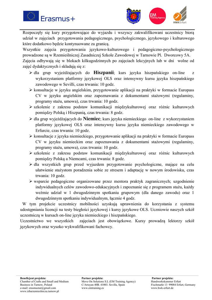 Rozpoczęły się kury przygotowujące do wyjazdu i wszyscy zakwalifikowani uczestnicy biorą udział w zajęciach przygotowania pedagogicznego, psychologicznego, językowego i kulturowego które dodatkowo będzie kontynuowane za granicą. Wszystkie zajęcia przygotowania językowo-kulturowego i pedagogiczno-psychologicznego prowadzone są w Rzemieślniczej Zasadniczej Szkole Zawodowej w Tarnowie Pl. Dworcowy 5A. Zajęcia odbywają się w blokach kilkugodzinnych po zajęciach lekcyjnych lub w dni wolne od zajęć dydaktycznych i składają się z: dla grup wyjeżdżających do Hiszpanii; kurs języka hiszpańskiego on-line z wykorzystaniem platformy językowej OLS oraz intensywny kursu języka hiszpańskiego zawodowego w Sevilli, czas trwania: 10 godz. konsultacje w języku angielskim, przygotowanie aplikacji na praktyki w formacie Europass CV w języku angielskim oraz zapoznawania z dokumentami stażowymi (regulaminy, programy stażu, umowa), czas trwania: 10 godz. szkolenie z zakresu podstaw komunikacji międzykulturowej oraz różnic kulturowych pomiędzy Polską i Hiszpanią, czas trwania: 8 godz. dla grup wyjeżdżających do Niemiec; kurs języka niemieckiego on-line z wykorzystaniem platformy językowej OLS oraz intensywny kursu języka niemieckiego zawodowego w Erfurcie, czas trwania: 10 godz. konsultacje z języka niemieckiego, przygotowanie aplikacji na praktyki w formacie Europass CV w języku niemieckim oraz zapoznawania z dokumentami stażowymi (regulaminy, programy stażu, umowa), czas trwania: 10 godz. szkolenie z zakresu podstaw komunikacji międzykulturowej oraz różnic kulturowych pomiędzy Polską a Niemcami, czas trwania: 8 godz. dla wszystkich grup przed wyjazdem przygotowanie psychologiczne, mające na celu ułatwienie stażystom poradzenia sobie ze stresem i adaptację w nowym środowisku, czas trwania: 10 godz. wsparcie pedagogiczne organizowane przez mentora praktyk zagranicznych; uzgodnienie indywidualnych celów zawodowo-edukacyjnych i zapoznanie się z programem stażu, każdy weźmie udział w 1 dwugodzinnym spotkaniu grupowym (dla danego zawodu) oraz 1 dwugodzinnym spotkaniu indywidualnym, łącznie 4 godz. W tym projekcie uczestnicy mobilności uzyskują uprawnienia do korzystania z systemu udostępniania licencji na testy biegłości językowej i kursy językowe OLS. Uczniowie naszych szkół uczestniczą w kursach on-line języka niemieckiego i hiszpańskiego. Uczestnictwo we wszystkich zajęciach jest obowiązkowe. Kursy prowadzą lektorzy szkół językowych oraz wysoko wykwalifikowani fachowcy. Beneficjent projektu: Chamber of Crafts and Small and Medium Business in Tarnow, Poland e-mail: [email protected] www.izbarzemieslnicza.tarnow.pl Partner projektu: Move On Solutions S.L (EM Training Agency) C/Arrayan 40B. 41003. Sevilla, Spain www.emtraining.es Partner projektu: Handwerkskammer Erfurt Fischmarkt 13 99084 Erfurt, Germany www.hwk-erfurt.de