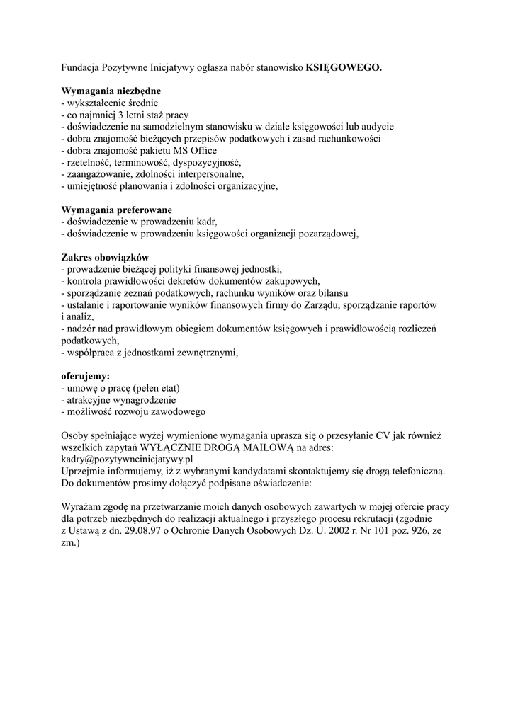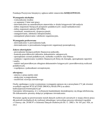 Fundacja Pozytywne Inicjatywy ogłasza nabór stanowisko KSIĘGOWEGO. Wymagania niezbędne - wykształcenie średnie - co najmniej 3 letni staż pracy - doświadczenie na samodzielnym stanowisku w dziale księgowości lub audycie - dobra znajomość bieżących przepisów podatkowych i zasad rachunkowości - dobra znajomość pakietu MS Office - rzetelność, terminowość, dyspozycyjność, - zaangażowanie, zdolności interpersonalne, - umiejętność planowania i zdolności organizacyjne, Wymagania preferowane - doświadczenie w prowadzeniu kadr, - doświadczenie w prowadzeniu księgowości organizacji pozarządowej, Zakres obowiązków - prowadzenie bieżącej polityki finansowej jednostki, - kontrola prawidłowości dekretów dokumentów zakupowych, - sporządzanie zeznań podatkowych, rachunku wyników oraz bilansu - ustalanie i raportowanie wyników finansowych firmy do Zarządu, sporządzanie raportów i analiz, - nadzór nad prawidłowym obiegiem dokumentów księgowych i prawidłowością rozliczeń podatkowych, - współpraca z jednostkami zewnętrznymi, oferujemy: - umowę o pracę (pełen etat) - atrakcyjne wynagrodzenie - możliwość rozwoju zawodowego Osoby spełniające wyżej wymienione wymagania uprasza się o przesyłanie CV jak również wszelkich zapytań WYŁĄCZNIE DROGĄ MAILOWĄ na adres: [email protected] Uprzejmie informujemy, iż z wybranymi kandydatami skontaktujemy się drogą telefoniczną. Do dokumentów prosimy dołączyć podpisane oświadczenie: Wyrażam zgodę na przetwarzanie moich danych osobowych zawartych w mojej ofercie pracy dla potrzeb niezbędnych do realizacji aktualnego i przyszłego procesu rekrutacji (zgodnie z Ustawą z dn. 29.08.97 o Ochronie Danych Osobowych Dz. U. 2002 r. Nr 101 poz. 926, ze zm.)