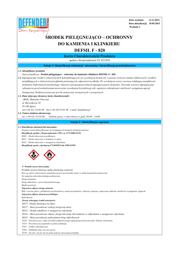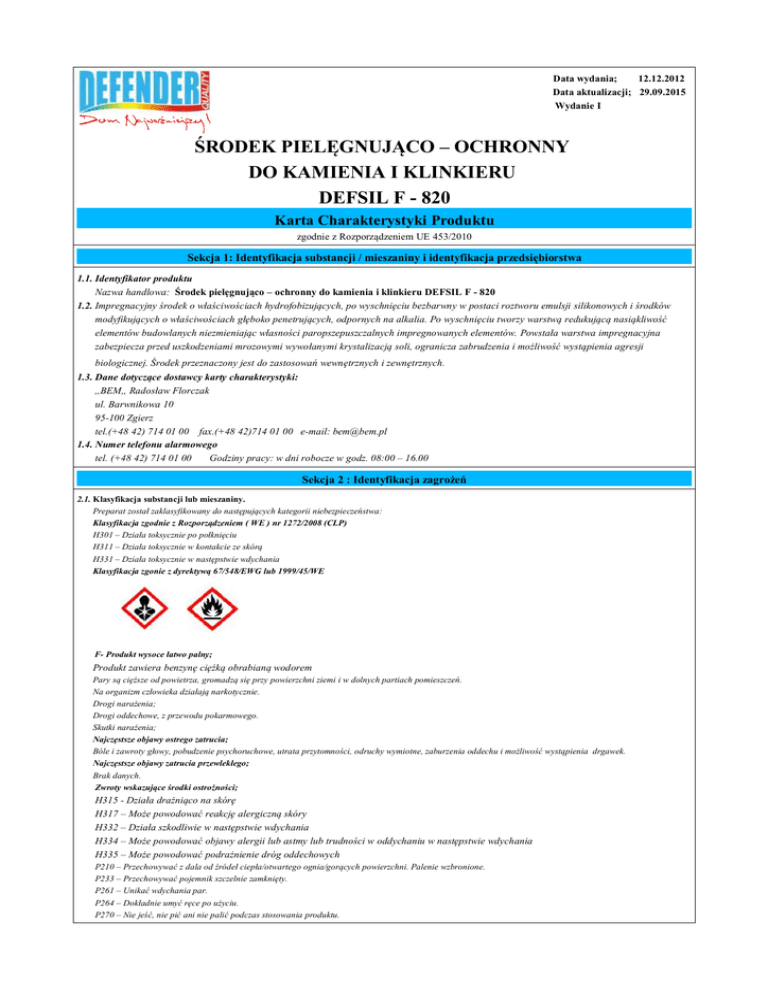 Data wydania; 12.12.2012 Data aktualizacji; 29.09.2015 Wydanie I ŚRODEK PIELĘGNUJĄCO – OCHRONNY DO KAMIENIA I KLINKIERU DEFSIL F - 820 Karta Charakterystyki Produktu zgodnie z Rozporządzeniem UE 453/2010 Sekcja 1: Identyfikacja substancji / mieszaniny i identyfikacja przedsiębiorstwa 1.1. Identyfikator produktu Nazwa handlowa: Środek pielęgnująco – ochronny do kamienia i klinkieru DEFSIL F - 820 1.2. Impregnacyjny środek o właściwościach hydrofobizujących, po wyschnięciu bezbarwny w postaci roztworu emulsji silikonowych i środków modyfikujących o właściwościach głęboko penetrujących, odpornych na alkalia. Po wyschnięciu tworzy warstwą redukującą nasiąkliwość elementów budowlanych niezmieniając własności paropszepuszczalnych impregnowanych elementów. Powstała warstwa impregnacyjna zabezpiecza przed uszkodzeniami mrozowymi wywołanymi krystalizacją soli, ogranicza zabrudzenia i możliwość wystąpienia agresji biologicznej. Środek przeznaczony jest do zastosowań wewnętrznych i zewnętrznych. 1.3. Dane dotyczące dostawcy karty charakterystyki: ,,BEM,, Radosław Florczak ul. Barwnikowa 10 95-100 Zgierz tel.(+48 42) 714 01 00 fax.(+48 42)714 01 00 e-mail: [email protected] 1.4. Numer telefonu alarmowego tel. (+48 42) 714 01 00 Godziny pracy: w dni robocze w godz. 08:00 – 16.00 Sekcja 2 : Identyfikacja zagrożeń 2.1. Klasyfikacja substancji lub mieszaniny. Preparat został zaklasyfikowany do następujących kategorii niebezpieczeństwa: Klasyfikacja zgodnie z Rozporządzeniem ( WE ) nr 1272/2008 (CLP) H301 – Działa toksycznie po połknięciu H311 – Działa toksycznie w kontakcie ze skórą H331 – Działa toksycznie w następstwie wdychania Klasyfikacja zgonie z dyrektywą 67/548/EWG lub 1999/45/WE F- Produkt wysoce łatwo palny; Produkt zawiera benzynę ciężką obrabianą wodorem Pary są cięższe od powietrza, gromadzą się przy powierzchni ziemi i w dolnych partiach pomieszczeń. Na organizm człowieka działają narkotycznie. Drogi narażenia; Drogi oddechowe, z przewodu pokarmowego. Skutki narażenia; Najczęstsze objawy ostrego zatrucia; Bóle i zawroty głowy, pobudzenie psychoruchowe, utrata przytomności, odruchy wymiotne, zaburzenia oddechu i możliwość wystąpienia drgawek. Najczęstsze objawy zatrucia przewlekłego; Brak danych. Zwroty wskazujące środki ostrożności; H315 - Działa drażniąco na skórę H317 – Może powodować reakcję alergiczną skóry H332 – Działa szkodliwie w następstwie wdychania H334 – Może powodować objawy alergii lub astmy lub trudności w oddychaniu w następstwie wdychania H335 – Może powodować podrażnienie dróg oddechowych P210 – Przechowywać z dala od źródeł ciepła/otwartego ognia/gorących powierzchni. Palenie wzbronione. P233 – Przechowywać pojemnik szczelnie zamknięty. P261 – Unikać wdychania par. P264 – Dokładnie umyć ręce po użyciu. P270 – Nie jeść, nie pić ani nie palić podczas stosowania produktu. P271 – Stosować na zewnątrz lub w dobrze wentylowanym pomieszczeniu. P280 – Stosować rękawice ochronne/ odzież ochronną/ochronę oczu/ ochronę twarzy. P301+P310 – W przypadku połknięcia; natychmiast skontaktować się z lekarzem lub ośrodkiem zatruć. P302+P352 – W przypadku dostania się na skórę;Natychmiast użyć dużą ilość wody z mydłem. P303+P361+P353 – W przypadku kontaktu ze skórą (lub włosami); Natychmiast usunąć/ zdjąć całą zanieczyszczoną odzież/spłukać skórę strumieniem wody/prysznicem. P304+P340 – W przypadku dostania się do dróg oddechowych; wyprowadzić lub wynieść poszkodowanego na świeże powietrze i zapewnić warunki do odpoczynku w pozycji umożliwiającej swobodne oddychanie. P330 – Wypłukać usta. P403+P233 – Przechowywać w dobrze wentylowanym miejscu. Przechowywać pojemnik szczelnie zamknięty. P405 – Przechowywać pod zamknięciem. P403+P235 – Przechowywać w dobrze wentylowanym miejscu. Przechowywać w chłodnym miejscu. P501 – Zawartość/ pojemnik usuwać do składowiska odpadów niebezpiecznych. 2.2. Inne zagrożenia Nie dotyczy. Sekcja 3: Skład/ informacja o składnikach 3.1. Skład Zawiera mieszaninę żywicy alkilosilikonowej z benzyną lakową. Składniki stwarzające zagrożenia; Nazwa identyfikująca Zawartość wagowa w% ( lub przedział ) Numer CAS Numer indeksowy Numer WE Klasyfikacja Benzyna lakowa > 70 < 80 64742-48-9 649-327-00-6 265-150-3 H319 H315 H335 Symbol kategorii niebezpieczeństwa Sekcja 4 : Środki pierwszej pomocy 4.1. Opis środków pierwszej pomocy; - po narażeniu przez drogi oddechowe osobę poszkodowaną wyprowadzić z miejsca narażenia, zapewnić ciepło i spokój, wezwać pomoc medyczną. W nagłych wypadkach podawać Tlen/ zastosować sztuczne oddychanie. - po kontakcie ze skórą poszkodowanego wyprowadzić z miejsca narażenia. Zdjąć skażoną odzież i obuwie. Spłukać skórę dużą ilością bieżącej wody z mydłem. Przy zmianach skórnych wezwać pomoc medyczną. - po kontakcie z oczami niezwłocznie płukać oczy dużą ilości chłodnej bieżącej wody przy podwiniętych powiekach przez co najmniej 15 minut. Usunąć szkła kontaktowe o ile nie przywarły do oczu. Zapewnić pomoc okulistyczna - po narażeniu przez przewód pokarmowy Nie prowokować do wymiotów, nie podawać mleka oraz tłuszczów. W razie duszności podawać tlen. W każdym przypadku połknięcia, konieczny jest transport karetką pogotowia do szpitala. Pokazywać opakowanie lub etykietę produktu. - uwagi We wszystkich przypadkach pojawienia się niepokojących objawów lub jakichkolwiek wątpliwości, należy zasięgnąć porady lekarza. - uwagi dla lekarza Odtrutki nie są znane. Sekcja 5 : Postępowanie w przypadku pożaru Zawiadomić otoczenie o pożarze. Usunąć z obszaru zagrożenia wszelkie osoby nie biorące udziału w likwidowaniu awarii. Wezwać Państwową Straż Pożarną – 998 i Policję – 997. Opary alkoholu strącać rozproszon