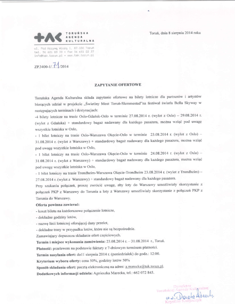 Toruiska Agenda Kulturalna sklaclazapltanie ofertowe na bilety lotnicze dla partner6w i afiyst6w