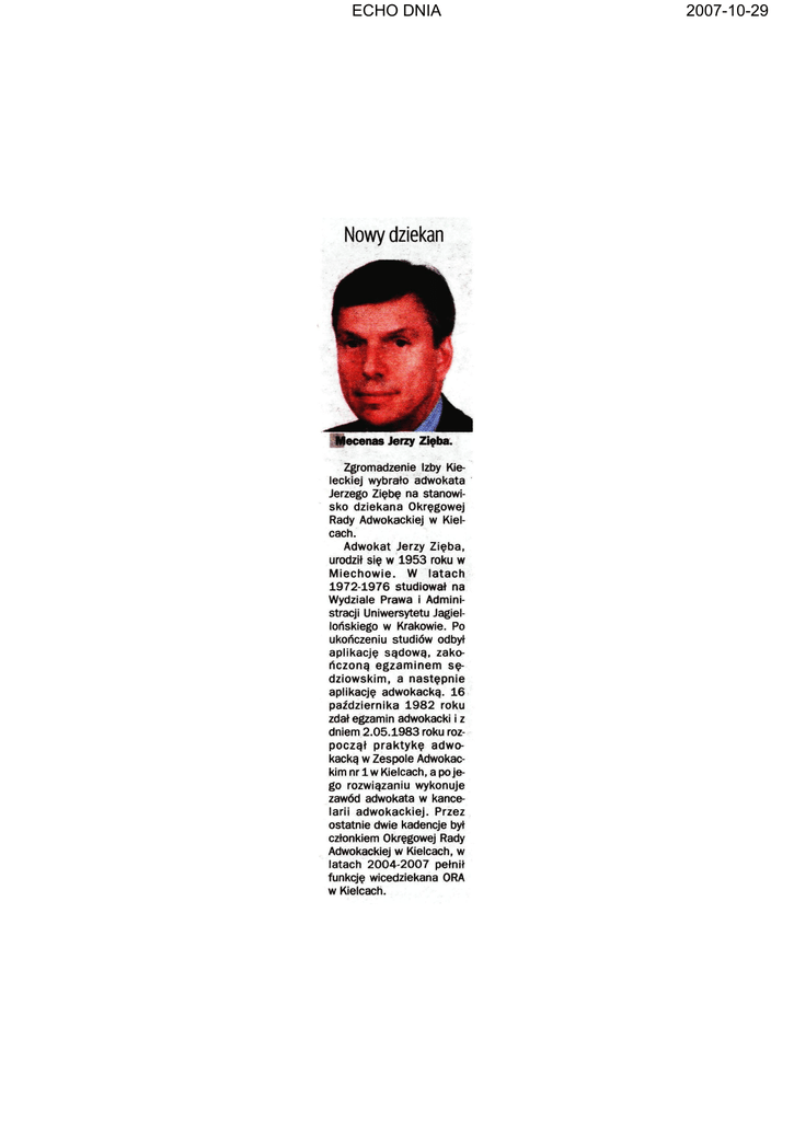 ECHO DNIA fecenas Jerzy Zięba. Zgromadzenie Izby Kie leckiej wybrało adwokata Jerzego Ziębę na stanowi sko dziekana Okręgowej Rady Adwokackiej w Kiel cach. Adwokat Jerzy Zięba, urodził się w 1953 roku w Miechowie. W latach 1972-1976 studiował na Wydziale Prawa i Admini stracji Uniwersytetu Jagiel lońskiego w Krakowie. Po ukończeniu studiów odbył aplikację sądową, zako ńczoną egzaminem sę dziowskim, a następnie aplikację adwokacką. 16 października 1982 roku zdał egzamin adwokacki i z dniem 2.05.1983 roku roz począł praktykę adwo kacką w Zespole Adwokac kim nr I w Kielcach, a po je go rozwiązaniu wykonuje zawód adwokata w kance larii adwokackiej. Przez ostatnie dwie kadencje był członkiem Okręgowej Rady Adwokackiej w Kielcach, w latach 2004-2007 pełnił funkcję wicedziekana ORA w Kielcach. 2007-10-29