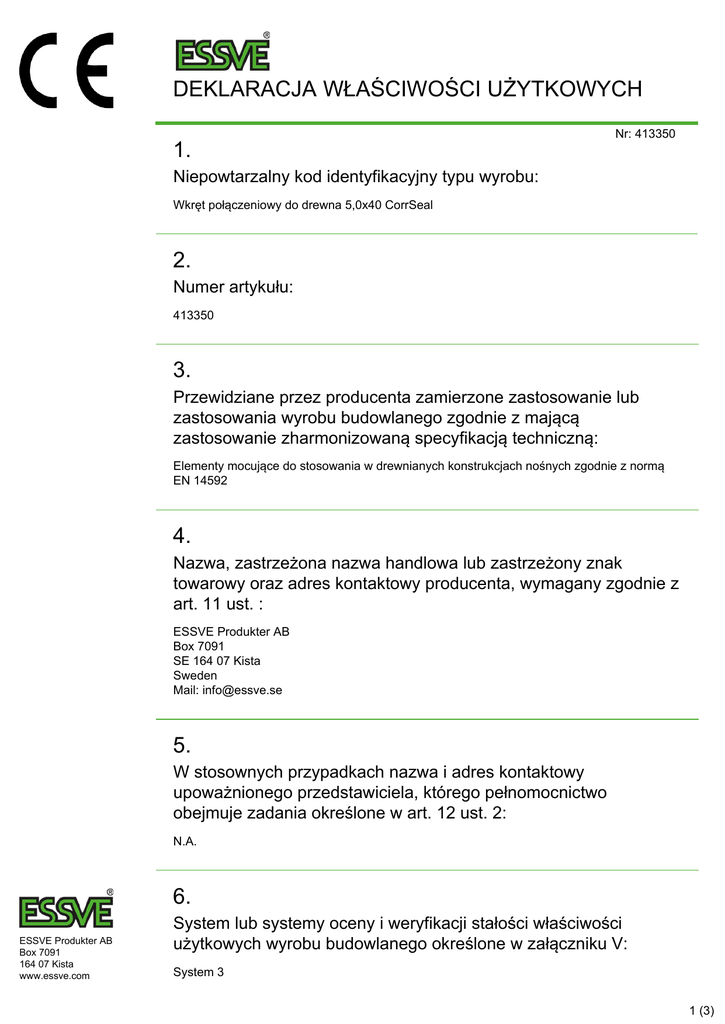 DEKLARACJA WŁAŚCIWOŚCI UŻYTKOWYCH 1. Nr: 413350 Niepowtarzalny kod identyfikacyjny typu wyrobu: Wkręt połączeniowy do drewna 5,0x40 CorrSeal 2. Numer artykułu: 413350 3. Przewidziane przez producenta zamierzone zastosowanie lub zastosowania wyrobu budowlanego zgodnie z mającą zastosowanie zharmonizowaną specyfikacją techniczną: Elementy mocujące do stosowania w drewnianych konstrukcjach nośnych zgodnie z normą EN 14592 4. Nazwa, zastrzeżona nazwa handlowa lub zastrzeżony znak towarowy oraz adres kontaktowy producenta, wymagany zgodnie z art. 11 ust. : ESSVE Produkter AB Box 7091 SE 164 07 Kista Sweden Mail: [email protected] 5. W stosownych przypadkach nazwa i adres kontaktowy upoważnionego przedstawiciela, którego pełnomocnictwo obejmuje zadania określone w art. 12 ust. 2: N.A. 6. ESSVE Produkter AB Box 7091 164 07 Kista www.essve.com System lub systemy oceny i weryfikacji stałości właściwości użytkowych wyrobu budowlanego określone w załączniku V: System 3 1 (3) DEKLARACJA WŁAŚCIWOŚCI UŻYTKOWYCH Nr: 413350 7. W przypadku deklaracji właściwości użytkowych dotyczącej wyrobu budowlanego objętego normą zharmonizowaną: STROJIRENSKY ZKUSEBNI USTAV s.p. NB 1015 przeprowadził(-a/-o): Wstępne Badanie Typu w systemie: 3 i wydał(-a/-o):Raport z badań 8. W przypadku deklaracji właściwości użytkowych dotyczącej wyrobu budowlanego, dla którego wydana została europejska ocena techniczna: N.A. wydał(-a/-o): na podstawie: przeprowadził(-a/-o): w systemie: i wydał(-a/-o): 9. Deklarowane właściwości użytkowe: Zasadnicze charakterystyki Właściwości użytkowe Zharmonizowana specyfikacja techniczna My,k [Nmm] 5500 EN 14592:2008, Tab. ZA 1 fax,k [N/mm2] loading across the fibre (ρk) 15,21 (350 kg/m3) EN 14592:2008, Tab. ZA 1 fhead,k [N/mm2] (ρk) 26,93 (350 kg/m3) EN 14592:2008, Tab. ZA 1 ftens,k [kN] 8.46 EN 14592:2008, Tab. ZA 1 Characteristic torsional ratio (ρk) 2,22 (450 kg/m3) EN 14592:2008, Tab. ZA 1 Durability (i.e. corrosion protection) Service class 3 acc. to EN 1995-1-1 EN 14592:2008, Tab. ZA 1 ESSVE Produkter AB Box 7091 164 07 Kista www.essve.com 2 (3) DEKLARACJA WŁAŚCIWOŚCI UŻYTKOWYCH Nr: 413350 10. Właściwości użytkowe wyrobu określone w pkt 1 i 2 są zgodne z właściwościami użytkowymi deklarowanymi w pkt 9. Niniejsza deklaracja właściwości użytkowych wydana zostaje na wyłączną odpowiedzialność producenta określonego w pkt 4. W imieniu producenta podpisał(-a): Viktor Bukowski, Product Developer/Technical expert – Fasteners (nazwisko i stanowisko) Kista 2016-12-14 (miejsce i data wydania) (podpis) ESSVE Produkter AB Box 7091 164 07 Kista www.essve.com 3 (3)