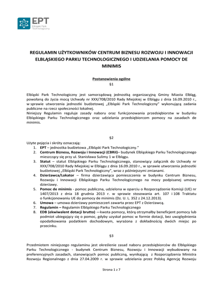 REGULAMIN UŻYTKOWNIKÓW CENTRUM BIZNESU ROZWOJU I INNOWACJI ELBLĄSKIEGO PARKU TECHNOLOGICZNEGO I UDZIELANIA POMOCY DE MINIMIS Postanowienia ogólne §1 Elbląski Park Technologiczny jest samorządową jednostką organizacyjną Gminy Miasta Elbląg, powołaną do życia mocą Uchwały nr XXX/708/2010 Rady Miejskiej w Elblągu z dnia 16.09.2010 r., w sprawie utworzenia jednostki budżetowej „Elbląski Park Technologiczny” wykonującą zadania publiczne na rzecz społeczności lokalnej. Niniejszy Regulamin reguluje zasady naboru oraz funkcjonowania przedsiębiorstw w budynku Elbląskiego Parku Technologicznego oraz udzielania przedsiębiorcom pomocy na zasadach de minimis. §2 Użyte pojęcia i skróty oznaczają: 1. EPT – jednostka budżetowa „Elbląski Park Technologiczny.” 2. Centrum Biznesu, Rozwoju i Innowacji (CBRiI)– budynek Elbląskiego Parku Technologicznego mieszczący się przy ul. Stanisława Sulimy 1 w Elblągu. 3. Statut – statut Elbląskiego Parku Technologicznego, stanowiący załącznik do Uchwały nr XXX/708/2010 Rady Miejskiej w Elblągu z dnia 16.09.2010 r., w sprawie utworzenia jednostki budżetowej „Elbląski Park Technologiczny”, wraz z późniejszymi zmianami. 4. Dzierżawca/Lokator – firma dzierżawiąca pomieszczenia w budynku Centrum Biznesu, Rozwoju i Innowacji Elbląskiego Parku Technologicznego na mocy podpisanej umowy dzierżawy. 5. Pomoc de minimis - pomoc publiczna, udzielona w oparciu o Rozporządzenie Komisji (UE) nr 1407/2013 z dnia 18 grudnia 2013 r. w sprawie stosowania art. 107 i 108 Traktatu o funkcjonowaniu UE do pomocy de minimis (Dz. U. L. 352 z 24.12.2013). 6. Umowa – umowa dzierżawy pomieszczeń zawarta przez EPT z Dzierżawcą. 7. Regulamin – Regulamin Elbląskiego Parku Technologicznego 8. EDB (ekwiwalent dotacji brutto) —kwota pomocy, którą otrzymałby beneficjent pomocy lub podmiot ubiegający się o pomoc, gdyby uzyskał pomoc w formie dotacji, bez uwzględnienia opodatkowania podatkiem dochodowym, wyrażona z dokładnością dwóch miejsc po przecinku. §3 Przedmiotem niniejszego regulaminu jest określenie zasad naboru przedsiębiorców do Elbląskiego Parku Technologicznego - budynek Centrum Biznesu, Rozwoju i Innowacji wybudowany na preferencyjnych zasadach, stanowiących pomoc publiczną, wynikającą z Rozporządzenia Ministra Rozwoju Regionalnego z dnia 27.04.2009 r. w sprawie udzielania przez Polską Agencję Rozwoju Strona 1 z 7 Przedsiębiorczości pomocy finansowej na rozwój ośrodków innowacyjności w ramach Programu Operacyjnego Rozwój Polski Wschodniej 2007 – 2013 ( Dz. U. Nr 70, poz. 604 z poźn. zm.). §4 Regulamin dotyczy wszystkich przedsiębiorców podejmujących i prowadzących działalność gospodarczą na terenie budynku Centrum Biznesu, Rozwoju i Innowacji Elbląskiego Parku Technologicznego z wyłączeniem przedsiębiorców rozpoczynających działalność w Inkubatorze Przedsiębiorczości, których zasady działania określa odrębny regulamin. §5 O dzierżawę pomieszczeń w budynku Elbląskiego Parku Technologicznego w pierwszej kolejności mogą się ubiegać firmy prowadzące działalność gospodarczą. Przedsiębiorcy, którzy rozpoczynają działalność gospodarczą mogą skorzystać z usług Inkubatora Przedsiębiorczości na zasadach określonych w odrębnym regulaminie. §6 Przedmiotem działalności EPT jest realizacja zadań związanych z poprawą warunków dla prowadzenia działalności gospodarczej poprzez rozwój i dyfuzję przedsięwzięć innowacyjnych. W ramach swojej działalności EPT oferuje usługi w zakresie: 1. wykonywania badań i analiz technicznych, 2. dzierżawy pomieszczeń dla celów prowadzenia badań naukowych, prac rozwojowych i działalności innowacyjnej, 3. dzierżawy pomieszczeń biurowo-usługowych, warsztatowo-magazynowych, laboratoryjnych, 4. inkubacji przedsiębiorstw, 5. wynajmu sal konferencyjno-szkoleniowych wraz z wyposażeniem oraz dzierżawy powierzchni wystawienniczo-reklamowej, 6. doradztwa, szkolenia przedsiębiorców i kadry naukowej, 7. organizacji konferencji, seminariów, szkoleń i spotkań biznesowych. Zasady naboru do EPT na warunkach preferencyjnych §7 1. W budynku EPT działalność na zasadach preferencyjnych mogą prowadzić przedsiębiorcy reprezentujący przedsiębiorstwa: posiadający status mikro, małego lub średniego przedsiębiorstwa, prowadzące działalność badawczą, rozwojową lub innowacyjną, z potencjałem rozwojowym wdrażający lub planujący wdrożenie innowacyjnych rozwiązań do prowadzonej działalności, posiadający status mikro, małego lub średniego przedsiębiorstwa, nie będący w stanie upadłości lub likwidacji. 2. Preferowane w EPT są branże, których działalność jest innowacyjna i ściśle związana z Ochroną Środowiska (w tym Środowiska Pracy), Technologiami Informatycznymi i Telekomunikacyjnymi, Metalurgią i Metaloznawstwem, Technologiami Drewna i Mebli oraz Strona 2 z 7 3. 4. 5. 6. 7. firmy działające w obszarze inteligentnych specjalizacji Województwa Warmińsko – Mazurskiego tj. ekonomia wody, meblarstwo, żywność wysokiej jakości. Poziom udzielanej pomocy de minimis odbywać się będzie w wysokości: I rok umowy – 50% stawki rynkowej II rok umowy – 40% stawki rynkowej III rok umowy – 30% stawki rynkowej IV rok umowy - przejście na stawkę rynkową V rok umowy - stawka rynkowa Przedsiębiorcy korzystający z usług EPT na zasadach preferencyjnych muszą być uprawnieni do otrzymania pomocy de minimis, tj. w roku kalendarzowym w którym pomoc za zostać przyznana i w ciągu dwóch poprzedzających go lat nie otrzymali pomocy de minimis lub wartość otrzymanej w tym okresie pomocy de minimis łącznie z przyznaną przez EPT nie przekroczy 200 tys. Euro. W przypadku gdy wartość pomocy de minimis, która została Dzierżawcy do wykorzystania, zostanie wyczerpana, preferencyjna stawka czynszu dzierżawnego ulega podwyższeniu do aktualnie obowiązującej 